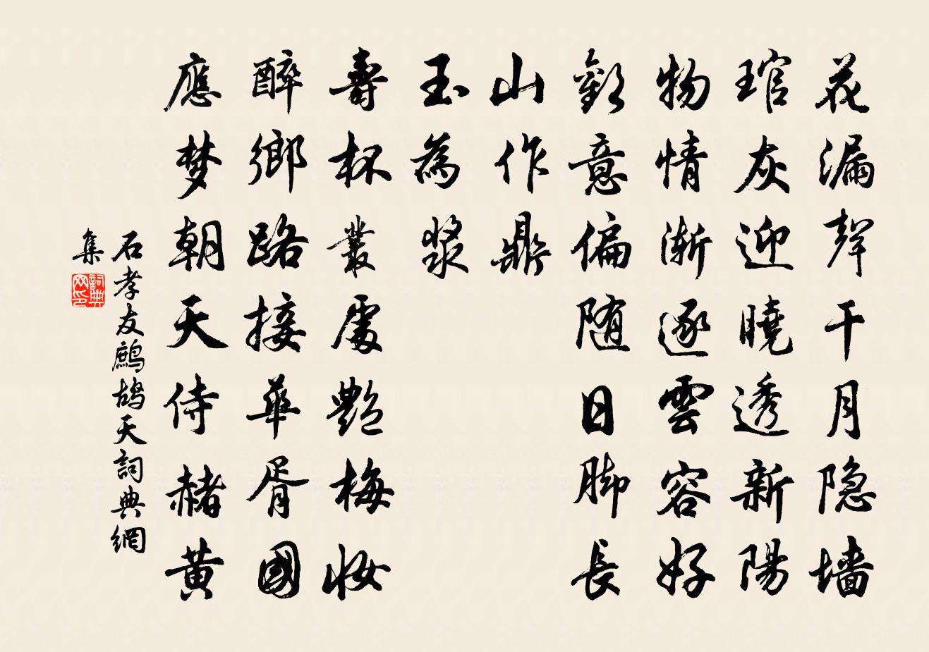 詩詞名句歷史字典書法欣賞書法字典國語詞典說文解字康熙字典古漢語字典標 題 作 者 詩 句 鷓鴣天作者:石孝友 朝代:宋代鷓鴣天原文花漏聲乾月隱牆。琯灰迎曉透新陽。物情漸逐雲容好,歡意偏隨日腳長。山作鼎,玉為漿。壽杯叢處艷梅妝。醉鄉路接華胥國,應夢朝天侍赭黃。詩詞問答問:鷓鴣天的作者是誰?答:石孝友問:鷓鴣天寫於哪個朝代?答:宋代石孝友鷓鴣天書法欣賞鷓鴣天書法作品詩詞推薦張良徐鈞〔宋代〕博浪椎揮四海驚,虎狼雖暴已無秦。興劉滅項猶餘事,豈是蕭韓行輩人。金陵府舍重建金山亭二首蘇頌〔宋代〕地出城隅辟故台,斬茅刪竹受良材。春塘夢草成詩後,畫棟飛雲式燕開。一境山形天際望,四時風物坐中來。府公綺寮怨(宮人斜弔古)石正倫〔宋代〕綠野春濃停騎,暖風飄醉襟。漸觸目、景物淒悲,花無語、曲徑沈沈。重檐繚垣靜鎖,丹青暗、斷軸塵半侵。嘆絳季允用韻各賦兩章予亦再賦四首李壁〔宋代〕碧瓦城中一萬間,溜渠無處不潺潺。鳧眠落日沙留篆,魚蹙輕冰玉破環。細草爭春空滿路,孤雲未雨莫歸山。寓言偶題(一作鄭遨詩)杜光庭〔唐代〕似鶴如雲一個身,不憂家國不憂貧。擬將枕上日高睡,賣與世間榮貴人。過靜林寺用琳老韻作四絕句毛滂〔宋代〕橙花亦娟娟,照水弄清白。孤香少人知,黃蜂自為客。鉛山廟宇題壁劉學箕〔宋代〕莫遣離愁相絆縈,九州之外盡愁城。酒頻挹注幽尤浣,詩苦冥搜太瘦生。漠漠草茵習蛺蝶,深深柳幄韻鸝鶊。客懷至節後猶未見梅疑旱使然趙蕃〔宋代〕敗砌初無菊,空林合有梅。如何長至後,不見一枝開。豈是春渝信,端緣旱作災。蔬畦與麥壠,滿目但黃埃。送王教授之官臨邛魏了翁〔宋代〕剩喜人從義理趨,卻憂末羽墮浮虛。未通經術先談傳,只送人言不識渠。偶向檐頭覓桃李,徑從紙上索鳶魚。君今滿江紅 夜雨涼甚,忽動從戎之興劉克莊〔宋代〕金甲雕戈,記當日、轅門初立。磨盾鼻、一揮千紙,龍蛇猶濕。鐵馬曉嘶營壁冷,樓船夜渡風濤急。有誰憐、猿臂贈張聽聲晁公溯〔宋代〕論士平生妙和神,是誰無此耳輪囷。喚鍾作瓮皆堪笑,自是渠儂聽不真。秋晚滕岑〔宋代〕槭槭霜風勁,駸駸物象彫。屢遷憐蟋蟀,一敗笑芭蕉。林葉疏逾響,山雲薄易消。雖無遠行役,對此亦何聊。梅仙壇況志寧〔宋代〕上疏歸來事可歡,嶺頭誰為築星壇。先生不食炎劉祿,自拾松花當晚餐。蝶戀花蘇軾〔宋代〕雨後春容清更麗。只有離人,幽恨終難洗。北固山前三面水。碧瓊梳擁青螺髻。一紙鄉書來萬里。問我何年,真箇題淨梵院清虛堂俞烈〔宋代〕天清蠶麥余,綠結桃李實。老僧詩銜袖,過我語言質。懷山意先行,如病夢芝術。去□才一舍,鞭策不終日。堂筵郊意境格二首釋普聞〔宋代〕十里沙堤水滿湖,著霜牙冷未全枯。曉來細雨藏鷗鷺,何處人間有畫圖。嘗茶齊己〔唐代〕石屋晚煙生,松窗鐵碾聲。因留來客試,共說寄僧名。味擊詩魔亂,香搜睡思輕。春風霅川上,憶傍綠叢行。題童宰盤隱張煒〔宋代〕才了花陰入要塗,暫時歸去友樵漁。遠山數筆意不盡,流水一泓清有餘。我輩愛吟懷退步,誰人得計肯閒居。古梅答令狐士曹、獨孤兵曹聯騎暮歸望山見寄韋應物〔唐代〕共愛青山住近南,行牽吏役背雙驂。枉書獨宿對流水,遙羨歸時滿夕嵐。瑞鷓鴣李夫人〔宋代〕新晴庭院暑風輕。瑞氣朝來特地清。霞帔羽衣筠竹杖,萱堂真有壽星明。自來忠孝傳家世,所以芝蘭滿戶庭。簪笏名句推薦弱冠弄柔翰,卓犖觀群書。左思《詠史八首·其一》 斟酌乎質文之間,而隱括乎雅俗之際,可與言通變矣。劉勰《文心雕龍·通變》 馬上相逢無紙筆,憑君傳語報平安。岑參《逢入京使》 煙開蘭葉香風暖,岸夾桃花錦浪生。李白《鸚鵡洲》 出耒在明晨,山寒易霜霰。王守仁《謫居糧絕請學於農將田南山詠言寄懷》 不經一番寒徹骨,怎得梅花撲鼻香。黃櫱禪師《上堂開示頌》 樹曲木者,惡得直景劉向《說苑·君道》 寧做太平犬,莫做離亂人!佚名《增廣賢文·下集》 將軍發白馬,旌節度黃河。李白《發白馬》 天地玄黃,宇宙洪荒。周興嗣《千字文·全文》