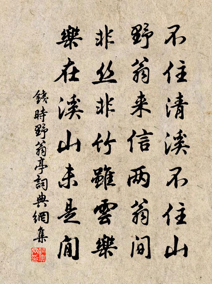 詩詞名句歷史字典書法欣賞書法字典國語詞典說文解字康熙字典古漢語字典標 題 作 者 詩 句 野翁亭作者:錢時 朝代:宋代野翁亭原文不住清溪不住山,野翁來信兩翁間。非絲非竹雖雲樂,樂在溪山未是閒。詩詞問答問:野翁亭的作者是誰?答:錢時問:野翁亭寫於哪個朝代?答:宋代錢時野翁亭書法欣賞野翁亭書法作品詩詞推薦高帝徐鈞〔宋代〕土能生物有深功,金價何如可與同。不是君王無識別,只緣得土笑談中。送高湘及第後東歸覲叔劉得仁〔唐代〕此去幾般榮,登科鼎足名。無慚入南巷,高價聳東京。窗對嵩山碧,庭來洛水聲。門前桃李樹,一徑已陰成。人月圓楊無咎〔宋代〕風和日蒲余煙嫩,測測透鮫綃。相逢且喜,人圓玳席,月滿丹霄。爛游勝賞,高低燈火,鼎沸笙簫。一年三百六十酹江月 過淮陰薩都剌〔元代〕短衣瘦馬,望楚天空闊,碧雲林杪。野水孤城斜日裡,猶憶那回曾到。古木鴉啼,紙灰風起,飛入淮陰廟。椎牛釃遇便風陳舜俞〔宋代〕舳艫泝隋堤,積潦涵楚甸。大帆掛長檣,薰飈借良便。氣張中軍旗,勢疾強弩箭。浪頭噴飛雪,波心落流電。或如寄雪竇千峰琬西堂釋如珙〔宋代〕千丈崖根芋火香,天上日輪正卓午。東土西乾無祖師,白頭老僧七十五。寄父王氏〔宋代〕西風不入小窗紗,秋氣應鄰我憶家。極目江南千里恨,依然如淚看黃花。水旱吟邵雍〔宋代〕九年洪水,七年大旱。非堯與湯,民死過半。吟社遞至詩卷足十四韻以答之為梅水村發也趙必象〔宋代〕懷哉丈人行,四海空交遊。桃李不識面,一生慕荊州。聞誦《法華經》歌修雅〔唐代〕山色沈沈,松煙冪冪。空林之下,盤陀之石。石上有僧,結跏橫膝。誦白蓮經,從旦至夕。左之右之,虎跡狼跡。和總管姜知閣虞儔〔宋代〕五筆梅山漫不休,詩筒倏寄置書郵。分符我亦慚銅虎,問俗人誰忍佩牛。已洗圜扉亡久系,更教彩棒息群偷。年來雜詩二十七首曹勛〔宋代〕此生擾擾事無窮,脫得閒身石火中。聊種柴桑三徑菊,未輸嚴瀨一絲風。送雲卿上人游安南(一作送僧游南海)李洞〔唐代〕春往海南邊,秋聞半夜蟬。鯨吞洗缽水,犀觸點燈船。島嶼分諸國,星河共一天。長安卻回日,松偃舊房前。香積廚法文釋印肅〔宋代〕咦,好辨心,以此三法為三昧,無量無邊世不會。我今修供佛眾生,萬聖千賢悉同共。摩訶般若味真如,十波羅蜜郊外即事七首袁燮〔宋代〕清香忽向暗中來。應為梅花取次開。愛汝風標真絕俗,何當環繞百千回。候仙詞施肩吾〔唐代〕西歸公子何時降,南嶽先生早晚來。巡歷世間猶未遍,乞求鸞鶴且裴回。齋中雜題陸游〔宋代〕列屋娥眉不足夸,可齋別自是生涯。閒將西蜀團窠錦,自背南唐落墨花。晚秋一首蘇籀〔宋代〕曩間夏曆標花候,粗爾陶巾漉酒卮。仿擬塵編談世諦,何人才刃趁時機。七用喜雨韻三首吳潛〔宋代〕闌乾小倚望遙岑,晚霽朝朝換午陰。越鶩已收天外影,吳鳩尚帶雨中音。海瀕客子秋銜袖,塞上征人夜拊砧。都是浣溪沙·二月和風到碧城晏幾道〔宋代〕二月和風到碧城。萬條千縷綠相迎。舞煙眠雨過清明。妝鏡巧眉偷葉樣,歌樓妍曲借枝名。晚秋霜霰莫無情。名句推薦掩妾淚,聽君歌。李白《夜坐吟》 送數聲驚雁,下離煙水,嘹唳度寒雲。孔夷《南浦·旅懷》 遠夢歸侵曉,家書到隔年。杜牧《旅宿》 琵琶弦上說相思。當時明月在,曾照彩雲歸。晏幾道《臨江仙·夢後樓台高鎖》 閒來無事不從容,睡覺東窗日已紅。程顥《秋日》 願我如星君如月,夜夜流光相皎潔。范成大《車遙遙篇》 不枉東風吹客淚。相思難表,夢魂無據,惟有歸來是。歐陽修《青玉案·一年春事都來幾》 山檣谷塹依然在,弱吐強吞盡已空。杜牧《題武關》 雙眼自將秋水洗,一生不受古人欺。袁枚《隨園詩話·補遺 卷三》 日邊訊息空沈沈。畫眉樓上愁登臨。鄭文妻《憶秦娥·花深深》