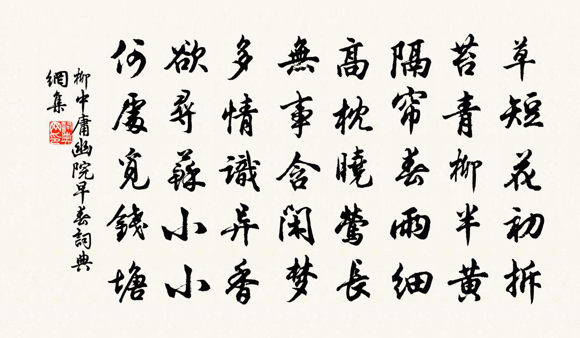 詩詞名句歷史字典書法欣賞書法字典國語詞典說文解字康熙字典古漢語字典標 題 作 者 詩 句 幽院早春作者:柳中庸 朝代:唐代幽院早春原文草短花初拆,苔青柳半黃。隔簾春雨細,高枕曉鶯長。無事含閒夢,多情識異香。欲尋蘇小小,何處覓錢塘。詩詞問答問:幽院早春的作者是誰?答:柳中庸問:幽院早春寫於哪個朝代?答:唐代問:幽院早春是什麼體裁?答:五律柳中庸幽院早春書法欣賞幽院早春書法作品注釋全唐詩:卷257_10詩詞推薦離京後作七首張耒〔宋代〕高槐老柳舞南風,晴日家家蠶麥中。芟盡黃雲見原隰,卻教風雨洗長空。贈林粹許應龍〔宋代〕元是清都紫府仙,出為名世應半千。發矢兩科俱中的,英名煊赫斗橫天。鄞水富沙典芹泮,黜浮崇雅文風煥。沙陽春和初遷坐堂中陸游〔宋代〕九月天始霜,澤中多烈風。東廂尋丈地,聊以安我躬。薪炭南山來,地爐晨暮紅。二月春始和,始蟲思舊螫。早堂沁園春 贈括蒼張希微號幾庵李道純〔元代〕不識不知,無聲無臭,名曰希微。只道個便是,全真妙本,人能透得,即刻知幾。聞法聞經,說禪說道,執象泥文書李學士北使集後梅堯臣〔宋代〕蘇武艱窮只四篇,五言風格到今傳。節旄零落都無詠,枉在胡中十九年。菩薩蠻梅窗〔宋代〕折來初步東溪月。月溪東步初來折。香處是瑤芳。芳瑤是處香。蘚花浮暈淺。淺暈浮花蘚。清對一枝瓶。瓶枝一對和徐子蒼揚州夢梅陳杰〔宋代〕林昏月落淮南夜,還憶江清水見沙。冰雪為魂玉在側,了知不是夢梨花。宮詞楊皇后〔宋代〕剪剪輕風二月天,柳絲飄颺倍堪憐。靜憑雕檻渾無事,細數穿花燕影偏。送新安張尉乞侍養歸淮甸梅堯臣〔宋代〕天兵出塞日,西尉去官初。卻衣老萊服,曾無梅福書。春郊欲回雁,寒水正沈魚。任意歸舟駛,風煙亦自如。峽路山行即事十首袁說友〔宋代〕浩蕩東風晚更嚴,黃埃得得上霜髯。細題今日山中景,更有前頭萬點尖。唐大饗拜洛樂章昭和武則天〔唐代〕舒雲致養,合大資生。德以恆固,功由永貞。升歌薦序,垂幣翹誠。虹開玉照,鳳引金聲。偶詠不才明主棄多病故人疏之句感孟浩然事作趙蕃〔宋代〕吾評孟浩然,雅意作詩人。死經四百載,賦詩名愈新。爵祿豈不賞,不義寧賤貧。身雖遭放還,未必非得亡。留滯劉學箕〔宋代〕何期蹤跡又遲留,行止於人自不由。夢境固知空似蟻,生涯卻笑拙於鳩。碧涵一鏡晴天闊,翠擁千峰宿雨收。從此宮中行樂詞其七李白〔唐代〕寒雪梅中盡。春風柳上歸。宮鶯嬌欲醉。檐燕語還飛。遲日明歌席。新花 * 衣。晚來移彩仗。行樂泥光輝。宿僊霞嶺下陸游〔宋代〕吾生真是一枯蓬,行遍人間路未窮。暫聽朝雞雙闕下,又騎羸馬萬山中。重裘不敵晨霜力,老木爭號夜谷風。切勿遷居對雨有感張耒〔宋代〕楚鄉風物淡悠悠,獨掩閒門客滯留,盡日無言對秋雨,相敲蕉葉各吟秋。贈別營妓卿卿油蔚〔唐代〕憐君無那是多情,枕上相看直到明。日照綠窗人去住,鴉啼紅粉淚縱橫。愁腸只向金閨斷,白髮應從玉塞生。為報三吳漫遊集唐方鳳〔宋代〕塞上風雲接地陰,萬方多難此登臨。坐中有老沙場客,霄漢長懸捧日心。詠旱三首曾幾〔宋代〕春雨接梅雨,便有水潦憂。乞晴今幾日,又似憫雨求。田苗雖向槁,尚冀什一收。政恐穫稻月,沛淫不能休。病起荊江亭即事十首黃庭堅〔宋代〕死者已死黃霧中,三事不數兩蘇公。豈謂高才難駕御,空歸萬裏白頭翁。名句推薦葉落當歸根,雲沉久必起。錢嶫《憫黎詠》 日月照之何不及此?惟有北風號怒天上來。李白《北風行》 報導山中去,歸時每日斜皎然《尋陸鴻漸不遇》 撥雲尋古道,倚石聽流泉。李白《尋雍尊師隱居》 步轉迴廊,半落梅花婉娩香。蘇軾《減字木蘭花·春月》 送數聲驚雁,下離煙水,嘹唳度寒雲。孔夷《南浦·旅懷》 扶桑已在渺茫中,家在扶桑東更東。韋莊《送日本國僧敬龍歸》 人刑者非人也,罰人者非罰也。來俊臣《羅織經·刑罰卷第十一》 各照隅隙,鮮觀衢路。姚察、姚思廉《梁書·列傳·卷五十》 湖山信是東南美,一望彌千里蘇軾《虞美人·有美堂贈述古》
