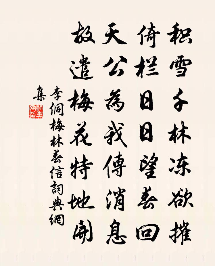 詩詞名句歷史字典書法欣賞書法字典國語詞典說文解字康熙字典古漢語字典標 題 作 者 詩 句 梅林春信作者:李侗 朝代:宋代梅林春信原文積雪千林凍欲摧,倚欄日日望春回。天公為我傳訊息,故遣梅花特地開。詩詞問答問:梅林春信的作者是誰?答:李侗問:梅林春信寫於哪個朝代?答:宋代李侗梅林春信書法欣賞梅林春信書法作品詩詞推薦贈鄭曼季詩四首 南衡陸雲〔魏晉〕一南衡惟岳。峻極昊蒼。瞻彼江湘。惟水泱泱。清和有合。俊乂以藏。天保定爾。茂以瓊光。景秀濛汜。穎逸扶桑最高樓(催春)蔣捷〔宋代〕新春景,明媚在何時。宜早不宜遲。軟塵巷陌青油幰,重簾深院畫羅衣。要些兒,晴日照,暖風吹。一片片、雪兒奉答李和甫代簡二絕句黃庭堅〔宋代〕夢中往事隨心見,配里繁華亂眼生。長為風流惱人病,不如天性總無情。簡徐宰方岳〔宋代〕雨外茅茨黃葉村,老農相語一燈昏。山深未識新官姓,但說無人夜打門。會使帥郭侯燕於採石吳芾〔宋代〕高牙大纛拂層雲,樽酒相逢楚水濱。千里江山俱入眠,一天風月解留人。橫吹玉笛漁船晚,醉擁金釵綺席春。此地虞美人(送兄益章赴會試)吳儆〔宋代〕銀屏一夜金風細。便作中秋意。碧天如水月如眉。已有徵鴻摩月、向南飛。金尊滿酌蟾宮客。莫促陽關拍。須知丹春晚看群公朝還人為八韻陳子良〔唐代〕遊子惜春暮,策杖出蒿萊。正直康莊晚,群公謁帝回。履度南宮至,車從北闕來。珂影傍明月,笳聲動落梅。迎風五月一日同子瞻轉對蘇轍〔宋代〕羸病不堪金束腰,永懷江海舊漁樵。對床貪聽連宵雨,奏事驚同朔旦朝。大耿功名元自異,中茅服食舊相要。一封下沱張西叔牡丹號奇品以詩寄花因用韻謝陽枋〔宋代〕天香吹落五雲來,滿眼浮花只浪開。國色不關朝得酒,妝檯漫飲紫金杯。孤山問梅胡仲弓〔宋代〕每到山邊與水邊,有梅花處憶逋仙。湖光清淺黃昏月,招得先生在眼前。白石岩趙師秀〔宋代〕誰炷清香禮少君,數聲金磬夢中聞。起來閒把青衣袖,裹得欄乾一片雲。送陸明府歸嘉禾董嗣杲〔宋代〕塵雜莫湔遊宦非,端憂何暇寓琴徽。孝先便腹尚嘲懶,元亮折腰須問歸。所懼棄官鄉曲笑,不思獻策廟堂稀。義和法曲獻仙音 寄壽雲西老人,時吳與張石隱、邵亨貞〔元代〕章、皆雷老人賓館,三月二十八日也穀雨*晴,柳風吹暖,春在綠陰深處。青鳥傳書,羽仙清道,天香暗滿窗戶。遣吏約同官弈棋議事知有蘇山之游不果來晚使曹彥約〔宋代〕索居誰復共前籌,坐想蘇山最上頭。並轡水兼天共遠,孤吟棋與酒皆愁。熟令客里擠老老,不分軍前斷送秋。卻有天竺山居釋斯植〔宋代〕對雨吟方穩,西風忽晚晴。野花沿澗白,秋意入簾清。淺水藏魚影,重林隔磬聲。是非塵外事,誰可繼高名。靈峰樓鑰〔宋代〕老筇扶我轉林丘,直到僧房最上頭。地擁雙峰遮勝境,天分半石閟靈湫。空中大士澹相對,山罅清泉空自流。人謂山居圖唐寅〔明代〕隱居深在碧山空,澗壑才堪側步通。芋栗一園秋計足,僮奴百指治生同。短牆甃石牢牽荔,薄酒盈壇共轉筒。我欲初冬有感陸游〔宋代〕峨冠本願致唐虞,白首那知墮腐儒。碌碌不成千載事,駸駸又見一年徂。無僧解輟齋廚米,有吏頻徵瘦地租。要信頌古三十一首釋原妙〔宋代〕 * 猶可恕,再犯豈能容。貶向無生國,千聖不知蹤。夜酌趙侯家聞合流曹光道詣府遂訪之一夕縱談梅堯臣〔宋代〕方與舊將飲,談兵燈燭前。聞有故交至,心喜輒論邊。跨馬踏明月,往見競留連。且共語出處,子懷予久然。男兒名句推薦寒笛對京口,故人在襄陽。劉昚虛《暮秋揚子江寄孟浩然》 一晌憑欄人不見,鮫綃掩淚思量遍。馮延巳《鵲踏枝·梅落繁枝千萬片》 及時當勉勵,歲月不待人。陶淵明《雜詩·人生無根蒂》 至道深微,惟人是弘李大師、李延壽《南史·本紀·卷四》 東風力,快將雲雁高送。吳文英《宴清都·送馬林屋赴南宮分韻得動字》 多少淚珠何限恨,倚欄乾李璟《攤破浣溪沙·菡萏香銷翠葉殘》 上邪,我欲與君相知,長命無絕衰。佚名《上邪》 中也者,天下之大本也。和也者,天下之達道也。子思《中庸·第一章》 漢女輸橦布,巴人訟芋田。王維《送梓州李使君》 竹柏皆凍死,況彼無衣民。白居易《村居苦寒》