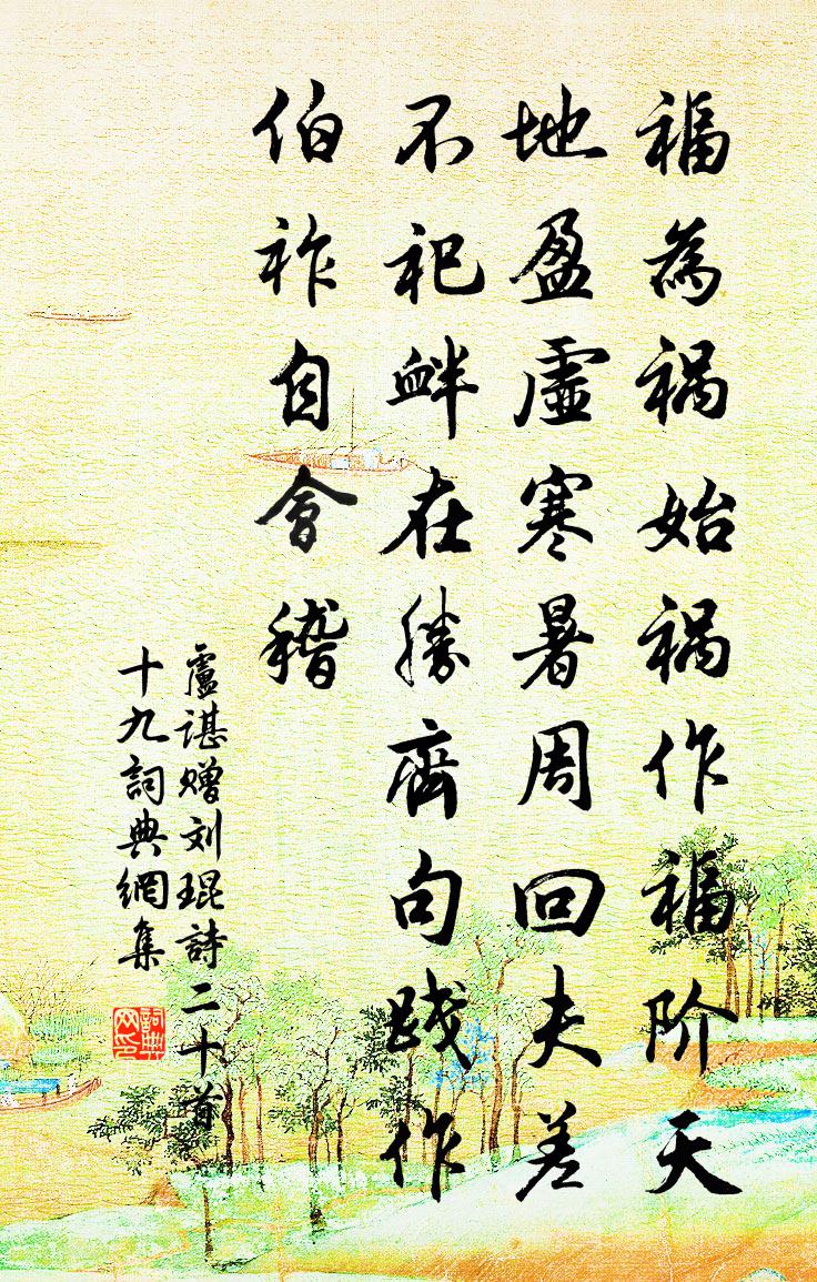 詩詞名句歷史字典書法欣賞書法字典國語詞典說文解字康熙字典古漢語字典標 題 作 者 詩 句 贈劉琨詩二十首 十九作者:盧諶 朝代:魏晉贈劉琨詩二十首 十九原文福為禍始。禍作福階。天地盈虛。寒暑周回。夫差不祀。釁在勝齊。句踐作伯。祚自會稽。詩詞問答問:贈劉琨詩二十首 十九的作者是誰?答:盧諶問:贈劉琨詩二十首 十九寫於哪個朝代?答:魏晉盧諶贈劉琨詩二十首 十九書法欣賞贈劉琨詩二十首 十九書法作品詩詞推薦小龍湫杜范〔宋代〕水脈憑高天外來,半空散得萬飛埃。老龍臥處知何在,喚作靈湫亦漫猜。浣溪紗張先〔宋代〕樓倚春江百尺高,煙中還未見歸橈。幾時期信似江潮?花片片飛風弄蝶,柳陰陰下水平橋。日長才過又今宵。又和感舊四首劉克莊〔宋代〕蹇驢誰駕復誰驂,略似遺公在劍南。尚有三鍾加十束,那無二頃種千柑。不煩剝啄敲門訪,且可跏趺面壁參。春到沁園春 題潮陽張許二公廟文天祥〔宋代〕為子死孝,為臣死忠,死又何妨。自光岳氣分,士無全節,君臣義缺,誰負剛腸。罵賊睢陽,愛君許遠,留得聲名偈頌一百二十三首釋祖欽〔宋代〕休擬議,莫商量。無朕兆,絕承當。君不江路野梅無主,自開自落,分外馨香。一枝橫亞清波上,引得游蜂上下忙偈頌一百零九首釋可湘〔宋代〕眼若不睡,諸夢自除。心若不異,萬法一如。佛也無,魔也無,今朝五月五,何用釘桃符。滄浪亭有感二首錢時〔宋代〕歸老園林事已休,無端淮水作鴻溝。堂堂百戰平戎手,肯向滄浪把釣鉤。青玉案曹組〔宋代〕田園有計歸須早。在家縱貧亦好。南來北去何日了。光陰送盡,可憐青鬢,暗逐流年老。寂寥孤館殘燈照。鄉思驚贈真公影堂鮑溶〔唐代〕舊房西壁畫支公,昨暮今晨色不同。遠客閒心無處所,獨添香火望虛空。長相思曹鄴〔唐代〕剪妾身上巾,贈郎傷妾神。郎車不暫停,妾貌寧長春?青天無停雲,滄海無停津。遣妾空床夢,夜夜隨車輪。華藏寺會故人王安石〔宋代〕百憂成阻闊,一笑得留連。城郭西風裡,園林落照前。共知官似夢,莫負酒如泉。興罷重攜手,江湖即渺然。滿江紅魏初〔元代〕天造雲雷,問誰是、中原豪傑。人盡道、青錢萬選,使君高節。自有胸中兵十萬,不須更事張儀舌。看千秋、金鏡孤鸞(早春)馬子嚴〔宋代〕沙堤香軟。正宿雨初收,落梅飄滿。可奈東風,暗逐馬蹄輕卷。湖波又遠漲綠,粉牆陰、日融煙暖。驀地刺桐枝上次韻樂先生吳中見寄八首其范成大〔宋代〕幾多螻蟻與王侯,往古來今共一丘。遮莫功名掀宇宙,百年兩角寄蝸牛。和景彝西閣獨直梅堯臣〔宋代〕池頭鳳皇寒,井上梧桐老。鳳寒浴已晚,桐老脫亦早。是時有詞臣,獨直正視藁。嚴嚴代王言,落落奮清藻。演成垓城儲嗣宗〔唐代〕百戰未言非,孤軍驚夜圍。山河意氣盡,淚濕美人衣。呈交代陳造〔宋代〕雨行不轉首,豈即真良圖。二年望鄉國,得歸不暇徐。徒隸悉此意,頗作竭蹷趨。沖泥傍險地,亦復歌載塗。使君同張隨州賦會稽朱子榮席上丹桂曾豐〔宋代〕月娥施朱小留殘,天風吹上桂樹端。葉猶強項護故綠,花獨多情染余丹。夜來誰借修月斧,和根{輟車換刂}與凡送端溪尉張達城挈家南歸王之道〔宋代〕年時蕭寺雪初晴,聞道君來眼倍明。送別又看秋欲去,論交還感蓋初傾。帆張須水秋潮漲,路入鉛山晚翠橫。快向大佛頭次程斗山楊公遠〔宋代〕丈六金身本自然,如今丈六示齊肩。當時若起亭亭立,只恐才余尺五天。名句推薦這次第,怎一個愁字了得!李清照《聲聲慢·尋尋覓覓》 不入虎穴,焉得虎子。程登吉《幼學瓊林·卷四·鳥獸》 落木蕭蕭,琉璃葉下瓊葩吐。王十朋《點絳唇·素香丁香》 惶恐灘頭說惶恐,零丁洋里嘆零丁。文天祥《過零丁洋》 將失權,不操其勢,亦如魚龍脫於江湖,欲求游洋之勢,奔濤戲浪,何可得也。諸葛亮《將苑·卷一·兵權》 長水塘南三日雨,菜花香過秀州城查慎行《曉過鴛湖》 故大人之務,將在於眾賢而已。墨子《墨子·08章 尚賢(上)》 勸君頻入醉鄉來,此是無愁無恨處。晏幾道《玉樓春·雕鞍好為鶯花住》 不覺新涼似水,相思兩鬢如霜。劉辰翁《西江月·新秋寫興》 遠信入門先有淚,妻驚女哭問何如。元稹《得樂天書》