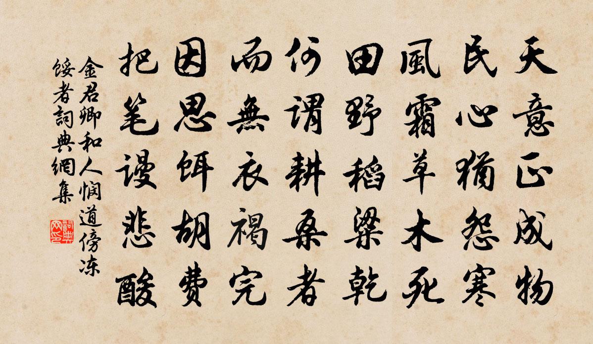 詩詞名句歷史字典書法欣賞書法字典國語詞典說文解字康熙字典古漢語字典標 題 作 者 詩 句 和人憫道傍凍餒者作者:金君卿 朝代:宋代和人憫道傍凍餒者原文天意正成物,民心猶怨寒。風霜草木死,田野稻粱乾。何謂耕桑者,而無衣褐完。因思餌胡費,把筆謾悲酸。詩詞問答問:和人憫道傍凍餒者的作者是誰?答:金君卿問:和人憫道傍凍餒者寫於哪個朝代?答:宋代金君卿和人憫道傍凍餒者書法欣賞和人憫道傍凍餒者書法作品詩詞推薦偈二首舜禪師〔宋代〕無端被譖枉遭迍,卷載有餘作俗人。今日再歸三峽寺,幾多道好幾多嗔。大雪趙振文寄詩言乘月泛舟清甚次韻樓鑰〔宋代〕雪光絕勝水銀銀,未覺仙家隔一塵。真境宜君著佳句,賞心樂事更良辰。贈毋中舍王禹偁〔宋代〕嶺表榆關路嶮巇,頒條持節兩無辭。四方自是男兒事,萬里歸來聖主知。磧雪舊行閒入夢,貪泉曾飲別留詩。如今立春前七日聞有預作春盤邀客者戲作陸游〔宋代〕蓼芽蔬甲簇青紅,盤箸紛紛笑語中。一餅不分空恨望,暮年知有幾春風?采荔子十絕劉克莊〔宋代〕日日煩湯使,年年費火攻。暮齡知艾附,不及荔枝功。摸魚兒(送上元主簿回府)張榘〔宋代〕正桃花、漸蜚紅雨,依稀一半春色。東風十里離亭恨,楊柳絲絲如織。遠又憶。向雪月梅邊,陶寫吟情逸。清愁拍湖上別野張濡〔宋代〕弱柳舒眉學遠山,四山斜嚲綠雲鬟。平湖如鑒一回照,西子明妝濃淡間。聽詩叟袁枚〔清代〕底事聽詩聽不清,此翁耳殼欠分明。擬攜謝朓驚人句,來向青天頌數聲。驀山溪 夏景集曲名元好問〔金代〕梁州夏早,南浦荷花媚。人月欲圓時,賀聖朝、生申名世。桂枝香滿,早奪錦標回,春光好,少年游,爛醉蓬萊里二郎神王哲〔元代〕觀塵境盡。總把浮名修整。此假合形骸皆不悟,猶然待、巧妝馳騁。百歲韶華能有幾,到七十、難逃逝景。*裡面又登碧雲亭感懷三十首吳芾〔宋代〕晚上危亭看綠荷,風翻荷葉欲藏花。使君要見紅妝面,莫放碧雲重疊遮。公子行羅鄴〔唐代〕金鞍玉勒照花明,過後春風特地生。半醉五侯門裡出,月高猶在禁街行。古梅釋智愚〔宋代〕千年苔樹不成春,誰信幽香似玉魂。霽雪滿林無月曬,點燈吹角做黃昏。赤松三詠小桃源姜特立〔宋代〕四山古木老煙雲,流水桃花幾換春。舉世但夸羊化石,那知不有武陵人。方壺自詠汪莘〔宋代〕事體向晚境,情懷非少年。平生不得地,至死亦由天。坐背暑彌勝,行膺寒愈堅。願言過去苦,莫與後來賢。減字木蘭花(縣齋見梅)姚述堯〔宋代〕天寒人靜。嘯倚胡床閒晝永。春信初回。報導南枝昨夜開。沈沈庭院。獨坐黃昏誰是伴。風過南牆。似覺天宮暗遞赴渭北宿石泉驛南望黃堆烽李益〔唐代〕邊城已在虜城中,烽火南飛入漢宮。漢庭議事先黃老,麟閣何人定戰功。褚主簿宅會畢庶子錢員外郎使君(一作張繼詩)韓翃〔唐代〕開瓮臘酒熟,主人心賞同。斜陽疏竹上,殘雪亂天中。更喜宣城印,朝廷與謝公。南鄉子朱敦儒〔宋代〕宮樣細腰身。玉帶羅衫穩試新。小底走來宣對御,催頻。曲殿西廂小苑門。歌舞斗輕盈。不許楊花上錦茵。勸得君悼亡秘書方逢振〔宋代〕翠華東南來,奎聚屬吳域。分王百餘年,靈光赫天德。龍文發南源,圖書粲東壁。誰折天罅開,猝忽正氣泄。剖藏名句推薦順風而呼,聲非加疾也,而聞者彰。荀子《勸學》 以少總多,情貌無遺矣。劉勰《文心雕龍·物色》 已向丹霞生淺暈,故將清露作芳塵。睦石《玉蘭》 何當金絡腦,快走踏清秋。李賀《馬詩二十三首》 玉勒雕鞍遊冶處,樓高不見章台路。歐陽修《蝶戀花·庭院深深深幾許》 輕則寡謀,驕則無禮。左丘明《國語·周語·王孫滿觀秦師》 筆落驚風雨,書成泣鬼神。馮夢龍《醒世恆言·卷二十一》 聖人不能為時,時至而弗失。劉向《戰國策·秦三·秦客卿造謂穰侯》 酹酒蒼茫,倚歌平遠,亭上玉虹腰冷。吳文英《十二郎·垂虹橋》 余凡事喜獨出己見,不屑隨人是非。沈復《浮生六記·浪遊記快》