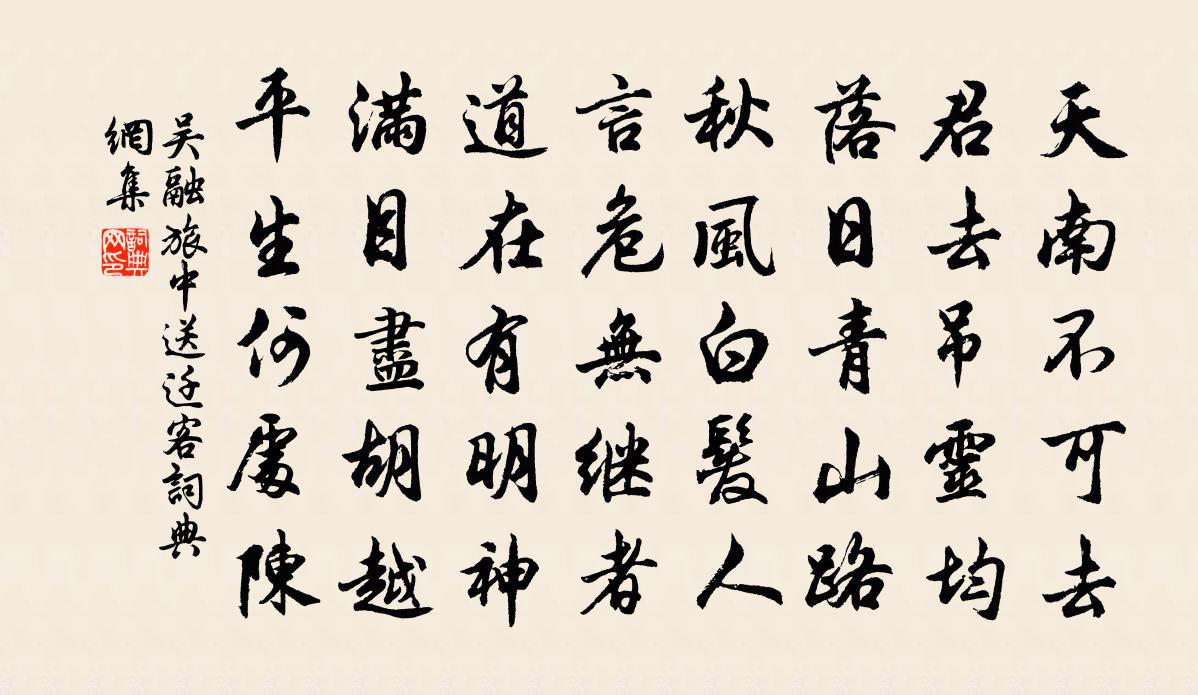 詩詞名句歷史字典書法欣賞書法字典國語詞典說文解字康熙字典古漢語字典標 題 作 者 詩 句 旅中送遷客作者:吳融 朝代:唐代旅中送遷客原文天南不可去,君去吊靈均。落日青山路,秋風白髮人。言危無繼者,道在有明神。滿目盡胡越,平生何處陳。詩詞問答問:旅中送遷客的作者是誰?答:吳融問:旅中送遷客寫於哪個朝代?答:唐代問:旅中送遷客是什麼體裁?答:五律吳融旅中送遷客書法欣賞旅中送遷客書法作品注釋全唐詩:卷685-6詩詞推薦題王有恆山房王冕〔元代〕人世紅塵漲碧空,薜窗蘿幾自清風。朝來爽氣歸書潤,夜靜青雲入夢濃。壁上枯桐忘歲月,床頭老劍識英雄。丈夫再用前韻蘇軾〔宋代〕樂天雙鬢如霜菅,始知謝遣素與蠻。我兄綠髮蔚如故,已了夢幻齊人間。蛾眉勸酒聊爾耳,處仲太忍茂弘孱。三杯送雨浙轉連道卿學士二首宋庠〔宋代〕彼美閨台彥,胡為江海行。真貪子舍養,不厭使軺輕。茂草姑蘇苑,蒼山越絕城。莫因羊酪味,終擬笑諸倉。春詞方岳〔宋代〕草色將寒上客衣,柔情只了得花飛。湘簾不隔社公雨,百姓人家燕未歸。正月十二日自房州城遇虜至奔入南山十五日抵陳與義〔宋代〕久謂事當爾,豈意身及之。避虜連三年,行半天四維。我非洛豪士,不畏窮谷飢。但恨平生意,輕了少陵詩。今年登姑蘇台釋行海〔宋代〕姑蘇台上鹿麇來,流水千年去不回。野草青青都是恨,春風不放百花開。寧宗郊前朝獻景靈宮二十四首真宗〔宋代〕維宋肖德,欽天顧右。於皇道祖,丕釐靈祐。葛藟殖繁,瓜{左瓜右失}孕茂。克昌厥後,世世孝奏。小雨陸游〔宋代〕小雨明復闇,余寒去又來。新苔緣砌上,殘杏過籬開。垂老身余幾,逢春心尚孩。江天近寒食,林外過輕雷。石竹花董嗣杲〔宋代〕矮叢平翦海霞鮮,亂撒東風紫錦錢。露沈翠抽春節嫩,煙枰繡蹙絳綃圓。土階曄曄搖芳澤,山舍英英吐秀妍。秋色孤村陸游〔宋代〕少年誤計落人間,晚臥孤村日掩關。小室易溫爐火省,幽窗常暗架書閒。梅橫籬落春初動,雲鬧川原雪尚慳。欲喚十二月十日暮小雪即止陸游〔宋代〕夜來一雪苦匆匆,千里濃雲忽掃空。換得月明良不惡,未須過計慮蝗蟲。農家歌陸游〔宋代〕村東買牛犢,舍北作牛屋。飯牛三更起,夜寐不敢熟。茫茫陂水白,纖纖稻秧綠。二月鳴搏黍,三月號布榖。為農中屏燕侍郎煙嵐曉景宋祁〔宋代〕澹峰危木掃天春,青到屏端憶故人。一丈輕綃千里思,為君今日拂流塵。送定維那釋宗演〔宋代〕興化當年為克賓,棒頭敲出玉麒麟。遯庵放過定禪者,只要渠儂眼自明。古意呈補闕喬知之 / 古意 / 獨不見沈佺期〔唐代〕盧家少婦鬱金堂,海燕雙棲玳瑁梁。九月寒砧催木葉,十年征戍憶遼陽。白狼河北音書斷,丹鳳城南秋夜長。誰知正月三日郊外馬上作強至〔宋代〕長日牽人事,新年散馬蹄。和風吹凍柳,殘雪點春泥。意愜境自勝,興來杯屢攜。徘徊羨飛鳥,曉逐野雲低。門徑高翥〔宋代〕門徑蕭然獨自居,入無給侍出無車。江湖故舊音塵絕,里巷游從酒盞疏。豪舉已拋三尺劍,神交惟有一床書。吾兄登樓賦王粲〔兩漢〕登茲樓以四望兮,聊暇日以銷憂。覽斯宇之所處兮,實顯敞而寡仇。挾清漳之通浦兮, 倚曲沮之長洲。背墳衍之送人之官嚴陵周文璞〔宋代〕如君風貌又精神,自合拖紳近紫宸。平地有心開洞穴,十年無俸著閒身。已看青舫垂垂去,須憶緋桃灩灩春。若向示逸二首趙蕃〔宋代〕縱慾必富貴,成身多賤貧。寸陰寧重璧,江水本觴岷。勿但愈流俗,要當論古人。殘冬不十日,又說待來春。名句推薦一點浩然氣,千里快哉風。蘇軾《水調歌頭·黃州快哉亭贈張偓佺》 階下青苔與紅樹,雨中寥落月中愁。李商隱《端居》 停杯投箸不能食,拔劍四顧心茫然。李白《行路難·其一》 極陽以殺,極陰以生佚名《黃帝四經·經法·四度》 年年歲歲花相似,歲歲年年人不同。劉希夷《代悲白頭翁 / 白頭吟 / 有所思》 天上人間何處去,舊歡新夢覺來時,黃昏微雨畫簾垂。張曙《浣溪沙·枕障薰爐隔繡帷》 吃不了兜著走曹雪芹《紅樓夢·第二十三回》 瞻彼洛城郭,微子為哀傷。曹操《薤露行》 何時更杯酒,再得論心胸。李白《魏郡別蘇明府因北游》 奉君金卮之美酒,玳瑁玉匣之雕琴。鮑照《擬行路難·其一》