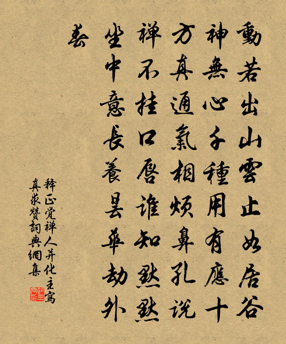 詩詞名句歷史字典書法欣賞書法字典國語詞典說文解字康熙字典古漢語字典標 題 作 者 詩 句 禪人並化主寫真求贊作者:釋正覺 朝代:宋代禪人並化主寫真求贊原文動若出山雲,止如居穀神。無心千種用,有應十方真。通氣相煩鼻孔,說禪不掛口唇。誰知默默坐中意,長養曇華劫外春。詩詞問答問:禪人並化主寫真求贊的作者是誰?答:釋正覺問:禪人並化主寫真求贊寫於哪個朝代?答:宋代釋正覺禪人並化主寫真求贊書法欣賞禪人並化主寫真求贊書法作品詩詞推薦題山寺(一作題悟空寺)劉商〔唐代〕扁舟水淼淼,曲岸復長塘。古寺春山上,登樓憶故鄉。雲煙橫極浦,花木擁迴廊。更有思歸意,晴明陟上方。和峽州趙教授春後雪中惠酒陽枋〔宋代〕多君不許利台驅,官冷瓢空日自娛。猶有小槽春夜滴,呼僮踏雪遺紅珠。送張秀才陳師道〔宋代〕學又三年積,功收一日長。擅場推老手,附尾續諸郎。度鳥界晴碧,過雲回夕黃。熟知詩有驗,莫慍路無糧。依韻和唐彥猷華亭十詠崑山梅堯臣〔宋代〕陸氏幾世祖,葬此生令名。猶如產美璞,遂邇傳嘉聲。寒岩畜奇秀,源水日東傾。何言千載間,二子不更生。汲惠山泉烹日鑄程公許〔宋代〕瓦瓶挹注溢微瀾,仙掌兩分瑞露污。自候燎爐烹日鑄,杜陵肺渴耐甘寒。題余文叔山間四時之樓舒岳祥〔宋代〕輕財好事余文叔,磊落襟期端不俗。外方避地客來多,我亦從君借書屋。屋前曲徑繞淪漪,池上高樓新結束。一條頌古一百二十一首釋宗杲〔宋代〕入門便棒,郎當不少。依而行這,胡麻廝繳。依韻奉和司徒侍中苦熱未雨強至〔宋代〕乾坤五月氣炎歊,丞相憂農心更焦。思脫塵埃遺暑濕,擬排寥廓御風飈。穴中戰蟻空知驗,雲外晴虹尚肆祅。下土晝寢正酣以二十韻詩來亟為次韻樓鑰〔宋代〕老氏正求知我希,吾今老矣更何之。極知仕宦皆由命,縱有功名已過時。覽鏡形容寧復我,還鄉交友定從誰。慈親謝判府王宣徽惠酒邵雍〔宋代〕自得花枝向遠鄰,只憂輕負一番春。無何寵貺酒雙榼,少室山人遂不貧。侍宴樂游苑餞呂僧珍應詔詩沈約〔南北朝〕丹浦非樂戰。負重切君臨。我皇秉至德。忘己用堯心。愍茲區宇內。魚鳥失飛沉。推轂二崤道。揚斾九河陰。超乘和馬伯庸尚書四絕句王邁〔宋代〕玉泉山下水潺潺,不比溫泉洗玉環。濯罷九龍池內錦,纏教流出到人間。出真州文天祥〔宋代〕有客倉皇欲赴壕,一行性命等鴻毛。白兵送我揚州去,惟恐北軍來捉逃。早行樓鑰〔宋代〕水余枯卉尚棲苴,催促征夫趁曉鴉。細路繚山穿亂石,輕輿掠樹得飛花。柔桑彌望兩三里,修竹深藏四五家。徑處武夷楊希古〔宋代〕萬壑千岩疊翠微,幔亭紅日浸漣漪。紫陽去後無訊息,留得溪山九曲詩。病中六首陳師道〔宋代〕日暖衣猶襲,宵長被有棱。朝晡三楪飯,昏曉一缸燈。伴坐跧如幾,扶行瘦比藤。生緣堪入畫,寂寞憩松僧。送友人游湖南張喬〔唐代〕所投非舊知,亦似有前期。路向長江上,帆揚細雨時。春生南嶽早,日轉大荒遲。盡采瀟湘句,重來會近期。重酬錢員外白居易〔唐代〕雪中重寄雪山偈,問答殷勤四句中。本立空名緣破妄,若能無妄亦無空。偈頌六十七首釋原妙〔宋代〕洞徹是非如夢幻,轉身未免墮深坑。須知別有通霄路,不許時人造次行。頌古二十首釋了一〔宋代〕殿上從來好功德,如何侍者卻疑惑。趙州露出赤心肝,問著依然墨漆黑。名句推薦書痴者文必工,藝痴者技必良。蒲松齡《聊齋志異·卷二·阿寶》 君子坦蕩蕩,小人長戚戚。孔子弟子《論語·述而篇》 冰,水為之,而寒於水。荀子《勸學》 春草如有情,山中尚含綠李白《金門答蘇秀才》 浮雲終日行,遊子久不至。杜甫《夢李白二首·其二》 數年來往鹹京道,殘杯冷炙謾消魂晏殊《山亭柳·贈歌者》 當知器滿則傾,須知物極必反。程登吉《幼學瓊林·卷三·人事》 鏡湖三百里,菡萏發荷花。李白《子夜吳歌·夏歌》 還怕兩人俱薄命,再緣慳、剩月零風裡。納蘭性德《金縷曲·亡婦忌日有感》 喚起兩眸清炯炯,淚花落枕紅棉冷周邦彥《蝶戀花·早行》