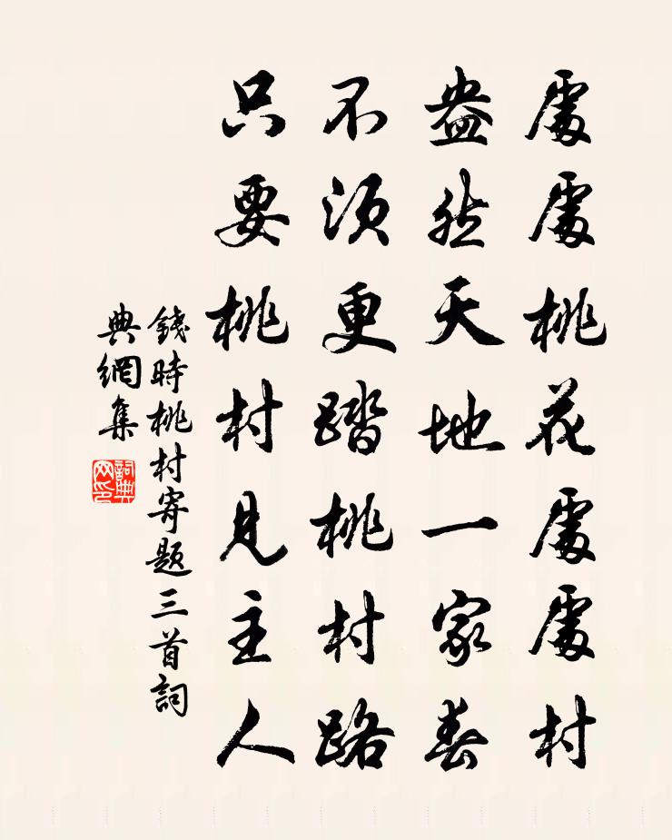 詩詞名句歷史字典書法欣賞書法字典國語詞典說文解字康熙字典古漢語字典標 題 作 者 詩 句 桃村寄題三首作者:錢時 朝代:宋代桃村寄題三首原文處處桃花處處村,盎然天地一家春。不須更踏桃村路,只要桃村見主人。詩詞問答問:桃村寄題三首的作者是誰?答:錢時問:桃村寄題三首寫於哪個朝代?答:宋代錢時桃村寄題三首書法欣賞桃村寄題三首書法作品詩詞推薦送張洞推官赴永興經略司歐陽修〔宋代〕自古天下事,及時難必成。為謀於未然,聰者或莫聽。患至而後圖,智者有不能。未遠前日悔,可為來者銘。熙熙和答李季蓬因觀鄙語見贈趙蕃〔宋代〕沅有茝兮灃有蘭,到今風物尚班班。有懷未覺千年遠,無力能追一字還。贈我詩何富風月,知君助不待江山。況聞偶書四首胡宏〔宋代〕衡岳望嵩少,屹然河漢間。浮雲自來往,誰肯拓關山。罷酒陳起〔宋代〕罷酒尋花涉斷磯,顛躋猶復強褰衣。可憐醉眼無分別,卻把旁邊柳折歸。浣溪沙晏幾道〔宋代〕一樣宮妝簇彩舟。碧羅團扇自障羞。水仙人在鏡中游。腰自細來多態度,臉因紅處轉風流。年年相遇綠江頭。扈蹕霸州納蘭性德〔清代〕霸山重鎮奠神京,鸞輅春遊淑景明。萬呱銀濤沖古岸,四圍玉甃護嚴城。花乘暖日迎來騎,柳帶新膏綰去旌。八寨木蘭花/玉樓春晏殊〔宋代〕簾旌浪卷金泥鳳。宿醉醒來長瞢鬆。海棠開後曉寒輕,流絮飛時春睡重。美酒一杯誰與共。往事舊歡時節動。不如登大別眺望潘大臨〔宋代〕人爭漢口渡,日落陽台坂。鼓吹隔岸聞,樓觀排雲見。碧蕪王安石〔宋代〕碧蕪平野曠, * 晚村深。客倦留甘飲,身閒累苦吟。宮詞一百首岳珂〔宋代〕鴉山凌曉度先鋒,泣穴鼯鼪已滅蹤。天子聖明知萬里,歸徠州下拆泥封。用薛郎所寄示詩三韻晁公溯〔宋代〕阿傳議酒食,察貳更廉空。開瓮鴨頭綠,磨刀魚眼紅。報功他日在,食淡暫時同。富貴行自致,聖時無道窮。吳宮怨張籍〔唐代〕吳宮四面秋江水,江清露白芙蓉死。吳王醉後欲更衣,座上美人嬌不起。宮中千門復萬戶,君恩反覆誰能數。君心湖上有作陳輔〔宋代〕平湖共天遠,浸月坐寒光。乘流溯荃璧,掉舟尋藥房。佳人折輕荷,隨風來珍香。顧盼但微笑,眉宇何清揚。日暮放言五首元稹〔唐代〕近來逢酒便高歌,醉舞詩狂漸欲魔。五斗解酲猶恨少,十分飛盞未嫌多。眼前仇敵都休問,身外功名一任他。死是西湖夜景曾由基〔宋代〕處處芙蕖處處堂,閒行何地不清香。歸舟又趁機晚涼急,十里湖光蘸陽。詩悼路鈐舍人德久潘公葉適〔宋代〕詩人冥漠去何許,花鳥相寬不作愁。耆舊只今新語少,九原喚起韋蘇州。謝康侍郎送來甄龍友〔宋代〕折腰鄉里愧陶潛,五斗黃陳飯莫嫌。一介古來難取與,先生傷惠我傷廉。贈鄭員外陶翰〔唐代〕驄馬拂繡裳,按兵遼水陽。西分雁門騎,北逐樓煩王。聞道五軍集,相邀百戰場。風沙暗天起,虜騎森已行。儒服衛生畫山水王冕〔元代〕國朝畫手不可數,神妙獨數高尚書。尚書意匠悟三昧,筆力固與常人殊。林樹無根雲懵懵,崑崙泰華雲中涌。山城新秋旅思趙汝鐩〔宋代〕兩袖塵埃滿,千山道路勤。曉清秋已到,葉落客先聞。鏡裹驚衰態,眉間添皺紋。人生閒第一,回首故山雲。名句推薦艱難苦恨繁霜鬢,潦倒新停濁酒杯。杜甫《登高》 驚奇喜異者,終無遠大之識;苦節獨行者,要有恆久之操。洪應明《菜根譚·概論》 聞說東風亦多情,被竹外、香留住。史達祖《留春令·詠梅花》 何因不歸去?淮上有秋山。韋應物《淮上喜會梁川故人 / 淮上喜會梁州故人》 煢煢白兔,東走西顧。佚名《古艷歌》 向淺洲遠渚,亭亭清絕。張炎《疏影·詠荷葉》 殘雪樓台,遲日園林。韓疁《高陽台·除夜》 春日遲遲,卉木萋萋。佚名《出車》 萬壑樹參天,千山響杜鵑。王維《送梓州李使君》 一叫一迴腸一斷,三春三月憶三巴。李白《宣城見杜鵑花 / 子規》