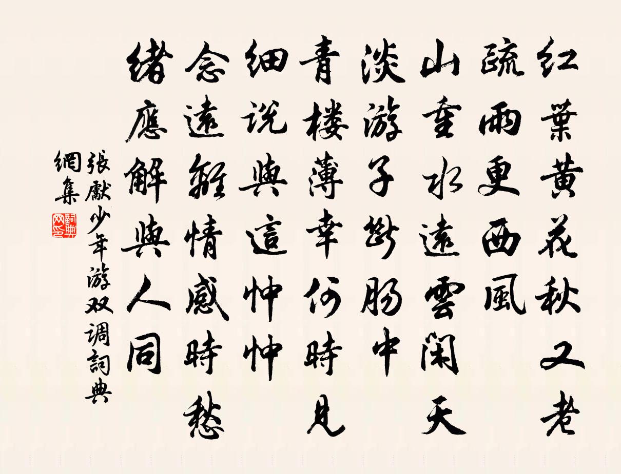 紅葉黃花秋又老,疏雨更西風。山重水遠,雲閒天淡,遊子斷腸中。