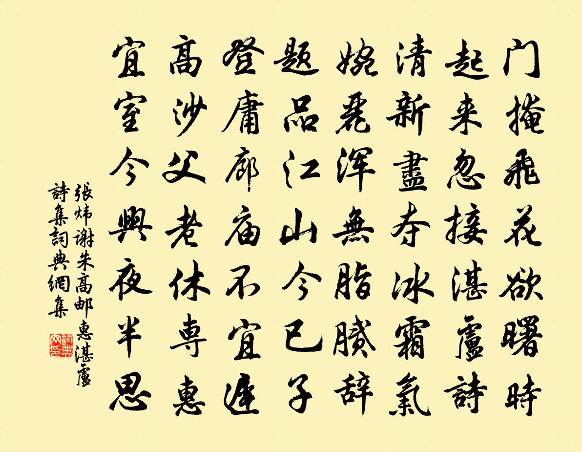 詩詞名句歷史字典書法欣賞書法字典國語詞典說文解字康熙字典古漢語字典標 題 作 者 詩 句 謝朱高郵惠湛盧詩集作者:張煒 朝代:宋代謝朱高郵惠湛盧詩集原文門掩飛花欲曙時,起來忽接湛盧詩。清新盡奪冰霜氣,婉麗渾無脂膩辭。題品江山今已子,登庸廊廟不宜遲。高沙父老休專惠,宜室今興夜半思。詩詞問答問:謝朱高郵惠湛盧詩集的作者是誰?答:張煒問:謝朱高郵惠湛盧詩集寫於哪個朝代?答:宋代張煒謝朱高郵惠湛盧詩集書法欣賞謝朱高郵惠湛盧詩集書法作品詩詞推薦澄秀上座院韋應物〔唐代〕繚繞西南隅,鳥聲轉幽靜。秀公今不在,獨禮高僧影。林下器未收,何人適煮茗。早鶯齊己〔唐代〕何處經年閟好音,暖風催出囀喬林。羽毛新刷陶潛菊,喉舌初調叔夜琴。藏雨並棲紅杏密,避人雙入綠楊深。曉來長沙六快詩王揆〔唐代〕湖外風物奇,長沙信難續。衡峰排古青,湘水湛寒綠。舟楫通大江,車輪會平陸。昔賢官是邦,仁澤流豐沃。今賢貞義女詠趙葵〔宋代〕白首辭廊廟,投間瀨水隈。因親貞女傳,深仰謫仙才,聲漂名猶在,沉淵事可哀。請魂招不得,偷俗挽教回。直筆西園三月十一日宋祁〔宋代〕春園來繼日,疊葉暗東西。蔭樹都成幄,尋花旋作蹊。沼魚銜尾戲,林鳥合聲啼。寧暇并州問,山公醉自迷。念奴嬌連仲宣〔宋代〕暗黃著柳,漸寒威收斂,日和風細。□□端門初錫宴,鬱鬱蔥蔥佳氣。太一行春,青藜照夜,夜色明如水。鰲山彩水調歌頭·冬至子之半魏了翁〔宋代〕冬至子之半,玉管罅微陽。壺中別有天地,轉覺日增長。一樣金章紫服,一樣朱顏綠髮,翁季儼相望。翁是修何行和邵堯夫韻示兒侄王洋〔宋代〕言貴安徐行貴常,與人平淡勿相傷。莫貪順路行時快,到了回思見去長。克己定知天降福,害人只是自貽殃。長教詞笑令(⑧採蓮)秦觀〔宋代〕詩曰:若耶溪邊天氣秋。採蓮女兒溪岸頭。笑隔荷花共人語,煙波渺渺盪輕舟。數聲水調紅嬌晚。棹轉舟回笑人遠過畫龍天始明方回〔宋代〕落月猶余彩,荒村已幾過。店明燈透壁,石響馬升坡。起早寒多嗽,忘勞暗自歌。老夫亦小憩,霜重手頻呵。玉照堂觀梅二十首張鎡〔宋代〕群芳非是乏新寄,或在繁時或嫩時。唯有南枝香共色,從初到底絕瑕疵。與臨安令宗人同年劇飲蘇軾〔宋代〕我雖不解飲,把盞歡意足。試呼白髮感秋人,令唱黃雞催曉曲。與君登科如隔晨,敝袍霜葉空殘綠。如今莫問老與和路樞四首胡寅〔宋代〕進退行藏合道樞,詎分廊廟與江湖。原陪東閣留賓後,定向南山卜宅無。不為避喧鄰懶瓚,祗緣嘗藥訪臾區。勉搜見懷蘇泂〔宋代〕顏淵樂簞瓢,曾子日三省。閉門謝往還,安此寂寞境。閒來愛我地,止渴望梅嶺。玄談破月脅,心對日光炯。榮枯次韻唐彥猷華亭十詠其六陸瑁養魚池王安石〔宋代〕野人非昔人,亦復水上居。紛紛水中游,豈是昔時魚。吹波浮還沒,競食糟糠余。吞舟不可見,守此歲月除。題釣雪圖趙蕃〔宋代〕沙鷗故飛飛,湖雁更歷歷。顧我亦忘機,相看同一適。試墨三首陳著〔宋代〕元圭珍重鎮書房,紫石磨來滃墨香。老去苦無閒著述,以分寸計□時長。長相思(客中景定壬戌秋)劉塤〔宋代〕霧隔平林,風欺敗褐,十分秋滿黃華。荒庭人靜,聲慘寒蛩,驚回羈思如麻。庾信多愁,有中宵清夢,迢遞還家。陳主管招飲陳造〔宋代〕鵲拳庭竹語頻頻,忽有書來寂寞濱。盛事許同花燭夜,芳辰仍醉綺羅春。璧聯香合初鳴鳳,霞泛仙觴定脯麟。更辦寓言黃滔〔唐代〕流年五十前,朝朝倚少年。流年五十後,日日侵皓首。非通非介人,誰論四十九。賢哉蘧伯玉,清風獨不朽。名句推薦好名羈行,重利無虧。來俊臣《羅織經·保身卷第七》 遠樹帶行客,孤城當落暉。王維《送綦毋潛落第還鄉 / 送別》 有無相生,難易相成,長短相形,高下相傾,音聲相和,前後相隨。老子《老子·道經·第二章》 掩淚空相向,風塵何處期盧綸《李端公/送李端》 箭在弦上,不得不發羅貫中《三國演義·第三十二回》 大雪壓青松,青松挺且直。陳毅《青松》 斑竹枝,斑竹枝,淚痕點點寄相思。劉禹錫《瀟湘神·斑竹枝》 孤鴻號外野,翔鳥鳴北林。阮籍《詠懷八十二首·其一》 棠梨花映白楊樹,儘是死生別離處。白居易《寒食野望吟》 牛靿咤咤,田確確,旱塊敲牛蹄趵趵。元稹《田家詞 / 田家行》