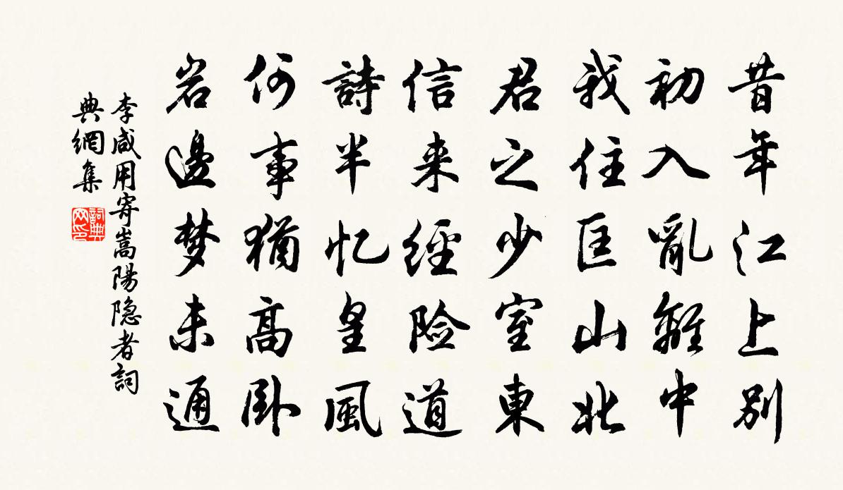 詩詞名句歷史字典書法欣賞書法字典國語詞典說文解字康熙字典古漢語字典標 題 作 者 詩 句 寄嵩陽隱者作者:李鹹用 朝代:唐代寄嵩陽隱者原文昔年江上別,初入亂離中。我住匡山北,君之少室東。信來經險道,詩半憶皇風。何事猶高臥,岩邊夢未通。詩詞問答問:寄嵩陽隱者的作者是誰?答:李鹹用問:寄嵩陽隱者寫於哪個朝代?答:唐代問:寄嵩陽隱者是什麼體裁?答:五律李鹹用寄嵩陽隱者書法欣賞寄嵩陽隱者書法作品注釋全唐詩:卷645-53詩詞推薦和趙彥和祈晴郭印〔宋代〕靈宇祈昭霽,還車已報晴。高空開曠盪,遠樹見疏明。踴躍增行旅,歌謠遍耦耕。今年書大有,香飯亦炊秔。頌古一百首釋智愚〔宋代〕此行莫擬幾時回,此去應須到五台。若過曼殊放光處,殷勤為我記歸來。秋夜宴臨津鄭明府宅杜審言〔唐代〕行止皆無地,招尋獨有君。酒中堪累月,身外即浮雲。露白宵鍾徹,風清曉漏聞。坐攜餘興往,還似未離群。秋雨陸游〔宋代〕山深枕草木久已枕荒,晝昏風雨殊未止。看枕不覺向壁臥,煎枕欲罷推枕起。清心正付竹罏香,漱齒每挹岩泉水。和顏長官百詠漁父朱繼芳〔宋代〕璧月滄波上下天,秋風搖落四無邊。玉龍盡喚眠鷗起,兩岸蘆花不見船。好事近(西湖)辛棄疾〔宋代〕日日過西湖,冷浸一天寒玉。山色雖言如畫,想畫時難邈。前弦後管夾歌鍾,才斷又重續。相次藕花開也,幾蘭舟答簡夫孫應時〔宋代〕拂拭瑤琴聽我歌,湯湯三嘆又峨峨。了知世道從來久,長覺人心苦太多。便踏早朝陪鳳輦,更憂春夢隔鯨波。此生送同年萬元亨知階州范成大〔宋代〕老我曾頒萬里春,憐君飛棹也浮秦。當年千佛名經裹,又見西遊第二人。石塘感舊十絕劉克莊〔宋代〕禪學年來亦自衰,大叢林屬小闍梨。寒翁庵子如蝸殻,卻有彌天釋住持。和顏長官百詠貧女朱繼芳〔宋代〕少年盪子有黃金,投贈明璫結兩心。不得良媒終不肯,一春風雨洞房深。飲酒望西山戲詠陸游〔宋代〕太白十詩九言酒,醉翁無詩不說山。若耶老農識幾字,也與二事日相關。寄蔡彥規兼謝惠酥梨二首張耒〔宋代〕洛川北岸錦屏西,竹樹蕭蕭面翠微。風月有情常似舊,山川信美不如歸。文章送老甘無用,魚鳥從游久息機。寄語口號十首呈程殿撰陳造〔宋代〕郎君袞繡照鴛行,詩老時須住帝鄉。即見翹材辟新館,預應綠野敞深堂。和范景仁王景彝殿中雜題三十八首並次韻其三梅堯臣〔宋代〕花非龍香葉非柏,獨竊二美夸芳蕤。苦練不分顏色近,紫荊未甘開謝遲。群公莫以得地貴,竟費佳句何足思。和原甫省中種菊韓維〔宋代〕種菊待佳節,節至花自繁。朝感涼風吹,夕愛清露團。封培才幾日,翠類紛珊珊。君曹本稱劇,占署無停翰。才優重訪黃神谷策禪者鄭谷〔唐代〕初塵芸閣辭禪閣,卻訪支郎是老郎。我趣轉卑師趣靜,數峰秋雪一爐香。深出贅歸省再往婦氏家陳著〔宋代〕父子恩愛重,人生別離苦。惟汝善事我,我亦深愛汝。我年今七十,又有多病母。出贅非汝心,事有難直取。寸步次韻向和卿行松滋縣與鄒天錫夜語南極亭二首黃庭堅〔宋代〕雪泥滑滑到山郭,提壺勸沽亦不惡。林中解道不如歸,家人應念思歸樂。壽元俞治中陳深〔宋代〕凱風盪清淑,秦溪鍾妙英。世德裕後遠,盛年振清聲。余昔客君家,君甫十二齡。期君世濟美,事業知甘卿。微言微雨李商隱〔唐代〕初隨林靄動,稍共夜涼分。窗迥侵燈冷,庭虛近水聞。名句推薦金風玉露一相逢,便勝卻人間無數。秦觀《鵲橋仙·纖雲弄巧》 高風吹玉柱,萬籟忽齊飄司空曙《風箏》 古人忠孝,不離心頭,今人忠孝,不離口頭,此是何等志量。王永彬《圍爐夜話·第二三則》 狎興生疏,酒徒蕭索,不似少年時。柳永《少年游·長安古道馬遲遲》 飯疏食飲水,曲肱而枕之,樂亦在其中矣。不義而富且貴,於我如浮雲。孔子弟子《論語·述而篇》 恨蕭蕭、無情風雨,夜來揉損瓊肌。李清照《多麗·詠白菊》 明朝且做莫思量,如何過得今宵去。周紫芝《踏莎行·情似遊絲》 一語不入意,從君萬曲梁塵飛。李白《夜坐吟》 樹德務滋,除惡務本佚名《尚書·周書·泰誓》 春江潮水連海平,海上明月共潮生。張若虛《春江花月夜》