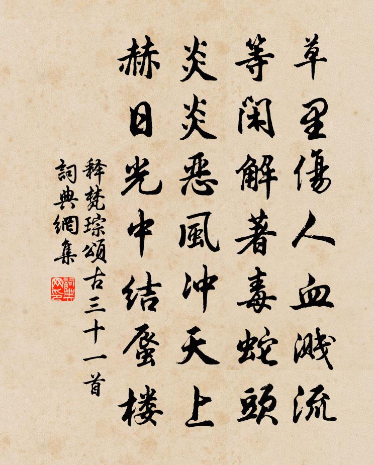 詩詞名句歷史字典書法欣賞書法字典國語詞典說文解字康熙字典古漢語字典標 題 作 者 詩 句 頌古三十一首作者:釋梵琮 朝代:宋代頌古三十一首原文草里傷人血濺流,等閒解著毒蛇頭。炎炎惡風沖天上,赫日光中結蜃樓。詩詞問答問:頌古三十一首的作者是誰?答:釋梵琮問:頌古三十一首寫於哪個朝代?答:宋代釋梵琮頌古三十一首書法欣賞頌古三十一首書法作品詩詞推薦遁齋郭印〔宋代〕念念等空寂,行藏鬼莫窺。是名真遁者,安用山林為。送魏六侍御葬皇甫冉〔唐代〕哭葬窗寒郊外,窗行將何所從。盛曹徒列柏,新墓已栽松。海月同千古,江雲覆幾重。舊窗曾諫獵,遺草議登窗。小圃有雙蓮夏芙蓉之喜文字祥也各賦一詩為宗劉克莊〔宋代〕一色雙葩費剪裁,固知造物巧胚胎。機雲乍自吳中出,坡潁初從蜀道來。佳讖似因先輩設,瑞苞不為老人開。集英餞李君亮著作守眉山分韻得翠字樓鑰〔宋代〕天下大峨山,雄秀盤厚地。山雖不在眉,所在擁空翠。矯矯三蘇公,挹此淑靈氣。文章垂日星,照映蓋一世。李侯少年行白玉蟾〔宋代〕寸心鐵石壯,一面冰霜寒。落葉鬼神哭,出言風雨翻。氣呵泰山倒,眼吸滄海乾。怒立大鵬背,醉沖九虎關。飄然再和強至〔宋代〕公到層軒雪已殘,蕭林素節曉相看。山融愛日酥千點,地接頑雲縞萬端。曾有金樽開兔苑,況無鐵甲戍桑乾。清風王昭君鮑照〔南北朝〕既事轉蓬遠。心隨鴈路絕。霜鞞旦夕驚。邊笳中夜咽。和傅子云見贈桂聞詩〔宋代〕客袖沖寒至,飄飄不受羈。笑呵雙兔筦,亟寫錦囊詩。雖我斑毛薄,多君青眼垂。別懷無處著,隨夢到春池。過山人所居因寄諸遺補錢起〔唐代〕空谷春雲滿,愚公晦跡深。一隨玄豹隱,幾換綠蘿陰。絕徑人稀到,芳蓀我獨尋。廚煙住峭壁,酒氣出重林。蝴蝶偈頌二十二首釋道生〔宋代〕浮雲散盡月當空,兔子懷胎產大蟲。跳出風前弄牙爪,至今撼動廣寒宮。秋吟晁說之〔宋代〕友生吾所畏,言貌凜秋威。崔子稻畦晚,楊公玉田飢。階除昨夜霜,鐘鳴尚依稀。吾友豈憔悴,西山空崔巍。高宗郊祀前廟朝享太廟三十首真宗〔宋代〕昭哉皇祖,源深流長。雕戈圭瓚,休有烈光。天祐潛德,繼世其昌。永懷積累,嘉訝令芳。茉莉趙福元〔宋代〕刻玉雕瓊作小葩,清姿元不受鉛華。西風偷得餘香去,分與秋城無限花。衡山縣曉渡揭傒斯〔元代〕古縣依江次,輕輿落岸隈。鳥沖行客過,山向野船開。近岳皆雲氣,中流忽雨來。何時還到此,明月照沿洄。秋日詠蟬梅堯臣〔宋代〕群蟲喜炎熱,此獨愛高陰。薄蛻聊依葉,清聲已出林。人閒感衰節,風急雜遙砧。虛腹曾何竟,常憂螗斧侵。游山二首邵雍〔宋代〕二室多好峰,三川多好雲。看之不知倦,和氣潛生神。一慮若動盪,萬事從紛紜。人言無事貴,身為無事人。還自會稽歌李賀〔唐代〕野粉椒壁黃,濕螢滿梁殿。台城應教人,秋衾夢銅輦。吳霜點歸鬢,身與塘蒲晚。脈脈辭金魚,羈臣守迍賤。偕潘寒岩陳定軒游石湖次定軒韻陳郁〔宋代〕貂裘絨帽護輕寒,坐馬端如坐席安。自別石湖三月去,又攜玉友一番看。霜催菊磵風悽惻,雨浹蘆汀水渺漫。欲寄聞新雁有感陸游〔宋代〕才本無多老更疏,功名已負此心初。鏡湖夜半聞新雁,自起吹燈讀漢書。伯文覓雞雛賦送陳杰〔宋代〕雌雄在殼眾雛分,養手當年紀渻君。飽履雪霜方出距,淺含風霧未成文。徐行肯與鶩爭食,小立還如鶴在群。待放名句推薦落木千山天遠大,澄江一道月分明。黃庭堅《登快閣》 世事漫隨流水,算來一夢浮生。李煜《烏夜啼·昨夜風兼雨》 南朝四百八十寺,多少樓台煙雨中。杜牧《江南春》 少年俠氣,交結五都雄。賀鑄《六州歌頭·少年俠氣》 八月寒葦花,秋江浪頭白。李頎《送劉昱》 泛菊杯深,吹梅角遠,同在京城。劉過《柳梢青·送盧梅坡》 借得山東煙水寨,來買鳳城春色施耐庵《念奴嬌·天南地北》 巧媳婦煮不得沒米粥馮夢龍《警世通言·卷十二》 十年磨一劍,霜刃未曾試。賈島《劍客 / 述劍》 世事茫茫難自料,春愁黯黯獨成眠。韋應物《寄李儋元錫》