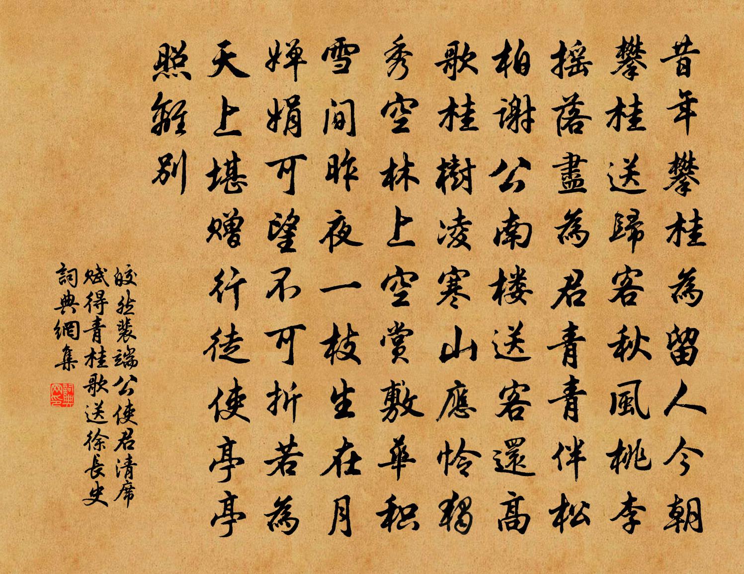 詩詞名句歷史字典書法欣賞書法字典國語詞典說文解字康熙字典古漢語字典標 題 作 者 詩 句 裴端公使君清席,賦得青桂歌送徐長史作者:皎然 朝代:唐代原文昔年攀桂為留人,今朝攀桂送歸客。秋風桃李搖落盡,為君青青伴松柏。謝公南樓送客還,高歌桂樹凌寒山。應憐獨秀空林上,空賞敷華積雪間。昨夜一枝生在月,嬋娟可望不可折。若為天上堪贈行,徒使亭亭照離別。詩詞問答問:《裴端公使君清席,賦得青桂歌送徐長史》的作者是誰?答:皎然問:該詩寫於哪個朝代?答:唐代書法欣賞裴端公使君清席,賦得青桂歌送徐長史書法作品注釋全唐詩:卷821-10詩詞推薦豫章南浦亭泊舟范成大〔宋代〕閏歲花光晚,霜朝草色荒。趁墟猶市井,收潦再耕桑。客路東西懶,江流日夜忙。長歌情不盡,一酌酹滄浪。葛仙宅胡融〔宋代〕仙翁臥雲日,種松藥爐東。千載鱗鬣古,突兀成老龍。蛻骨入霄漢,橫身飲長風。上有玄鶴巢,下有白蟻宮。先生玉壺閣頌釋正覺〔宋代〕風霜磨洗秋空清,月浴星河分外明。默默玉壺中自照,家傳清白妙難名。守鄭易陳方及境改信都過大名書呈呂太尉李復〔宋代〕淮陽閉合欲偷閒,新捧除書墨未乾。五日御風方假翼,兩河試郡別移官。生緣有定隨流易,世事無端用力難。今日南昌道中釋曉瑩〔宋代〕東遊心渺渺,趼足步遲遲。馬驛黃茅路,人家白竹籬。歸雲橫斷嶺,落日映荒陂。何地可容足,長喔招隱詩。奉和虢州劉給事使君三堂新題二十一詠北樓韓愈〔唐代〕郡樓乘曉上,盡日不能回。晚色將秋至,長風送月來。思歸二首戴復古〔宋代〕吟詩不換校書郎,但欲封侯管醉鄉。疏懶無成嵇叔夜,清狂似達賀知章。安貧不怕黃金盡,既老從教白髮長。百計蘇幕遮 春曉張玉娘〔元代〕月光微,簾影曉。庭院深沉,寶鼎余香梟。濃睡不堪聞語鳥。情逐梨雲,夢入青春杳。海棠陰,楊柳杪。疏雨寒煙壬辰十二月車駕東狩後即事元好問〔金代〕萬里荊襄入戰塵,汴州門外即荊榛。蛟龍豈是池中物,蟣虱空悲地上臣。喬木他年懷故國,野煙何處望行人?秋風琴曲歌辭。雉朝飛操張祜〔唐代〕朝陽隴東泛暖景,雙啄雙飛雙顧影。朱冠錦襦聊日整,漠漠霧中如衣絅。傷心盧女弦,七十老翁長獨眠。雄飛在草聽雪釋文珦〔宋代〕密片打窗窗自白,老翁寒坐正清吟。忽聞壓折牆頭竹,卻想山中積處深。題山驛新桐花崔櫓〔唐代〕雨餘煙膩暖香浮,影暗斜陽古驛樓。丹鳳總巢阿閣去,紫花空映楚雲愁。堪憐翠蓋奇於畫,更惜芳庭冷似秋。長日續十蟲吟舒岳祥〔宋代〕早有搖櫓郎,楚楚綠衣裳。怒目只自躁,奮臂倚枝長。附桑寄螵蛸,亦入秘術方。折之插屋壁,經時子穰穰。竹籬宮詞張公庠〔宋代〕踏青來往殊無卷,門草輸贏且少休。更上瓊樓三十級,待看春色滿皇州。輪盤菊史鑄〔宋代〕秋深籬下拆霜英,圓質風吹揚不停。天巧固非煩扁斬,日新又豈待湯銘。偈頌一百六十首釋宗杲〔宋代〕才方八月中秋,又是九月十五。唯有這個不遷,一眾耳聞目睹。佛惠寺阮閱〔宋代〕細雨斜風入亂山,濕雲堆里見東關。一筇來訪林間寺,杜寺數聲春又還。挽周希舜二首吳芾〔宋代〕末俗事浮競,夫君志不移。至誠閭里化,純孝冕旒知。恬養方安命,騫騰未濟時。一朝埋玉樹,空使萬人悲。詠被中繡鞋夏侯審〔唐代〕雲里蟾鉤落鳳窩,玉郎沈醉也摩挲。陳王當日風流減,只向波間見襪羅。宿大慈山悟真觀陳允平〔宋代〕終南道士學彈琴,門外松蘿鎖翠陰。瀕海八龍朝出洞,隔山群鹿夜歸林。琪花過雨金風澹,玉樹籠煙璧月沉。三十名句推薦輦轂繁華事可傷,師師垂老過湖湘劉子翬《汴京紀事》 待浮花、浪蕊都盡,伴君幽獨。蘇軾《賀新郎·夏景》 贈人以言,重於金石珠玉;觀人以言,美於黼黻、文章;聽人以言,樂於鐘鼓琴瑟。荀子《荀子·非相》 不吹毛而求小疵,不洗垢而察難知。韓非及後人《韓非子·大體》 十里青山遠,潮平路帶沙。數聲啼鳥怨年華。仲殊《南柯子·十里青山遠》 已見寒梅發,復聞啼鳥聲。王維《雜詩三首 / 雜詠三首》 不怕官,只怕管。施耐庵《水滸傳·第二回》 願妾身為紅菡萏。年年生在秋江上。歐陽修《漁家傲·近日門前溪水漲》 過盡千帆皆不是,斜暉脈脈水悠悠。溫庭筠《望江南·梳洗罷》 多情只有春庭月,猶為離人照落花。張泌《寄人》