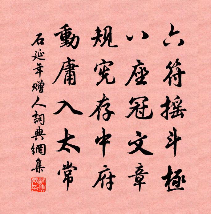 詩詞名句歷史字典書法欣賞書法字典國語詞典說文解字康熙字典古漢語字典標 題 作 者 詩 句 贈人作者:石延年 朝代:宋代贈人原文六符搖斗極,八座冠文章。規憲存中府,動庸入太常。詩詞問答問:贈人的作者是誰?答:石延年問:贈人寫於哪個朝代?答:宋代石延年贈人書法欣賞贈人書法作品詩詞推薦建炎丁未自中夏徂秋不雨七夕日戲成一詩簡牛鄭剛中〔宋代〕今夕知何夕,織女逢牽牛。雲軿擁高漢,仙事傳風流。人間適焦窘,龜兆生田疇。當時大軍後,皆抱糠籺憂。我勸浣溪沙吳潛〔宋代〕春岸春風荻已芽。推排春事到蘆花。只應推上鬢邊華。投老未歸真左計,久陰得霽且舒懷。紅紅白白有殘葩。江舍人宅筵上有妓唱和州韓舍人歌辭因以寄徐鉉〔唐代〕良宵竹絲偶成歡,中有佳人俯翠鬢。白雪飄颻傳樂府,阮郎憔悴在人間。清風朗月長相憶,佩蕙紉蘭早晚還。深夜送君去左偃〔唐代〕關河月未曉,行子心已急。佳人無一言,獨背殘燈泣。夏日宴九華池贈主人陳羽〔唐代〕池上涼台五月涼,百花開盡水芝香。黃金買酒邀詩客,醉倒檐前青玉床。冠丁謂〔宋代〕盛禮尊元服,嘉名重進賢。窮奢譏鵔鵲,極品貴貂蟬。就列峨章甫,瞻顏仰邃延。誰知遠遊制,寵錫自高天。藏春峽四首陳瓘〔宋代〕主人心地冷如灰,只把園花取次栽。峽外漫多閒雨露,直須並此入山來。太常樂章三十首其二十七第二楊億〔宋代〕偃伯靈台,功成作樂。以昭德容,以清戎索。萬邦會同,群慝簫勺。盡善盡美,侔彼韶箾。鶴鳴亭絕句四首辛棄疾〔宋代〕舊時秋水醉吟者,且作西山病叟呼。可惜黃花逢令節,樽中酒燥筆頭枯。紹興祀高禖十首佚名〔宋代〕瑞鳦至止,祀事孔時。酌以清酒,裸獻載祗。神具醉止,介我蕃禧。乃占吉夢,維熊維罷。放翁有五更讀書示子詩予亦次韻宋慶之〔宋代〕秋風蟋蟀床下鳴,茅茨耿耿秋燈明。老夫掩捲髮深喟,起視河漢初參橫。世人飲食幾知味,眼底古今復涇渭。藩籬題金陵雜興詩後十八首李璉〔宋代〕池邊石是南朝石,綠梁苔花亦可憐。今日波平人事變,白魚猶自躍天泉。句薛瑩〔唐代〕單棹橫疏雨,江灘秋泊時。花留身住越,月遞夢還秦。高士詠。荷蓧晨門吳筠〔唐代〕荷蓧隱耕藝,晨門潛抱關。道尊名可賤,理愜心彌閒。混跡是非域,縱懷天地間。同譏孔宣父,匿景杳不還。滿庭芳 離苦海,贈張二官馬鈺〔元代〕人喜成人生兒,誰成人知替你,成人被他奪了成人精神。系伊心意,唯恐不成人。養大留心何處,惜妻男、忘了伊次韻張守妻閔忌陳造〔宋代〕萊妻魂逝不容招,敢問何方處寂寥。老去更堪聽薤露,病來久不近金蕉。聲搖夜夢蛩相吊,垢翳篝衣雨輒潮。細讀桃花董嗣杲〔宋代〕占取韶光二月時,妒紅深濺謾成蹊。暗銷春恨含煙薄,靚落晨妝受雨低。憶樹自傷前度種,見花誰想去年題。武陵夜起二絕文天祥〔宋代〕惆悵高歌入睡鄉,夢中魂魄尚飛揚。起來露立頻搔首,夜靜無風自在涼。木蘭花慢(客贈牡丹)劉克莊〔宋代〕維摩居士室,晨有鵲、噪檐聲。排闥者誰歟,冶容袨服,寶髻珠瓔。疑是毗耶城裡,那天魔、變作散花人。姑射神西湖獨步沈說〔宋代〕平湖開霽色,寒碧照空心。小立背橋影,緩行隨柳陰。向年勞遠夢,到日記曾吟。荷盪成茭地,蕭蕭秋意深。名句推薦一切賢聖,皆以無為法而有差別。鳩摩羅什譯《金剛經·無得無說》 人閒桂花落,夜靜春山空。王維《鳥鳴澗》 縱使文章驚海內,紙上蒼生而已。龔自珍《金縷曲·癸酉秋出都述懷有賦》 金絡青驄白玉鞍,長鞭紫陌野遊盤。萬楚《驄馬》 佇聽寒聲,雲深無雁影。周邦彥《關河令·秋陰時晴漸向暝》 行善不以為名,而名從之;名不與利期,而利歸之;利不與爭期,而爭及之:故君子必慎為善。列子及其弟子《列子·說符》 一樹梨花一溪月,不知今夜屬何人?佚名《雜詩·舊山雖在不關身》 大兒鋤豆溪東,中兒正織雞籠。辛棄疾《清平樂·村居》 淺不足與測深,愚不足與謀智,坎井之蛙,不可與語東海之樂。荀子《荀子·正論》 萬歲山前珠翠繞,蓬壺殿里笙歌作岳飛《滿江紅·登黃鶴樓有感》