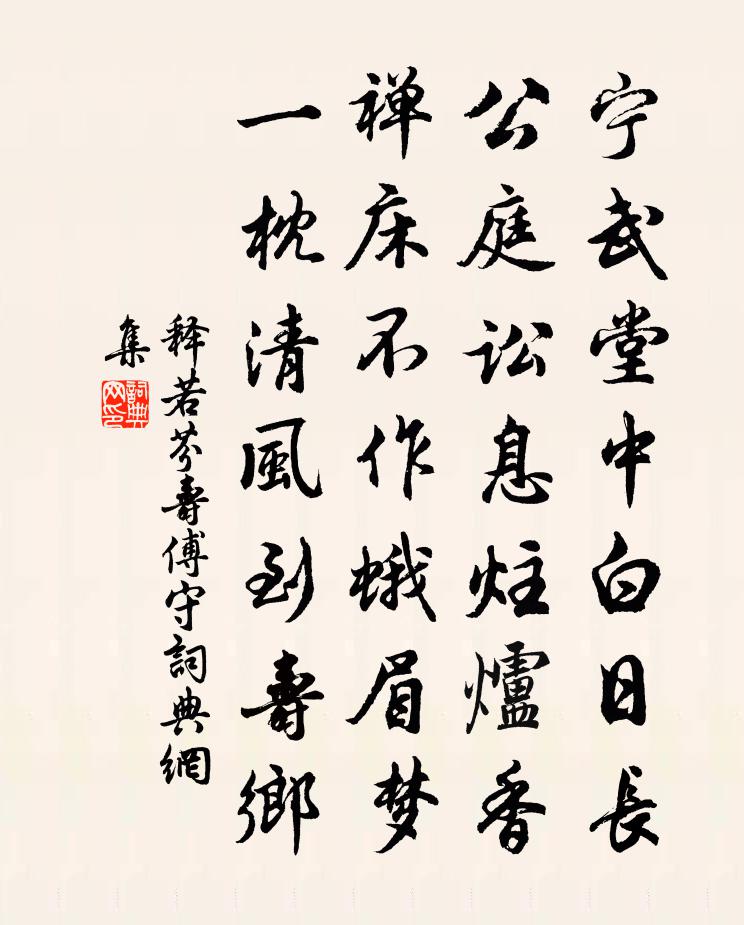 詩詞名句歷史字典書法欣賞書法字典國語詞典說文解字康熙字典古漢語字典標 題 作 者 詩 句 壽傅守作者:釋若芬 朝代:宋代壽傅守原文寧武堂中白日長,公庭訟息炷爐香。禪床不作蛾眉夢,一枕清風到壽鄉。詩詞問答問:壽傅守的作者是誰?答:釋若芬問:壽傅守寫於哪個朝代?答:宋代釋若芬壽傅守書法欣賞壽傅守書法作品詩詞推薦宿康口漁家趙汝鐩〔宋代〕陰雲議雪風颼颼,黃沙翳暝征人愁。漁家假宿休疲骨,敗蘆紉壁茅蓋頭。行營鼓角聲動地,釣翁不慣皆掩耳。刺船秋日雜興二首謝雋伯〔宋代〕高槐墮疏花,梁燕感時節。神飈駕輕翮,行計夙已決。飛鳴繞前檐,似與主人別。鳥衣隔海雲,去去避霜雪。故壘漁村雜句十首薛嵎〔宋代〕盡醉茅柴得自由,蘆花飛雪滿人頭。蓑衣碎葉重重補,聽雨吟風卒未休。入谷馬上文同〔宋代〕群山護秦隴,轉去轉幽深。嵐氣重壓眼,秋光清徹心。憑鞍吟絕壁,解帶坐高林。愛此岩泉好,臨流浣俗襟。答權載之離合詩(時為給事中)許孟容〔唐代〕史才司秘府,文哲今超古。亦有擅風騷,七聯文墨曹。聖賢三代意,工藝千金字。化識從臣謠,人推仙閣吏。如登水調歌頭魏了翁〔宋代〕艤棹漢嘉口,更盡渭城杯。凌雲山色,似為行客苦傷懷。橫出半天煙雨,鎖定一川風景,未放客船開。想見此樓上宮詞 / 宮中詞朱慶餘〔唐代〕寂寂花時閉院門,美人相併立瓊軒。含 * 說宮中事,鸚鵡前頭不敢言。書感陸游〔宋代〕人生百憂坐一官,況與群飛接羽翰。兩具吳牛給耕足,三間茅屋著身寬。焄蒿悽愴會不免,簡儉寂默差可安。康莊敬賦黃萬安肅餘五雲閣曾豐〔宋代〕一合乾坤羅萬象,中有連天雲錦帳。分光日月兩輪間,聚蔭神仙十洲上。盤緗錯縹天上無,若為雲錦如許都。媧皇又贈洛中舉子〔唐代〕少插花枝少下籌,須防女伴妒風流。坐中若打占相令,除卻尚書莫點頭。正月六日雪霽曾鞏〔宋代〕雪消山水見精神,滿眼東風送早春。明日杏園應爛熳,但須期約看花人。皇太妃閣五首蘇軾〔宋代〕九門掛月未催班,清禁風和玉漏閒。崇慶早朝銀燭下,佩環聲在五雲間。偈頌一百零九首釋可湘〔宋代〕撞出妨胎海岳昏,指天指地若無人。年年傾盡西湖水,難洗耳恭聽瞿曇滿面塵。偈頌一百零二首釋慧遠〔宋代〕老婆二八少年時,羞向人前舞枯枝。而今要嫁便改嫁,誰管傍人說是非。送趙君十絕汪莘〔宋代〕風雨黃昏自掩扉,燈前時復一噓欷。兒曹相問緣何事,為道君侯早晚歸。贈張雲容舞楊玉環〔唐代〕羅袖動香香不已,紅蕖裊裊秋煙里。輕雲嶺上乍搖風,嫩柳池邊初拂水。宣州雜詩二十首梅堯臣〔宋代〕每見昭亭壁,高璩筆墨存。丹青虛格里,雲霧碧紗痕。鳥屎常愁污。蟲絲幾為捫。貴來曾改觀,世故有誰論。老學庵北窗雜書陸游〔宋代〕定交魚鳥欲忘形,獨岸綸巾坐草亭。不恨囊中無赤仄,且欣案上有黃庭。贈東林白大師李中〔唐代〕虎溪久駐靈蹤,禪外詩魔尚濃。卷宿吟銷永日,移床坐對千峰。蒼苔冷鎖幽徑,微風閒坐古松。自說年來老病,出蘭亭四威儀釋普濟〔宋代〕行,崇山峻岭,失腳蹋翻古井。通身是口波瀾,何須三止四請。名句推薦物各為主,無所責也。李大師、李延壽《南史·列傳·卷十六》 早須清黠虜,無事莫經秋岑參《送人赴安西》 故人何在,煙水茫茫。柳永《玉蝴蝶·望處雨收雲斷》 芳草句,碧雲辭,低徊閒自思。佟世南《阮郎歸·杏花疏雨灑香堤》 雨荒深院菊,霜倒半池蓮。杜甫《宿贊公房》 燕子欲歸時節,高樓昨夜西風。晏殊《破陣子·燕子欲歸時節》 涕零雨面毀形顏,誰能懷憂獨不嘆。曹丕《燕歌行二首·其二》 十里西疇熟稻香,槿花籬落竹絲長,垂垂山果掛青黃。范成大《浣溪沙·江村道中》 遷客此時徒極目,長洲孤月向誰明。李白《鸚鵡洲》 吳姬越艷楚王妃,爭弄蓮舟水濕衣。王昌齡《採蓮曲二首》
