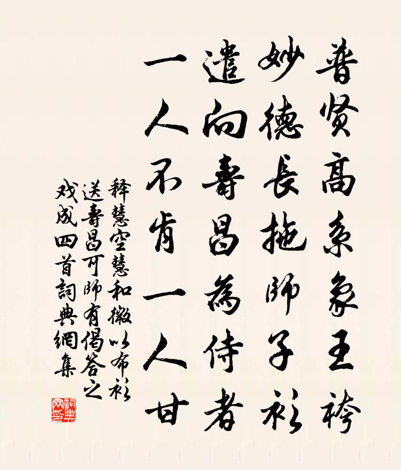 詩詞名句歷史字典書法欣賞書法字典國語詞典說文解字康熙字典古漢語字典標 題 作 者 詩 句 慧和微以布衫送壽昌可師有偈答之戲成四首作者:釋慧空 朝代:宋代原文普賢高系象王袴,妙德長拖師子衫。遣向壽昌為侍者,一人不肯一人甘。詩詞問答問:《慧和微以布衫送壽昌可師有偈答之戲成四首》的作者是誰?答:釋慧空問:該詩寫於哪個朝代?答:宋代書法欣賞慧和微以布衫送壽昌可師有偈答之戲成四首書法作品詩詞推薦養家苦馬鈺〔元代〕養家苦,喜相違。常常思想死生危。怕從前,火院圍。修行好,處無為。神珠光彩透簾幃。現靈童,相貌威。似仁澤宗芑陳著〔宋代〕來訪寄窗師,新田雨茗期。涼生開酒量,香妙醒詩脾。半日舊來話,古心他更誰。要知夢非夢,試問兩相知。累日多事不復能觀書感嘆作此詩陸游〔宋代〕我生無他長,所得靜而簡。出仕三十年,不殖一金產。四方到為家,所向不容揀。南遊極巨海,西戍掠危棧。為州宮詞王仲修〔宋代〕宮槐御柳繞池亭,水殿中間暑氣清。珠綱簾深塵不到,靜聞燕子引雛聲。雨晴吳李過園中朱翌〔宋代〕聯璧來吾隱,交歡只賀晴。酌泉心不易,指李話平生。萬木翠光合,一池春水平。更詢消遣法,元自不空聲。次韻漢卿舅臘梅范成大〔宋代〕垂垂瘦萼泫微霜,剪剪纖英鎖暗香。金雀釵頭金蛺蝶,春風傅得舊宮妝。項龍歸省宋理宗〔宋代〕清可正原得忠臣,豈覺辭官歸思匆。為道思新心甚切,難留執手意奚窮。親斟御酒資行色,更敕雲台寫范容。回到正月十九日四更起讀朱文公年譜至天大明賦十方回〔宋代〕開禧嘉定擅權臥,地下眉頭想更顰。侂遠傳衣至亡國,止緣不用讀書人。寄龍山譚使君五首黎廷瑞〔宋代〕萬里雲濤海嶠秋,倩人扶上黑雲兜。一簾新雨西樓晚,臥聽烏衣說舊愁。新晴陸游〔宋代〕掛冠湖上遂吾初,捫腹消搖適有餘。羹煮野蔬元足味,屋茨生草亦安居。市壚分熟通賒酒,鄰舍情深許借驢。更喜手影戲釋惠明〔宋代〕三尺生綃作戲台,全憑十指逞詼諧。有時明月燈窗下,一笑還從掌握來。和麟老韻五絕王炎〔宋代〕居似鷦鷯巢一枝,意如倦翼怯高飛。尚憐身是他鄉客,夢繞松楸賦式微。秋懷十首張耒〔宋代〕原野日遼闊,南山疏亭亭。夏雲斂氛翳,秋木呈疏明。幽居苦不樂,展步乘朝晴。嗟我無羽翼,何由躡崢嶸。神仙滿庭芳馬鈺〔元代〕山侗昔日,忒*暮故。肯替兒孫死去。正受艱難,忽爾風仙救度。提出迷津海,到長生、彼岸回顧。方知得,在前送人之姑蘇釋行海〔宋代〕片帆歸去百花洲,今日因君憶舊遊。澤國風煙多好景,洞庭林壑最宜秋。垂虹未霽難收景,頑石如今不點頭。記得頌四賓主釋印肅〔宋代〕大地山河眼裹塵,自古至今強立名。祗個絕邊無縫塔,不曾來往逐有情。茶中雜詠茶筍皮日休〔唐代〕褎然三五寸,生必依岩洞。寒恐結紅鉛,暖疑銷紫汞。圓如玉軸光,脆似瓊英凍。每為遇之疏,南山掛幽夢。望終南竇牟〔唐代〕日愛南山好,時逢夏景殘。白雲兼似雪,清晝乍生寒。九陌峰如墜,千門翠可團。欲知形勝盡,都在紫宸看。偈二十二首釋子淳〔宋代〕佛祖從來不奈伊,滿頭明月去還歸。雖然六戶無親識,今古何曾更間違。句謝公定〔宋代〕一官如馬小,眾眼似衫青。名句推薦蓬鬢哀吟長城下,不堪秋氣入金瘡。盧綸《逢病軍人》 風雨淒淒,雞鳴喈喈。佚名《風雨》 深居俯夾城,春去夏猶清。李商隱《晚晴》 冬夜夜寒覺夜長,沉吟久坐坐北堂。李白《夜坐吟》 五原秋草綠,胡馬一何驕。李白《塞上曲》 有美一人,清揚婉兮。佚名《野有蔓草》 戰士軍前半死生,美人帳下猶歌舞。高適《燕歌行》 天行有常,不為堯存,不為桀亡。荀子《荀子·天論》 碧水丹山映杖藜,夕陽猶在小橋西。沈周《題畫》 做弄得、酒醒天寒,空對一庭香雪。張炎《疏影·梅影》