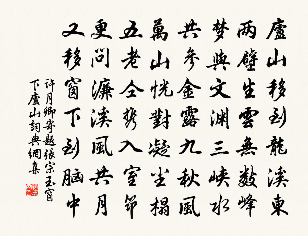 詩詞名句歷史字典書法欣賞書法字典國語詞典說文解字康熙字典古漢語字典標 題 作 者 詩 句 寄題張宗玉窗下廬山作者:許月卿 朝代:宋代寄題張宗玉窗下廬山原文廬山移到龍溪東,兩壁生雲無數峰。夢與文淵三峽水,共參金露九秋風。萬山恍對凝塵榻,五老仝攜入室筇。更問濂溪風共月,又移窗下到腦中。詩詞問答問:寄題張宗玉窗下廬山的作者是誰?答:許月卿問:寄題張宗玉窗下廬山寫於哪個朝代?答:宋代許月卿寄題張宗玉窗下廬山書法欣賞寄題張宗玉窗下廬山書法作品詩詞推薦次韻劉希顏李泰發龍井壽聖請獻辨才詩王洋〔宋代〕古人重好古,今人徒賞今。賞今拘近俗,何以勞寸心。昔者臞面仙,分符此來臨。邦君舍華軒,老人獨散襟。從容導引佚名〔宋代〕蓬萊邃館金碧照三山。真境勝人間。秋風又見芭蕉長,遺蹟在人寰。雲軒一去杳難攀。斑竹彩輿還。深宮舊監聞簫更漏子陳達叟〔宋代〕妾倚門,君上馬。殘月曉星猶掛。眉黛斂,淚珠凝。別離多少情。翠翹橫,雲鬢亂。復入綺衾猶暖。人獨自,枕成題睢陽五老圖歐陽謙之〔宋代〕厚德良多積善根,賢才他日在兒孫。當知相里非凡婿,豈有陳平久席門。五老繪圖千載譽,群公詩禮百年存。憑君寄題郭漢卿琴堂楊萬里〔宋代〕著眼飛鴻外,欹巾韻磬邊。半忘今古操,豈校有無弦。自適何須妙,能聽也則賢。如何劃然里,猶露祖生鞭。江左驛舍寄文湖陳庸〔宋代〕雲水蒼蒼日欲闌,郵亭遙憶舊家山。故人兩地分南北,幾度相思鬢為斑。唐大饗拜洛樂章禋和武則天〔唐代〕百禮崇容,千官肅事。靈降舞兆,神凝有粹。奠享鹹周,威儀畢備。奏夏登列,歌雍撤肆。蝶戀花(用韻秋懷)方岳〔宋代〕雁落寒沙秋惻惻。明月蘆花,共是江南客。騎鶴樓高邊羽急。柔情不盡淮山碧。世路只催雙鬢白。菰菜蓴羹,正自次韻子瞻和淵明飲酒二十首蘇轍〔宋代〕夢中見百怪,一一皆謂是。醉中身已忘,萬事隨亦毀。此心不應然,外物妄使爾。安心十年後,此語知非綺。賦意未暢復拾前韻之餘者作廣坐隱辭戴表元〔宋代〕我作坐隱辭,客來問我坐隱方。開門進客還復坐,為客歷落言其詳。隱朝市,我不能沖塵冒暑走遑遑。隱江湖,我夕陽洞呂願中〔宋代〕怪底浮屠不宿桑,直搜岩竇意徜徉。洞中日月未嘗老,何事仙家有夕陽。游洞霄宮韓松〔宋代〕萬木森秋晃碧宮,靈霞棲斷憬晨鐘。道人志矣黃庭界,心眼驚舊天柱峰。望江南戴復古〔宋代〕壺山好,文字滿胸中。詩律變成長慶體,歌詞漸有稼軒風。最會說窮通。中年後,雖老未成翁。兒大相傳書種在,桂台舒岳祥〔宋代〕神龍不知身變化,猶認潛鱗為故我。先生曾出雨八弦,浪靜波恬歸海臥。先生兩處領桂台,夢寐一生遊學舍。阿宜哭清遠權宰樓海司法二首李昴英〔宋代〕百里稱廉吏,誰歟起釁端。州符需賦急,軍餉及期難。節義扶澆俗,朝廷贈大官。邑人崇廟像,猶似發衝冠。漁家傲(金山)米芾〔宋代〕昔日丹陽行樂里。紫金浮玉臨無地。寶閣化成彌勒世。龍宮對。時時更有天花墜。浩渺一天秋水至。鯨鯢鼓鬣連山送裴饒歸會稽羅隱〔唐代〕金庭路指剡川隈,珍重良朋自此來。兩鬢不堪悲歲月,一卮猶得話塵埃。家通曩分心空在,世逼橫流眼未開。笑殺何處難忘酒二首王安石〔宋代〕何處難忘酒,英雄失志秋。廟堂生莽卓,岩谷死伊周。賦斂中原困,干戈四海愁。此時無一盞,難遣壯圖休。新池白居易〔唐代〕數日自穿鑿,引泉來近陂。尋渠通咽處,繞岸待清時。深好求魚養,閒堪與鶴期。幽聲聽難盡,入夜睡常遲。十八日上壽退賜坐十九日貢院錫宴二十一日紫魏了翁〔宋代〕嚴妝列衛啟宸居,百辟滔滔若貫魚。後幄宰臣先奏事,猶隨郎從立前除。名句推薦春日遲遲春草綠,野棠開盡飄香玉。李洞《繡嶺宮詞》 天生我材必有用,千金散盡還復來。李白《將進酒》 二月江南花滿枝,他鄉寒食遠堪悲。孟雲卿《寒食》 迴廊四合掩寂寞,碧鸚鵡對紅薔薇。李商隱《日射》 夜來攜手夢同游,晨起盈巾淚莫收。白居易《夢微之》 芳樹無人花自落,春山一路鳥空啼。李華《春行即興》 掩妾淚,聽君歌。李白《夜坐吟》 致虛極;守靜篤。老子《老子·道經·第十六章》 侯門一入深如海,從此蕭郎是路人。崔郊《贈去婢》 江漢思歸客,乾坤一腐儒。杜甫《江漢》