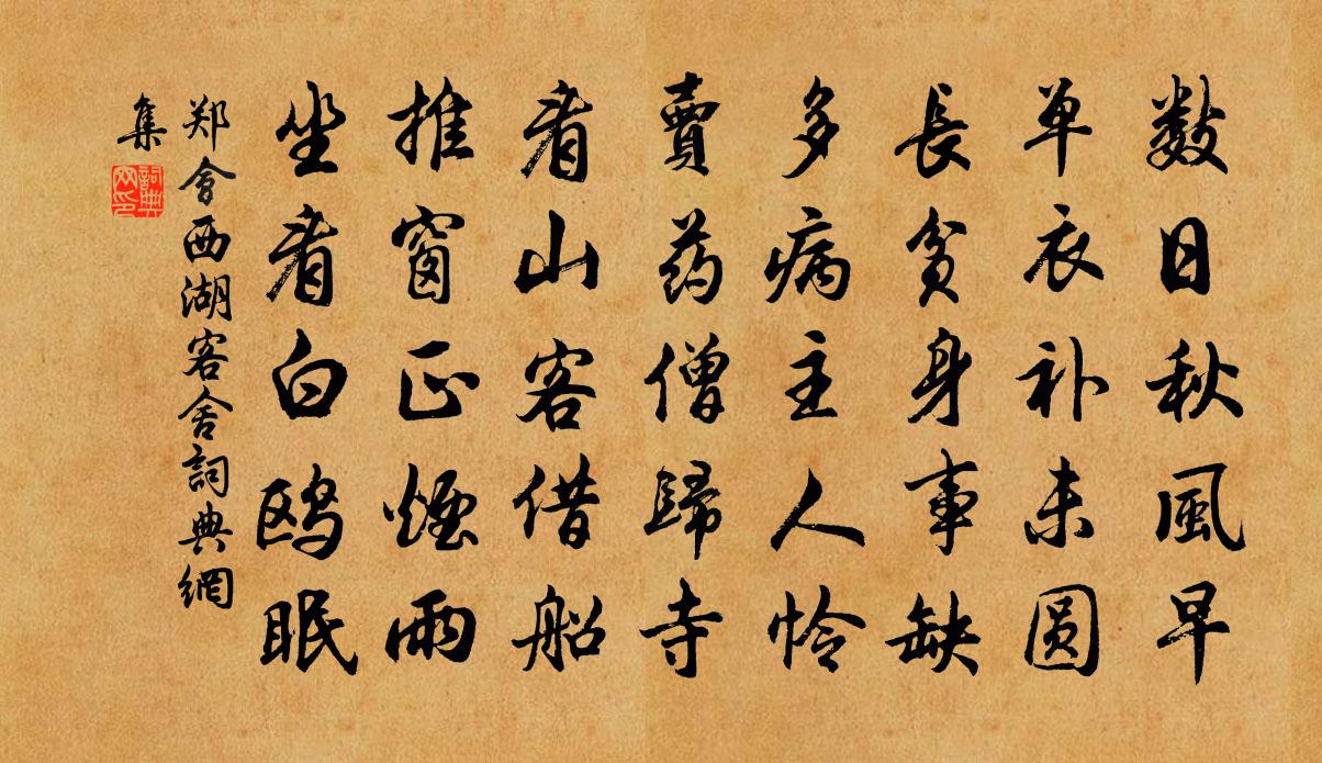 詩詞名句歷史字典書法欣賞書法字典國語詞典說文解字康熙字典古漢語字典標 題 作 者 詩 句 西湖客舍作者:鄭會 朝代:宋代西湖客舍原文數日秋風早,單衣補未圓。長貧身事缺,多病主人憐。賣藥僧歸寺,看山客借船。推窗正煙雨,坐看白鷗眠。詩詞問答問:西湖客舍的作者是誰?答:鄭會問:西湖客舍寫於哪個朝代?答:宋代鄭會西湖客舍書法欣賞西湖客舍書法作品詩詞推薦送張殿院還台石介〔宋代〕老柏森森節貫冬,頭冠獬豸號清雄。側階簪筆書王法,當路埋輪有祖風。白簡剛岩重入府,皁封切直舊留中。長安和禱富沙趙希逢〔宋代〕也知銅玉寧無璞,自是蒙金合以沙。挽首何辜聯盜械,脫身無路覓仙槎。懷珍空自經三獻,受用何嘗得五車。事業鳳棲梧/蝶戀花杜安世〔宋代〕閒上江樓初雨過。滿袖清風,微散誰知我。蓮臉佳人顏未破。沙洲兩兩鴛鴦臥。時有漁歌相應和。疊秀危橫,黛撥周十三丈約同馬三丈入青原山賦詩五首以記行趙蕃〔宋代〕游山忘襆被,喚渡已無航。隔岸初更動,緣沙數里長。大呼空亟疾,小立更微茫。莫遣眠鷗覺,笑人朝夕忙。佛教光寺王陶〔宋代〕五台山上白雲浮,雲散台高境自幽。歷代珠幡懸法界,累朝金剎列峰頭。風雷激烈龍池夜,草木淒涼雁寒秋。世路葛天民隱居葉紹翁〔宋代〕種竹成新列,移蘭即舊陰。老鐺猶有耳,古柳已無心。得句添杯滿,貪爐到夜深。篝燈聊點校,春水沒衣砧。春雪繆鑒〔宋代〕撩亂春風作陣飛,曉來餘片尚難披。細看山色空明處,應似乾坤混沌時。一轉陽和回土胍,十分清氣人詩脾。芒鞋頌證道歌證道歌釋印肅〔宋代〕有人問我解何宗,只堪搖手報伊聾。靈利衲僧須瞥地,何勞更說五家宗。送黃凝雲歸常州釋善珍〔宋代〕一住京華能幾日,故山欲去值春寒。石壇經雨草生遍,庭果落階鳥啄殘。雲表鶴聲朝返佩,林間虹氣夜開丹。仙家辛丑孟夏甲申日得雨趙孟堅〔宋代〕物理寓乘除,天存好還道。去年夏迄秋,旱枯苗盡槁。繁霜打麥根,療飢茲已兆。逾春秀葽葽,修翠搖旌葆。黃雲代秦幹上刑部張尚書楊冠卿〔宋代〕疇昔持衡水鑒清,議刑今去刻為明。坐令幾閣文書靜,馴致齋居獄訟平。疏闊漢朝新禁網,風流廷尉舊家聲。哀窮杏園送張徹侍御歸使韓愈〔唐代〕東風花樹下,送爾出京城。久抱傷春意,新添惜別情。歸來身已病,相見眼還明。更遣將詩酒,誰家逐後生。德茂晨起折花葉中眼上橫衝痛楚因詩戲之王洋〔宋代〕幽事相關略未衰,蚤乘芳露折解枝。如何引惹傷殘處,莫是喜歡攀拍時。人見花容如苦愛,花隨人意亦相欺。須知嶽麓宮道房翁卷〔宋代〕借問經行處,群仙第幾家。晴檐鳴雪滴,虛砌影梅花。香爇何年柏,芽煎未社茶。道人三四輩,相對誦南華。偈十首釋道行〔宋代〕車不械推,理無曲斷。若是此花,佛與帝釋。嚴衢道中朱繼芳〔宋代〕草白三丫路,苔青五里牌。長年畫馬客,幾兩利名鞋。斗糴隨時貴,方言到處乖。近山樵有主。童稚拾松釵。勉千里侄秋試六言四首劉克莊〔宋代〕童習好雕篆作,相業寓混成篇。猶之射者百中,勉旃原夫一聯。口占寄林子六陳藻〔宋代〕日月相催不放遲,寄詩又是去年時。近來未省開懷否,遠似從前尚皺眉。謝元願上人遠寄《檀溪集》齊己〔唐代〕白首蕭條居漢浦,清吟編集號檀溪。有人收拾應如玉,無主知音只似泥。入理半同黃葉句,遣懷多擬碧雲題。猶能挈榼晁公溯〔宋代〕挈榼吾何往,閒臨積水邊。晚紅看落日,春碧愛晴川。蜂蝶低窺酒,鳧鷖狎近船。平生五湖興,見此一欣然。名句推薦寧為蘭摧玉折,不作蕭敷艾榮。劉義慶《世說新語·言語》 會稽愚婦輕買臣,余亦辭家西入秦。李白《南陵別兒童入京》 家家乞巧望秋月,穿盡紅絲幾萬條。林傑《乞巧》 佇久河橋欲去,斜陽淚滿。吳文英《三姝媚·過都城舊居有感》 征蓬出漢塞,歸雁入胡天。王維《使至塞上》 君子務修其內而讓之於外。荀子《荀子·儒效》 聰以知遠,明以察微。司馬遷《史記·五帝本紀》 兒童急走追黃蝶,飛入菜花無處尋。楊萬里《宿新市徐公店》 無智無以成奸,其智陰也。有善無以為奸,其知存也。來俊臣《羅織經·察奸卷第八》 學而時習之,不亦說乎?佚名《論語十則》