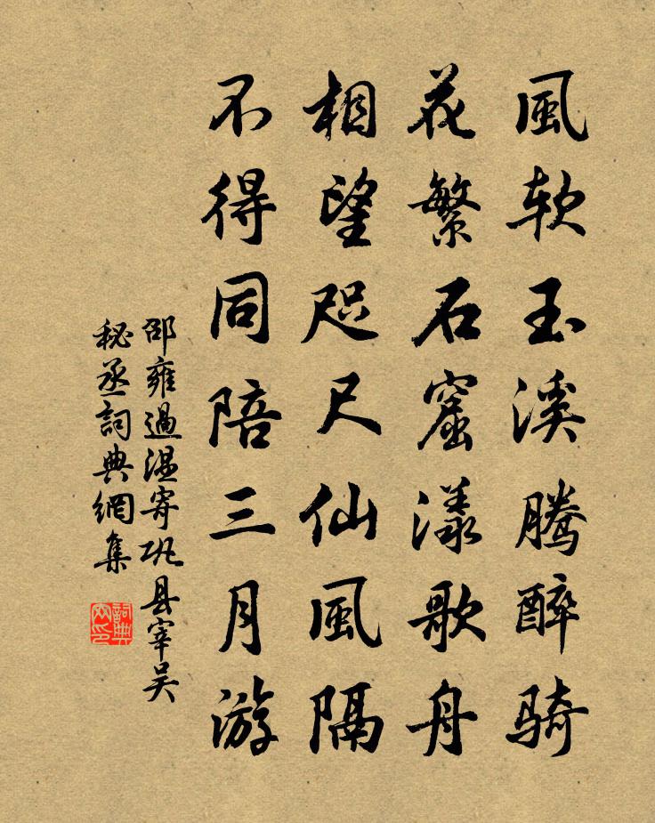 詩詞名句歷史字典書法欣賞書法字典國語詞典說文解字康熙字典古漢語字典標 題 作 者 詩 句 過溫寄鞏縣宰吳秘丞作者:邵雍 朝代:宋代過溫寄鞏縣宰吳秘丞原文風軟玉溪騰醉騎,花繁石窟漾歌舟。相望咫尺仙風隔,不得同陪三月游。詩詞問答問:過溫寄鞏縣宰吳秘丞的作者是誰?答:邵雍問:過溫寄鞏縣宰吳秘丞寫於哪個朝代?答:宋代邵雍過溫寄鞏縣宰吳秘丞書法欣賞過溫寄鞏縣宰吳秘丞書法作品詩詞推薦金陵驛文天祥〔宋代〕草合離宮轉夕暉,孤雲飄泊復何依。山河風景元無異,城郭人民半已非。滿地蘆花和我老,舊家燕子傍誰飛。從今慈姥山石崖上竹鞭梅堯臣〔宋代〕江水浸石壁,峭直無鳥蹤。穴垂青竹根,瘦蛇愁作龍。霹靂雨腳入,濕點莓苔封。世人不得用,八馬今乖慵。平原郡王南園詩二十一首西湖洞天姜特立〔宋代〕洞天別是一蓬瀛,桂館時時吹玉笙。中有仙翁長不老,不知幾個董雙成。南陽春日十首陳舜俞〔宋代〕半生名宦是塗顏,菽水當年尚可歡。鐘鼎未能光祖妣,牛羊雖美愧杯盤。五千強誦誰雲補,四十無聞得自安。不覺九鎖山十詠王易簡〔宋代〕晴矼步清空,洞戶撫巀嶭。何年出水龍,張口見齒舌。相傳此得名,靈骨蛻如雪。豈其風霆化,詰曲余故穴。想當枯菊陸游〔宋代〕龍山落帽未多時,陳跡依然使我悲。粲粲菊花何似好,階前惟見束枯枝。送僧釋文珦〔宋代〕空山草木秋,相送古原頭。倦客難為別,寒蛩替說愁。舊房深翠壁,歸路隔滄洲。後夜多明月,相思為上樓。書法蟹方後陳造〔宋代〕放麑念號鳴,易牛憐觳觫。仁心誰獨無,天機或待觸。悠悠寄宇宙,往往狥口腹。君子一飽適,庖事不到目。寧知和彥猷在華亭賦十題依韻崑山韓維〔宋代〕晉衰士不競,識者逃其名。陸生起江湖,文藻振英聲。遂令昆丘號,長配山不傾。君看玉就毀,孰與樗全生。紹興以後祀五方帝六十首佚名〔宋代〕有牲在絛,從以騂牲。或肆或將,有潔其俎。神嗜飲食,鉍鉍芬芬。莫腆於誠,神其顧歆。清平樂(炮栗)張鎡〔宋代〕蝟房秋熟。紫實包黃玉。吹葉風高銷舊綠。疏影半遮茅屋。山居未覺全貧。園收今歲盈囷。自撥磚爐松火,細煨分薄媚(入破第一)董穎〔宋代〕窣湘裙,搖漢佩。步步香風起。斂雙蛾,論時事。蘭心巧會君意。殊珍異寶,猶自朝臣未與。妾何人,被此隆恩,新移北廳因貽同院諸公兼呈暢博士盧綸〔唐代〕華軒邇台座,顧影忝時倫。弱質偃彌曠,清風來亦頻。恩輝坐凌邁,景物恣芳新。終乃愧吾友,無容私此身。讀任彥升碑李商隱〔唐代〕任昉當年有美名,可憐才調最縱橫。梁台初建應惆悵,不得蕭公作騎兵。勉兒子韋莊〔唐代〕養爾逢多難,常憂學已遲。辟疆為上相,何必待從師。送鄭公老少卿赴吉州三首仲並〔宋代〕千里能來兩鄭公,百年英烈尚遺風。笙歌少讓他時勝,犴獄應從到日空。畫戟行程春色裹,郵亭離恨雨聲中,不辭出真州文天祥〔宋代〕千金犯險脫旃裘,誰料南冠反見讎。記取小西門外事,年年上巳哭江頭。木犀初發呈張功父又和六首楊萬里〔宋代〕端能小脫簿書林,招喚詩流卜夜深。老我愁隤半山玉,憑君淺酌一荷金。水邊賞桂秋圍坐,雨後摘蔬香滿砧。乘醉和別駕喜雨四絕魏了翁〔宋代〕四山鎔日瀉黃金,誰載亭皋一尺霖。息處生機無間斷,劃然有頃驗天心。隱居二首釋文珦〔宋代〕流水保嘗有競,閒雲本亦無心。靜者不殊雲水,悠然自樂山林。名句推薦仰天大笑出門去,我輩豈是蓬蒿人。李白《南陵別兒童入京》 歸燕識故巢,舊人看新曆。王維《春中田園作》 龍蛇四海歸無所,寒食年年愴客心。屈大均《壬戌清明作》 日落君山雲氣,春到沅湘草木,遠思渺難收。張孝祥《水調歌頭·過岳陽樓作》 百畝庭中半是苔,桃花淨盡菜花開。劉禹錫《再游玄都觀》 更深人去寂靜,但照壁孤燈相映。周邦彥《關河令·秋陰時晴漸向暝》 聖人之道,寬而栗,嚴而溫,柔而直,猛而仁。劉安及其門客《淮南子·汜論訓》 醉者之墜於車也,雖疾不死。骨節與人同,而犯害與人異,其神全也。列子及其弟子《列子·黃帝》 幾硯昔年游,於今成十秋。司馬光《送龔章判官之衛州·新及第》 牆頭馬上遙相顧,一見知君即斷腸。白居易《井底引銀瓶·止淫奔也》