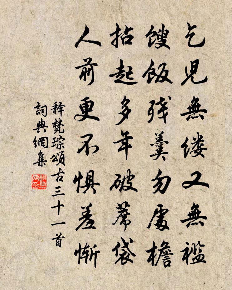 詩詞名句歷史字典書法欣賞書法字典國語詞典說文解字康熙字典古漢語字典標 題 作 者 詩 句 頌古三十一首作者:釋梵琮 朝代:宋代頌古三十一首原文乞兒無縷又無襤,餿飯殘羹勿處檐。拈起多年破蓆袋,人前更不懼羞慚。詩詞問答問:頌古三十一首的作者是誰?答:釋梵琮問:頌古三十一首寫於哪個朝代?答:宋代釋梵琮頌古三十一首書法欣賞頌古三十一首書法作品詩詞推薦贈楊佳孫舒岳祥〔宋代〕作詩意得在句先,下筆下寫意所到。世間惟俗最難醫,剖石得玉加精巧。初如面壁無所睹,一點圓明通萬竅。楊生司空平章軍國事贈太師開國正獻呂公輓辭五首蘇頌〔宋代〕漢代明經相,唐朝鎮俗賢。時方尊長孺,天遽奪公權。袞冕頒新隧,笳簫入故阡。文成內外服,二美冠周篇。留雲安驛詩郭印〔宋代〕五日留山驛,塵無一點新。瓜虀惟有醤,曲米不成春。默坐深調息,狂吟枉費神。箇中真趣在,略得自由身。次韻王解王賃地築屋陳造〔宋代〕飢麟不落毛,士生常百憂。何人金為埒,振客不待求。之子磊磈胸,貯書不貯愁。焉知奉二老,百指借岸舟。方耐抒懷上孫侍講學士宋祁〔宋代〕仆本寒鄉士,始願托田隴。偶與亨會並,遂竊空名寵。黌胄信清閒,文書無倥傯。牽絲玷外舉,挾冊陪春誦。縹帙恭州報恩長老宣公以四偈見別用韻為謝晁公溯〔宋代〕大地八風初不動,老夫自駕鐵船行。莫憂船上不知曉,無有木雞來報更。水調歌頭劉辰翁〔宋代〕江耆英。喬木南山,為人父,為眾父;光風霽月,有一天,有二天。固宜十萬戶之民,同致八千秋之祝。某俚歌水寄審知趙蕃〔宋代〕楓赤蘆花白,扁舟夜泊時。平生故人夢,細雨說相思。句高似孫〔宋代〕已是飛來鶗鴃了,可能落到牡丹開。月上海棠佚名〔宋代〕吾言勸了千千萬。無一個回頭猛烈漢。教上千般,猶道火院牽纏絆。沒計算。一限又推一限。憂兒憂女沒衣飯。指南歌子(早春感懷)王灼〔宋代〕命嘯無人嘯,含嬌何處嬌。江南煙水太迢迢。璧月瓊枝空想、夜和朝。目斷腸隨斷,魂銷骨更銷。瑣窗風雨不相饒澄心堂曾極〔宋代〕楮生玉面務深藏,未肯橫陳翰墨場。一幅降牋何用許,價高緣寫宋文章。千尺泉陳岩〔宋代〕下臨無地上連天,中有飛流涌滿泉。今我不圖今日到,詩成要檄兩龍眠。江際鄭谷〔唐代〕杳杳漁舟破暝煙,疏疏蘆葦舊江天。那堪流落逢搖落,可得潸然是偶然。萬頃白波迷宿鷺,一林黃葉送殘蟬。兵車上丞相壽戴栩〔宋代〕天地深仁不自知,物才有識荷恩私。前年倉鑰塵遮面,今日朝班笏拄頤。宛若凌虛生羽翮,了無報效及毫絲。平生靈隱慧上人惠詩為古風以贈鄭清之〔宋代〕弄翰戲墨雖佛事,炊沙作糗成飢嗔。不欲詩工與字巧,緒餘能奪道之真。心宗一了萬法具,辨才飛轉陶空輪。君不定林王安石〔宋代〕定林青木老參天,橫貫東南一道泉。六月杖藜尋石路,午陰多處弄潺湲。上元寄魯侯道輔時二公在真定吳則禮〔宋代〕留連京洛未成歸,行及北潭花絮時。樓外孤蟾吐華月,帳前小隊簇春旗。夜闌白雪回歌扇,舞徹紅燈照酒卮。更有上黃堆烽李益〔唐代〕心期紫閣山中月,身過黃堆烽上雲。年發已從書劍老,戎衣更逐霍將軍。題蔡州壺仙觀祖無擇〔宋代〕鶯老花殘過禁菸,杖藜閒步到壺仙。仙家本是無塵地,別有風光一洞天。名句推薦一苦一樂相磨練,練極而成福者,其福始久洪應明《菜根譚·概論》 清鏡無雙影,窮泉有幾重。顧況《酅公合祔輓歌》 歡宴良宵好月,佳人修竹清風。吳文英《風入松·麓翁園堂宴客》 有三秋桂子,十里荷花。柳永《望海潮·東南形勝》 清露晨流,新桐初引,多少遊春意。李清照《念奴嬌·春情》 盧家少婦鬱金堂,海燕雙棲玳瑁梁。沈佺期《古意呈補闕喬知之 / 古意 / 獨不見》 明月樓高休獨倚。酒入愁腸,化作相思淚。范仲淹《蘇幕遮·懷舊》 勸君終日酩酊醉,酒不到劉伶墳上土。李賀《將進酒》 卻愁宴罷青娥散,揚子江頭月半斜。韋莊《陪金陵府相中堂夜宴》 克城以武,戡亂以仁。張廷玉《明史·本紀·卷一》