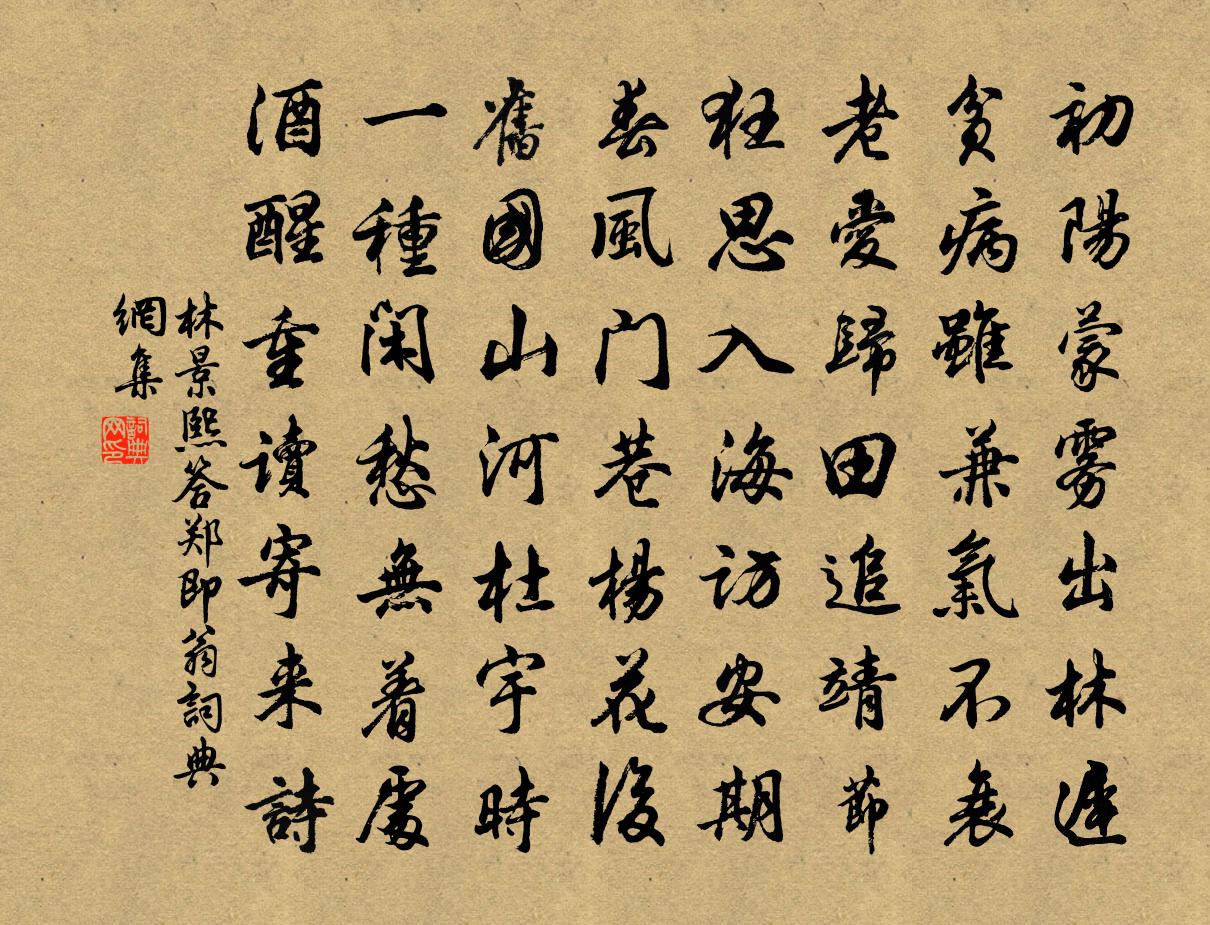 詩詞名句歷史字典書法欣賞書法字典國語詞典說文解字康熙字典古漢語字典標 題 作 者 詩 句 答鄭即翁作者:林景熙 朝代:宋代答鄭即翁原文初陽濛霧出林遲,貧病雖兼氣不衰。老愛歸田追靖節,狂思入海訪安期。春風門巷楊花後,舊國山河杜宇時。一種閒愁無著處,酒醒重讀寄來詩。詩詞問答問:答鄭即翁的作者是誰?答:林景熙問:答鄭即翁寫於哪個朝代?答:宋代林景熙答鄭即翁書法欣賞答鄭即翁書法作品詩詞推薦悟南柯 隴州防卸裴滿鎮國,因病召餘下山,丘處機〔元代〕浩浩塵埃境,翩翩幻化軀。中情不解了須臾。任意奔波,顛倒走崎嶇。逗引中丹壞,銷靡內藏虛。悲愁災患共縈紆次韻陸定遠以謫往來求詩王安石〔宋代〕牢落何由共一樽,相望空復嘆芝焚。濟時尚負生平學,慰我應多別後文。可但風流追甫白,由來家世出機雲。行吟禪人寫真求贊釋正覺〔宋代〕家風貧自慚,面孔惡人嫌。點漆之眼有角,截筒之鼻無尖。顛毛寒覆雪,項癭暗消鹽。說妙談玄兮遲鈍口觜,呵佛次韻高子明投贈二首方回〔宋代〕四時天地共成春,千古羲黃寸壤鄰。空復飛車行萬里,本無弱水隔三神。大人尺蠖同伸屈,俗物群狙易喜嗔。子欲奉和立春日侍宴內出剪彩花應制宋之問〔唐代〕金閣妝新杏,瓊筵弄綺梅。人間都未識,天上忽先開。蝶繞香絲住,蜂憐艷粉回。今年春色早,應為剪刀催。郊廟歌辭。武后大享拜洛樂章。顯和(拜洛)武則天〔唐代〕菲躬承睿顧,薄德忝坤儀。乾乾遵後命,翼翼奉先規。撫俗勤雖切,還淳化尚虧。未能弘至道,何以契明祇。海棠張煒〔宋代〕楊妃睡未足,西子妝太華。余妖媚東君,化為枝上花。嬌羞沁紅玉,裊娜揉春霞。少陵恐添愁,不欲詩句夸。壽崔帥卿七絕洪咨夔〔宋代〕紛紛傳檄方言戰,猝猝囊金又說和。誰信規摹須早定,計然半策不須多。送周漢東入都並呈徐學士子方閻學士子靜盧學方回〔宋代〕同是黃山彩藥人,相逢十載客中身。贅疣天地吾無用,萍梗江湖子亦貧。曳組定趨定馬署,揚鞭初闖玉京塵。徐閻金剛台朱翌〔宋代〕兒子門生交說勤,要翁一出步溪雲。金剛台近城三里,玉友醅新盞十分。反照江山紅半斂,小春桃李暖如薰。心灰和陶詩六首和雜詩王阮〔宋代〕遑遑行路難,汲汲艱食迫。井田邈不再,兼併蔽阡陌。永懷先父祖,遺我以清白。出門無所容,疑此天地窗。秋風和川守侍郎緱山題仙廟徐凝〔唐代〕王子緱山石殿明,白家詩句詠吹笙。安知散席人間曲,不是寥天鶴上聲。尋梅道士(一作尋梅道士張山人)孟浩然〔唐代〕彭澤先生柳,山 * 士鵝。我來從所好,停策夏雲多。重以觀魚樂,因之鼓枻歌。崔徐跡未朽,千載揖清波。詠史龔自珍〔清代〕金粉東南十五州,萬重恩怨屬名流。牢盆狎客操全算,團扇才人踞上游。避席畏聞文字獄,著書都為稻粱謀。田橫豫章南浦亭泊舟范成大〔宋代〕閏歲花光晚,霜朝草色荒。趁墟猶市井,收潦再耕桑。客路東西懶,江流日夜忙。長歌情不盡,一酌酹滄浪。西池送白二十二東歸兼寄令狐相公聯句裴度〔唐代〕促坐宴回塘,送君歸洛陽。彼都留上宰,為我說中腸。 ——裴度威鳳池邊別,冥鴻天際翔。披雲見居守,望日拜春暮思平泉雜詠二十首流杯亭李德裕〔唐代〕激水自山椒,析波分淺瀨。迴環疑古篆,詰曲如縈帶。寧愬羽觴遲,惟歡親友會。欲知中聖處,皓月臨松蓋。讀留侯傳崔塗〔唐代〕覆楚讎韓勢有餘,男兒遭遇更難如。偶成漢室千年業,唯讀圯橋一卷書。翻把壯心輕尺組,卻煩商皓正皇儲。若能贈張強赴曲江教趙汝騰〔宋代〕聖人立教,以中為常。不得中行,取獧取狂。未見狂者,吾里有張。議論傑然,名壓上庠。惡彼佞臣,請劍尚方。再次韻賦飛雪數片方回〔宋代〕雨收霰止絕纖埃,壓瘴迎豐光已開。欲積忍將靴踏去,初飄喜著袖盛來。微微糝體尋生粟,稍稍粘枝輒亂梅。不解名句推薦海闊山遙,未知何處是瀟湘柳永《玉蝴蝶·望處雨收雲斷》 自春來、慘綠愁紅,芳心是事可可。柳永《定風波·自春來》 無情燕子,怕春寒、輕失花期。晁沖之《漢宮春·梅》 心體光明,暗室中有青天;念頭暗昧,白日下有厲鬼。洪應明《菜根譚·概論》 日星隱曜,山嶽潛形;范仲淹《岳陽樓記》 枕中雲氣千峰近,床底松聲萬壑哀。曾公亮《宿甘露寺僧舍》 唯君子為能通天下之志。佚名《易傳·彖傳上·同人》 江南江北愁思,分付酒螺紅方岳《水調歌頭·平山堂用東坡韻》 一念開明,反身而誠王陽明《傳習錄·卷中·答陸原靜書》 算明朝、未了重陽,紫萸應耐看。吳文英《霜花腴·重陽前一日泛石湖》
