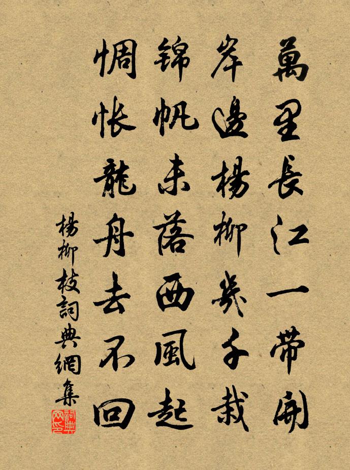 詩詞名句歷史字典書法欣賞書法字典國語詞典說文解字康熙字典古漢語字典標 題 作 者 詩 句 楊柳枝作者:佚名 朝代:宋代楊柳枝原文萬里長江一帶開,岸邊楊柳幾千栽。錦帆未落西風起,惆悵龍舟去不回。詩詞問答問:楊柳枝的作者是誰?答:佚名問:楊柳枝寫於哪個朝代?答:宋代問:佚名的名句有哪些?答:佚名名句大全佚名楊柳枝書法欣賞楊柳枝書法作品注釋全唐詩:卷786-16詩詞推薦偈頌三十六首釋如珙〔宋代〕年窮歲盡時,家家曉紙錢。滴滴落地,千神俱醉。不可作佛法商量,不可作世諦流布。若作世諦流布,瞎卻眼睛。李文饒一首劉克莊〔宋代〕畫取維州如槁葉,策禽潞將似嬰兒。九原精爽人猶畏,想見中書秉筆時。招約之職方並示正甫書記王安石〔宋代〕往時江總宅,近在青溪曲。井滅非故桐,台傾尚余竹。池塘三四月,菱蔓芙蕖馥。蒲柳亦競時,冥冥一川綠。方坻謝陸梅磵曹靖庵見和拙稿顧逢〔宋代〕梅磵先賡三體句,靖庵又和五言詩。不知二稿流傳後,能續君詩更有誰。官滿寓濟川館得葉嘉仲和朱宰梅花詩次韻雲作戴栩〔宋代〕曠野多風雪,陽和一點通。不應歌兕虎,吾道豈其窮。惠山聽松庵皮日休〔唐代〕千葉蓮花舊有香,半山金剎照方塘。殿前日暮高風起,松子聲聲打石床。風舒岳祥〔宋代〕太虛無朕兆,因物見形聲。入竹須搶地,驅潮欲打城。八方隨氣轉,萬里掃塵清。反從虎嘯生。羅監廟輓詩魏了翁〔宋代〕春風擢擢秀階庭,歲晚悠然物外身。不把簪纓傷野趣,肯迂劍騎拂天真。種成墳上一枝桂,空老堂前百歲椿。鄉里張道士求榿林詩戴表元〔宋代〕地移淮橘多成枳,人說江梅竟是柟。蜀木似榿成底用,盛時名字落江南。五泄山三學院十題俱胝岩釋鹹潤〔宋代〕昔人持此咒,岩坐歲寒深。梵言不復聞,雅名流至今。送朱明之昌叔赴尉山陽王令〔宋代〕朱使拜書天上回,去以身試百里障。青衫飄若風外荷,借馬載出塵土上。準眉嶄如見天秀,獨立系馬萬里望。身軀江郎山胡仲弓〔宋代〕巫山有石稱神女,何事江山亦號郎。豈是世情強分別,從來造化有陰陽。題舜帝廟趙汝普〔宋代〕蒼梧雲斷帝升遐,奇石江邊自古夸。莫道薰弦無逸響,雞鳴寸念亦重華。伯氏墓下葉茵〔宋代〕敬長於今我獨亡,轉頭驚見十飛霜。心乎愛矣兄如在,陟彼岡兮木已蒼。直喜克家猶有子,回思療疾苦無方。伏波江上送友仇遠〔宋代〕知爾懷親憶故州,相逢沽酒且遲留。夕陽有恨荒荒白,江水無聲泯泯流。孤鳥出潮投渚尾,野蘆飛雪壓船頭。卻愁雀劉克莊〔宋代〕恰見趨燕市,俄聞集兔園。雕籠馴養者,誰到翟公門。黃西有以清江李侯書來袁見招不果就既去西有趙文〔宋代〕地僻谷自淳,此世有羲軒。行攜二三子,讀書秋樹根。不擬山水窟,忽枉君侯轓。攜持貴人意,仆口不憚煩。居然寄呂之壽丘葵〔宋代〕一燈清夜話,覺子頗真情。世已無前輩,方予畏後生。天涯共流落,歲晚獨無成。桐下來春約,飛鴻望寄聲。代書寄京洛舊遊戴叔倫〔唐代〕今年十月溫風起,湘水悠悠生白蘋。欲寄遠書還不敢,卻愁驚動故鄉人。漁父(四)戴復古〔宋代〕漁父笑,笑何人。古來豪傑盡成塵。江山秋復春。名句推薦惜別傷離方寸亂。忘了臨行,酒盞深和淺。李清照《蝶戀花·淚濕羅衣脂粉滿》 天下皆知美之為美,斯惡已。皆知善之為善,斯不善已。老子《老子·道經·第二章》 流水落花春去也,天上人間。李煜《浪淘沙令·簾外雨潺潺》 莫避春陰上馬遲。春來未有不陰時。辛棄疾《鷓鴣天·送歐陽國瑞入吳中》 牆頭馬上遙相顧,一見知君即斷腸。白居易《井底引銀瓶·止淫奔也》 休說鱸魚堪膾,盡西風,季鷹歸未?辛棄疾《水龍吟·登建康賞心亭》 山外青山樓外樓,西湖歌舞幾時休?林升《題臨安邸》 文武之政,布在方策。其人存,則其政舉;其人亡,則其政息。子思《中庸·第二十章》 不用憑欄苦回首,故鄉七十五長亭。杜牧《題齊安城樓》 空山松子落,幽人應未眠。韋應物《秋夜寄邱員外 / 秋夜寄丘二十二員外》