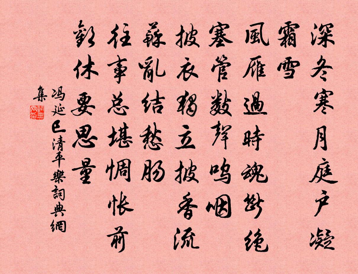 詩詞名句歷史字典書法欣賞書法字典國語詞典說文解字康熙字典古漢語字典標 題 作 者 詩 句 清平樂作者:馮延巳 朝代:唐代清平樂原文深冬寒月,庭戶凝霜雪。風雁過時魂斷絕,塞管數聲嗚咽。披衣獨立披香,流蘇亂結愁腸。往事總堪惆悵,前歡休要思量。詩詞問答問:清平樂的作者是誰?答:馮延巳問:清平樂寫於哪個朝代?答:唐代問:清平樂是什麼體裁?答:詞問:馮延巳的名句有哪些?答:馮延巳名句大全馮延巳清平樂書法欣賞清平樂書法作品詩詞推薦望月婆羅門引 為吹頭管張解愁賦王惲〔元代〕秋懷花索寞,悠花悠心事野花鷗邊。幾回崔九堂前。照眼故家風調,人物尚依然。按清商一曲,傾動華筵。新聲巧送前南昌崔令替任映攝新城縣(一作崔令映替任)羅隱〔唐代〕五年苛政甚蟲螟,深喜夫君已戴星。大族不唯專禮樂,上才終是惜生靈。亦知單父琴猶在,莫厭東歸酒未醒。二月櫂歌九章寄彭鶴林白玉蟾〔宋代〕朝汲西風餐,夜弄明月舞。萬頃碧琉璃,下有玉清府。史德夫作渚雲亭蘇養直有詩餘初未識蘇次共韻李彌遜〔宋代〕逢人但說逃禪晉,句里風煙帶九秋。七字鏗鏘快先睹,夢魂竟下荻花洲。題新宮趙蕃〔宋代〕到處江山非不佳,不歸佛屋即仙家。南山自好不歸去,落魄賦詩天一涯。減字木蘭花譚處端〔元代〕水雲皮袋。似水如雲長自在。自在閒人。閒里搜尋物外身。任行任住。色外真空閒里做。欲覓真空。只在南山盡靜南康天開圖畫樓劉過〔宋代〕樓外煙波渺去鴻,樓頭廬阜翠摩空。故知造物鋪張巧,不費丹青點染工。赤壁江山橫夜月,輞川庭館臥秋風。祗今好事近·富貴本無心胡銓〔宋代〕富貴本無心,何事故鄉輕別。空使猿驚鶴怨,誤薜蘿風月。囊錐剛要出頭來,不道甚時節。欲駕巾車歸去,有豺狼竹陳與義〔宋代〕高枝已約風為友,密葉能留雪作花。昨夜常娥更瀟灑,又攜疏影過窗紗。寄題常州東山亭二首司馬光〔宋代〕謝傅英聲高可攀,結茅積土想東山。常憂勝概一朝盡,豈信風流千古還。塵尾蒲葵供永日,酒樽棋局奉歡顏。賢侯滿庭芳 因臘月二十二日乃重陽師祖憫化妙行王丹桂〔元代〕人升霞,眾道友修齋畢,以詞贈之雪霽郊原,冰凝池沼,時當深入窮冬。重陽此日,降跡闡真風。還是丹陽師父,陪舍人兄過陳仲思溪亭深有買山卜鄰之意舍人張栻〔宋代〕築居印湘水濱,印歲月亦已久。寧知負郭東,勝處入君手。迴環煙塢深,有此溪十畝。朝暾穿林薄,荷氣薰戶牖。句黃鑒〔宋代〕游魚波上游。秋懷詩五首曾國藩〔清代〕城頭昨宵月,今夕虧其圓。丈夫矜小節,一缺誰復全。蝸廬抱奇景,高視羲皇前。蒼蠅黦尺壁,江漢誰洗蠲。馬融鳳棲梧/蝶戀花佚名〔宋代〕姑射仙人游汗漫。白鳳翩翩,銀海光凌亂。龜手兒童貪戲玩。風檐更折梅梢看。漠漠銀沙平晚岸。笑擁寒蓑,聊作水調歌頭佚名〔宋代〕來復邁七日,亨泰兆三陽。恰逢臨吉中應,浸長三陽剛。天地凝成正氣,岳瀆鍾為秀傑,玉燕紀呈祥。瑩徹冰壺操浣溪沙李清照〔宋代〕小院閒窗春己深,重簾未卷影沈沈,倚樓無語理瑤琴。遠岫出山催薄暮,細風吹雨弄輕陰,梨花欲謝恐難禁。景靈宮樂章皇帝還大次乾安之曲周麟之〔宋代〕帝將於郊,昭事上祀。爰茲畢觴,復即於次。飈斿載旋,容旌沓騎。維皇嘉承,錫祚昌熾。偈頌四十二首釋祖先〔宋代〕種種性相義,我及十方佛。乃能知是事,晝見日,夜見月。坐臥經行,曾無間歇,吽吽,有甚交涉。上十四吟十首劉克莊〔宋代〕黠兒蒙蔽聚群陰,豈料雲收杲日臨。壞證遺憂與宗社,捷書分喜到山林。擎天畢竟還高手,偃月從初謬用心。客自名句推薦亭亭畫舸系春潭,直到行人酒半酣。鄭文寶《柳枝詞》 阿婆還似初笄女,頭未梳成不許看。袁枚《遣興》 青春幾何時,黃鳥鳴不歇。李白《江南春懷》 是故,君子有終身之憂,無一朝之患也。孟子《孟子·離婁章句下·第二十八節》 何時詔此金錢會,暫醉佳人錦瑟旁。杜甫《曲江對雨》 為學無間斷,如流水行雲,日進而不已也。王永彬《圍爐夜話·第十四則》 馬思邊草拳毛動,雕眄青雲睡眼開。劉禹錫《始聞秋風》 紅板橋空,濺裙人去,依舊曉風殘月。納蘭性德《淡黃柳·詠柳》 中池所以綠,待我泛紅光。沈約《詠芙蓉》 獨眠林下夢魂好,回首人間憂患長。蘇軾《捕蝗至浮雲嶺山行疲苶有懷子由弟二首·其二》
