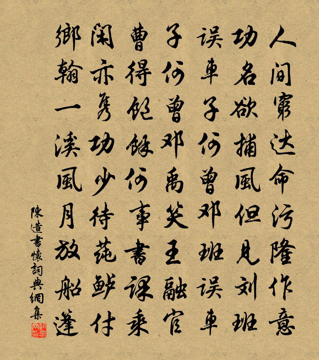 詩詞名句歷史字典書法欣賞書法字典國語詞典說文解字康熙字典古漢語字典標 題 作 者 詩 句 書懷作者:陳造 朝代:宋代書懷原文人間窮達命污隆,作意功名欲捕風。但見劉班誤車子,何曾鄧班誤車子,何曾鄧禹笑王融。官曹得飽餘何事,書課乘閒亦雋功。少待蓴鱸付鄉翰,一溪風月放船篷。詩詞問答問:書懷的作者是誰?答:陳造問:書懷寫於哪個朝代?答:宋代陳造書懷書法欣賞書懷書法作品詩詞推薦送章孝標校書歸杭州因寄白舍人楊巨源〔唐代〕曾過靈隱江邊寺,獨宿東樓看海門。潮色銀河鋪碧落,日光金柱出紅盆。不妨公事資高臥,無限詩情要細論。若訪贈鄆州馬使君韓翃〔唐代〕東方千萬騎,出望使君時。暮雪行看盡,春城到莫遲。路人趨墨幘,官柳度青絲。他日鈴齋內,知君亦賦詩。春遊李新〔宋代〕寂寂茂陵春,文園病後情。黃蜂腰欲斷,細柳眼初明。麗服駢游女,余酣失老兵。殘粧深院落,相對任卿卿。次韻章太博遷匠丞不入方岳〔宋代〕誰喚山民亦此來,蒼浪猶帶野田埃。秋風弔古琴三疊,夜雨論文酒一杯。巨筆瀉成鸚鵡賦,細書飛過鳳凰台。恨君贈胡侍郎榮歸王鑾〔宋代〕南還昔別已匆匆,日斷雲飛思欲窮。江水波涵天上下,海門潮湧浙西東。沉煙白鳥晴沙際,飄帶青山夕照中。治世贈可上人李洞〔唐代〕寺門和鶴倚香杉,月吐秋光到思嚵。將法傳來穿泱漭,把詩吟去入嵌岩。模糊書捲菸嵐滴,狼藉衣裳瀑布緘。不斷薄命佳人蘇軾〔宋代〕雙頰凝酥發抹漆,眼光入簾珠的皪。故將白練作仙衣,不許紅膏污天質。吳音嬌軟帶兒痴,無限閒愁總未知。自古送龍州田使君舊詩家李洞〔唐代〕御札軫西陲,龍州出牧時。度關雲作雪,掛棧水成澌。劍淬號猿岸,弓懸宿鶴枝。江燈混星斗,山木亂槍旗。鎖庫銓攜具賞石渠酴醾用坡韻呈同舍胡銓〔宋代〕酴醾獨殿春,得路未為晚。露時張翠傘,月蕊明玉幰。洗妝雨亦妍,暗麝風更遠。唐時真宰相,勁氣凌諫苑。危言奉別牛司理秦觀〔宋代〕堂堂先德擅才名,詞賦高凌墨客卿。之子妙齡初筮仕,好修文史繼家聲。滿路花/促拍滿路花楊 * 〔宋代〕雙眼灩秋波,兩臉凝春雪。尊前初見處,琴心絕。千磨百難,石上瓊簪折。人非天樣闊。車馬難通,奈何沒個關節閒中書適陸游〔宋代〕棋廢機心息,書捐美睡多。客來時淡話,酒後亦高歌。甚欲江湖去,無如老病何!平羌半輪月,依舊照漁蓑。江城子袁易〔元代〕爛鋪蜀錦寫烏絲。憶傾卮。燕來時。猶記半揎,雲袖見凝脂。燕子只今何處去,庭院悄,誤心期。綠蕪凋盡眾芳遲郭郎兒慢王哲〔元代〕日放銀霞,甘雨滴成珠露。昭清風、氣神同助。便致令、相守鎮相隨,更寶種三田,九轉靈丹聚。碧虛前,遍生玉在水軍宴韋司馬樓船觀妓李白〔唐代〕搖曳帆在空,清流順歸風。詩因鼓吹髮,酒為劍歌雄。對舞青樓妓,雙鬟白玉童。行雲且莫去,留醉楚王宮。南中縣令裴說〔唐代〕寂寥雖下邑,良宰有清威。苦節長如病,為官豈肯肥。山多村地狹,水淺客舟稀。上國搜賢急,陶公早晚歸。感皇恩姬翼〔元代〕雀躍拊髀行,推門放杖。齒缺支離未偎傍。屠牛牧馬,畫個葫蘆依樣。涉程途聖智、生迷惘。不識不知,如何趣向寄謝蔡松江路教黃庚〔宋代〕一別丰標又一旬,尺書多荷寄殷勤。交遊滿眼誰知憶,契闊心獨復憶君。蕙帳夢寒同夜月,松江人遠隔秋雲。明朝好事近(月岩)趙善括〔宋代〕新月巧穿山,桂樹影高群木。任使雲遮煙鎖,自春輝秋綠。我來折得最高枝,踏破一輪玉。寶斧修教園樣,放十分送道士孟郊〔唐代〕千年山上行,山上無遺蹤。一日人間游,六合人皆逢。自有意中侶,白寒徒相從。名句推薦空門寂寞汝思家,禮別雲房下九華。金地藏《送童子下山》 遙知兄弟登高處,遍插茱萸少一人。王維《九月九日憶山東兄弟 / 九月九憶山東兄弟》 古台搖落後,秋日望鄉心。劉長卿《秋日登吳公台上寺遠眺》 青山飛起不壓物,野水流來欲濕人牛殳《琵琶行》 境難足於心,盡行放下,則未有不足矣。王永彬《圍爐夜話·第一一三則》 柳鎖鶯魂,花翻蝶夢,自知愁染潘郎史達祖《夜合花·柳鎖鶯魂》 秋水時至,百川灌河。莊子及門徒《秋水(節選)》 青楓江上秋帆遠,白帝城邊古木疏。高適《送李少府貶峽中王少府貶長沙》 寒波淡淡起,白鳥悠悠下。元好問《潁亭留別》 今日獨來香徑里,更無人跡有苔錢。韓偓《寒食日重遊李氏園亭有懷》