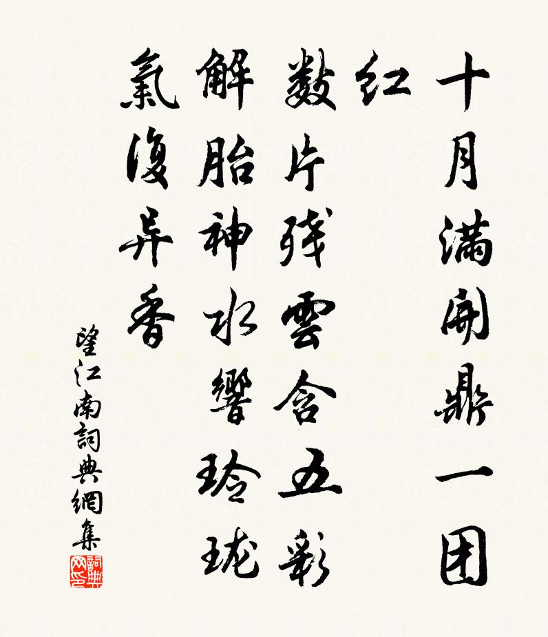詩詞名句歷史字典書法欣賞書法字典國語詞典說文解字康熙字典古漢語字典標 題 作 者 詩 句 望江南作者:佚名 朝代:宋代望江南原文十月滿,開鼎一團紅。數片殘雲含五彩,解胎神水響玲瓏。氣復異香詩詞問答問:望江南的作者是誰?答:佚名問:望江南寫於哪個朝代?答:宋代問:望江南是什麼體裁?答:詞問:佚名的名句有哪些?答:佚名名句大全佚名望江南書法欣賞望江南書法作品詩詞推薦懷無可上人雍陶〔唐代〕山寺秋時後,僧家夏滿時。清涼多古蹟,幾處有新詩。贈翁運乾陳郁〔宋代〕春陽和且澄,榆煙裊新燧。茲晨適解後,萬象獻嫵媚。悠哉高堂人,軒冕莫能累。頗珍湖海游,漸摩仁與義。因之憶秦娥汪莘〔宋代〕村南北。夜來陡覺霜風急。霜風急。征途情緒,塞垣訊息。佳人獨倚琵琶泣。一江明月空相憶。空相憶。寒衣未絮挽潘才叔母陳傅良〔宋代〕剝啄唯深夜,門前杙小船。有兒能自致,此母已堪傳。竹院前聞熟,桓楹大字懸。病懷嗟不及,健筆附諸賢。挽朱尚書貔孫文天祥〔宋代〕一代文昌貴,千年諫議名。天球聲渾厚,玄酒韻和平。岩穴思風采,朝廷惜老成。東西生死別,江水淚為傾。蓋少府新除江南尉問風俗郎士元〔唐代〕聞君作尉向江潭,吳越風煙到自諳。客路尋常隨竹影,人家大底傍山嵐。緣溪花木偏宜遠,避地衣冠盡向南。惟有過摩訶池二首宋祁〔宋代〕池邊不見帛闌船,麥隴連雲樹繞天。百歲興衰已如此,爭教東海不為田。普照寺李白〔唐代〕天台國清寺,天下為四絕。今到普照游,到來復何別。柟木白雲飛,高僧頂殘雪。門外一條溪,幾回流歲月。偈頌一百四十一首釋師範〔宋代〕秋江清淺時,白露和煙島。搘筇寂寞中,望斷無人到。新漕道中趙蕃〔宋代〕夜雨響屋瓦,曙煙遮樹林。田行疑倍滑,水度覺知深。顧望勞雙目,顛躋怖此心。垂堂不知戒,家故乏千金。初春王績〔唐代〕春來日漸長,醉客喜年光。稍覺池亭好,偏宜酒瓮香。按部至春州周敦頤〔宋代〕按部廣東經數郡,若言嵐瘴更無春。度山煙鎖埋清晝,為國天終護吉人。萬里詔音頻降下,一方恩惠盡均勻。丈夫贈鮮于伯幾方回〔宋代〕聞名今子駿,所至見公詩。數步元非過,相看豈可遲。吟鞍霜跌後,談麈日閒時。此客差同味,蕭齋許一窺。雪尤袤〔宋代〕睡覺不知雪,但驚窗戶明。飛花厚一尺,和月照三更。草木淺深白,丘塍高下平。饑民莫咨怨,第一念邊兵。賀新涼(壽吳梘郡)佚名〔宋代〕共審挽七日之書雲,西方生妙喜佛;占四明之福地,南極現老人星。人歌海沂之康,天錫河沙之算。太守與我同理和津喜雪二首吳芾〔宋代〕我愛平湖繞碧山,山光倒碧到樽前。同云何事迷千嶂,飛雪俄然蔽一川。縱使玉樓從地涌,便教銀闕與天連。到頭與子野過永仙觀循西城以歸邂逅李戒甫夕山西仇遠〔宋代〕一笑相逢李伯時,樹陰匝地綠雲低。林梢落日猶余丈,天下好山多在西。我醉欲歸須客送,君裝已趣尚鵑啼。明朝和孫端叟蠶首十五首其二織室梅堯臣〔宋代〕常聞漢皇后,織室數來觀。宮女豈不勤,帝袞得以完。亦將成纁黃,非用競龍鸞。意在奉宗廟,後人其可安。送汲助教醫博釋子淳〔宋代〕未到毗耶城,不識維摩病。有客兮良醫,妙術通神聖。金鍼鍼起髑髏吟,此曲千年誰與並。次韻陳海州乘槎亭蘇軾〔宋代〕人事無涯生有涯,逝將歸釣漢江槎。乘桴我欲從安石,遁世誰能識子嗟。日上紅波浮碧巘,潮來白浪卷青沙。清談名句推薦旅館寒燈獨不眠,客心何事轉悽然。高適《除夜作》 終罷斯結廬,慕陶直可庶。韋應物《東郊》 若得山花插滿頭,莫問奴歸處。嚴蕊《卜運算元·不是愛風塵》 柳梢聽得黃鸝語,此是春來第一聲。楊載《到京師》 浮雲一別後,流水十年間。韋應物《淮上喜會梁川故人 / 淮上喜會梁州故人》 樓頭殘夢五更鐘,花底離情三月雨。晏殊《玉樓春·春恨》 前年過代北,今歲往遼西薛道衡《昔昔鹽》 千錘萬鑿出深山,烈火焚燒若等閒。于謙《石灰吟》 為川者決之使導,為民者宣之使言。左丘明《國語·周語·邵公諫厲王弭謗》 青山隱隱水迢迢,秋盡江南草未凋。杜牧《寄揚州韓綽判官》