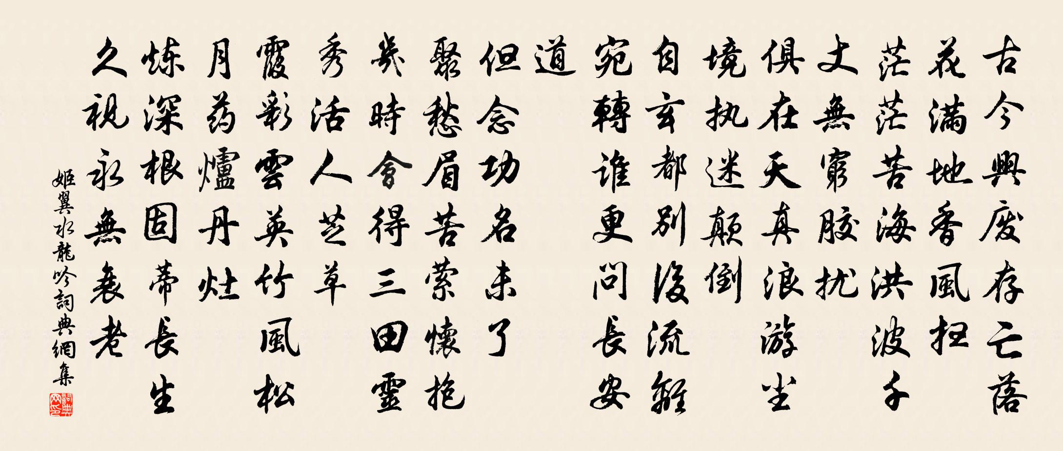 詩詞名句歷史字典書法欣賞書法字典國語詞典說文解字康熙字典古漢語字典標 題 作 者 詩 句 水龍吟作者:姬翼 朝代:元代水龍吟原文古今興廢存亡,落花滿地香風掃。茫茫苦海,洪波千丈,無窮膠擾。俱在天真,浪遊塵境,執迷顛倒。自玄都別後,流離宛轉,誰更問,長安道。但念功名未了。聚愁眉、苦縈懷抱。幾時會得,三田靈秀,活人芝草。霞彩雲英,竹風松月,藥爐丹灶。煉深根固蒂,長生久視,永無衰老。詩詞問答問:水龍吟的作者是誰?答:姬翼問:水龍吟寫於哪個朝代?答:元代問:水龍吟是什麼體裁?答:詞姬翼水龍吟書法欣賞水龍吟書法作品詩詞推薦夜聞獨鳥啼韋應物〔唐代〕失侶度山覓,投林舍北啼。今將獨夜意,偏知對影棲。開歲頗思江湖游適陸游〔宋代〕健筆當年賦遠遊,即今侷促但堪羞。雖為月下孤舟客,未醉天涯七澤秋。丹熟竟當金換骨,客來從笑雪蒙頭。龍泉雜言謝陶〔唐代〕天不與人言,禍福能自至。水火雖活人,暫不得即死。蹈之焚斯須,憑之溺容易。水火與禍福,豈有先言耳。寄主客張郎中姚合〔唐代〕年長方慕道,金丹事參差。故園歸未得,秋風思難持。蹇拙公府棄,朴靜高人知。以我齊杖屨,昏旭詎相離。吟詩賦得胥台露庾抱〔唐代〕胥台既落構,荊棘稍侵扉。棟拆連雲影,梁摧照日暉。翔軍鳥逐不及,巢燕反無歸。唯有團階露,承曉共沾衣。賣花聲 題岳陽樓張舜民〔宋代〕木葉下君山。空水漫漫。十分斟酒斂芳顏。不是渭城西去客,休唱陽關。醉袖撫危闌。天淡雲閒。何人此路得生還和新市雜詠趙希逢〔宋代〕拚醉秦樓頭強扶,樽空還更問當罅。興闌夢覺明朝路,山色煙中半有無。向秀徐鈞〔宋代〕心慕莊書善說玄,發明奇趣理昭然。世人竊取公遺論,卻把前言作己言。送杭州使君蘇內相先生某用先生舊詩方丈仙人李廌〔宋代〕邇臣均勞逸,方面乃毗倚。細人怙權寵,補外習為恥。餘杭股肱郡,湖山真信美。意雅如望之,肯效倪若水。西梁山下泊船懷別潤州杲上人林逋〔宋代〕畫圖行李是隨緣,立別江頭兩霽天。鐵瓮獨歸三月寺,銅瓶輕掛兩潮船。吟焚篆籀香初竭,老擁雲霞衲已穿。昨夜旅次湘沅有懷靈均孟郊〔唐代〕分拙多感激,久游遵長途。經過湘水源,懷古方踟躕。舊稱楚靈均,此處殞忠軀。側聆故老言,遂得旌賢愚。名參次李提舉過南園飲散賦詩韻曹勛〔宋代〕小山叢薄棲南郭,蘭若蔽虧如間錯。竹色低侵几案涼,海雲常壓波濤惡。遣愁五字了未有,取醉一樽良可托。折簡眾議留李師煉丹既而不果葉適〔宋代〕火養經年汞未收,病身還向急時求。道人別覓安爐地,今夜潮平下館頭。七月十日雨炎暑頓解有感張耒〔宋代〕空山風雨夕,微雨淒房櫳。徂年兆搖落,感嘆白頭翁。謫居困炊玉,無田願年豐。欲持一杯酒,旁舍慶老農。烈日重九日游南山峽覺海寺李昴英〔宋代〕恰重陽日到南山,小摘黃花供綠樽。鍾叩一聲蕭寺晚,移舟載月過前灣。病起陳著〔宋代〕西風喚起眼中仙,竹榻饒涼不愛眠。數樹秋聲窗著雨,一簾山影屋浮煙。案頭古帖無完紙,壁上焦琴不具弦。小摘挽徐提舉夫人盧氏趙蕃〔宋代〕進已後師說,中猶親母儀。百年蘄未已,一病乃無醫。令子高交友,韓公直筆辭。是為能不腐,雖死亦期頤。織圖二十四首下蠶樓璹〔宋代〕穀雨無幾日,谿山暖風高。華蠶初破殼,落紙細於毛。柔桑摘蟬翼,簌簌才容刀。茅檐紙窗明,未覺眼力勞。送福建李大夫薛能〔唐代〕洛州良牧帥甌閩,曾是西垣作諫臣。紅旆已勝前尹正,尺書猶帶舊絲綸。秋來海有幽都雁,船到城添外國人。行過偶吟遣懷向敏中〔宋代〕昔為宰輔居黃閣,今作元戎控夏台。萬里蒼黔漸受賜,一方清晏有何才。紫宸杳杳彌年別,紅旆翩翩映日開。將相名句推薦冀枝葉之峻茂兮,願俟時乎吾將刈。屈原《離騷》 九日黃花酒,登高會昔聞。岑參《奉陪封大夫九日登高》 善有善報,惡有惡報。佚名《增廣賢文·上集》 秋鬢含霜白,衰顏倚酒紅。尹式《別宋常侍》 樓前綠暗分攜路,一絲柳、一寸柔情。吳文英《風入松·聽風聽雨過清明》 粗繒大布裹生涯,腹有詩書氣自華。蘇軾《和董傳留別》 人語西風,瘦馬嘶殘月。王國維《蝶戀花·滿地霜華濃似雪》 松樹千年終是朽,槿花一日自為榮。白居易《放言五首·其五》 無為在歧路,兒女共沾巾。王勃《送杜少府之任蜀州 / 送杜少府之任蜀川》 貴名不可以比周爭也,不可以誇誕有也,不可以勢重脅也荀子《荀子·儒效》