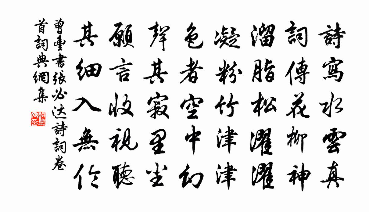 詩詞名句歷史字典書法欣賞書法字典國語詞典說文解字康熙字典古漢語字典標 題 作 者 詩 句 書張必達詩詞卷首作者:曾豐 朝代:宋代書張必達詩詞卷首原文詩寫水雲真,詞傳花柳神。溜脂松濯濯,凝粉竹津津。色者空中幻,聲其寂里塵。願言收視聽,其細入無倫。詩詞問答問:書張必達詩詞卷首的作者是誰?答:曾豐問:書張必達詩詞卷首寫於哪個朝代?答:宋代曾豐書張必達詩詞卷首書法欣賞書張必達詩詞卷首書法作品詩詞推薦題彭城館畫屏王炎〔宋代〕玉質青青竹弟,冰姿皎皎梅兄。上有大夫長鬣,歲寒誰更同盟。和張監觀赦張說〔唐代〕日御臨雙闕,天街儼百神。雷茲作解氣,歲復建寅春。喜候開星驛,歡聲發市人。金環能作賦,來入管弦聲。俳諧李商隱〔唐代〕短顧何由遂,遲光且莫驚。鶯能歌子夜,蝶解舞宮城。柳訝眉雙淺,桃猜粉太輕。年華有情狀,吾豈怯平生。同崔十八寄元浙東王陝州白居易〔唐代〕未能同隱雲林下,且復相招祿仕間。隨月有錢勝賣藥,終年無事抵歸山。鏡湖水遠何由泛,棠樹枝高不易攀。惆悵至潁州訪故老李曾伯〔宋代〕去汴五百里,通淮十八村。荒原王翦骨,廢井伍奢魂。舊築河南塢,新城塞北屯。百年上遺愛在,六一故碑存。悼八嬸孺人鄭剛中〔宋代〕當年棗栗奉高堂,憔悴俄驚哭杞梁。目見兩孤成乳酪,坐聞一節勝冰霜。仙遊已作朝霞會,塵世空將舊屨藏。莫問和傅山父小園十詠李曾伯〔宋代〕蒼苔跡在堂無燕,綠水痕生沼自魚。回首釣游徒感慨,何時復古喜而書。句范寅亮〔宋代〕寺藏螺髻頂,人在藕花心。鄧器先北窗曾協〔宋代〕今人競圖南,朗朗百間屋。夫子胡不然,向晦一窗足。北窗吾亦愛,嘗謂所樂獨。豈知交遊中,昌歜或同欲。光澄愛詔修書述懷感事三十韻楊億〔宋代〕太極垂裳日,中原偃革初。樓船秋發詠,衡石夜程書。好問虛前席,徵賢走傳車。蓬萊侔漢製,煨燼訪秦餘。紬繹故致政宣義葉公輓詞韓元吉〔宋代〕植德由來不自知,成家今風聹馨兒。名駒有種能千里,仙桂騰芳定五枝。彩綬螭坳方致養,素車雲路忽興悲。死生龜溪即事五首高斯得〔宋代〕頑雲蔀鶴嶺,積雪明龜溪。枌榆社已到,斯焉卜幽棲。亦有好事人,除館溪之西。門巷寄深窈,青山有攀躋。平生漫興黃庭堅〔宋代〕肉食傾人如出凡,藜羹賦我是朝三。曉來不倦聽衙鼓,雲里捲簾山正南。雪中六解姜夔〔宋代〕曾泛扁舟詣石湖,恍然坐我范寬圖。天寒遠掛一行雁,三十六峰生玉壺。春暮思平泉雜詠二十首。望伊川(自此並淮南作)李德裕〔唐代〕遠村寒食後,細雨度川來。芳草連谿合,梨花映墅開。槿籬懸落照,松徑長新苔。向夕亭皋望,游禽幾處回。送謝刑部使君赴召胡仲弓〔宋代〕擿奸方喜俗無嘩,一札飛來墨敕斜。職業已升金掌貴,吏民空擁彩旗遮。疑車趣召二千石,輿頌觀傳十萬家。桃李好事近范成大〔宋代〕昨夜報春來,的皪嶺梅開雪。攜手玉人同賞,比看誰奇絕。闌乾倚遍憶多情,怕角聲嗚咽。與折一枝斜戴,襯鬢雲留題授上人曲肱齋汪澈〔宋代〕一室安貼缽,{左禿右貴}然了性空。曲肱忘世夢,行腳本家風。山靜人稀到,窗開意不窮。我來頻假寐,樂亦在寄陳彥邦二首吳芾〔宋代〕不須細細說行藏,四十年來夢一場。我得放歸心已足,君能勇退道尤光。閒中倍覺林泉好,鬧里誰知日月長。我已送王錄事赴任蘇州(即舍人堂弟)盧綸〔唐代〕古堤迎拜路,萬里一帆前。潮作澆田雨,雲成煮海煙。吏閒唯重法,俗富不憂邊。西掖今宵詠,還應寄阿連。名句推薦綠波春浪滿前陂,極目連雲稏肥。韋莊《稻田》 玉皇開碧落,銀界失黃昏。毛滂《臨江仙·都城元夕》 行路難,不在水,不在山,只在人情反覆間。白居易《太行路》 雪霏霏,風凜凜,玉郎何處狂飲?魏承班《滿宮花·雪霏霏》 燕山雪花大如席,片片吹落軒轅台。李白《北風行》 笙歌散後酒初醒,深院月斜人靜。司馬光《西江月·寶髻松松挽就》 舊山松竹老,阻歸程。岳飛《小重山·昨夜寒蛩不住鳴》 罪己宜苛,人憐不致大害。來俊臣《羅織經·保身卷第七》 蜀國曾聞子規鳥,宣城還見杜鵑花。李白《宣城見杜鵑花 / 子規》 帆影依依楓葉外,灘聲汩汩碓床間查慎行《雨過桐廬》