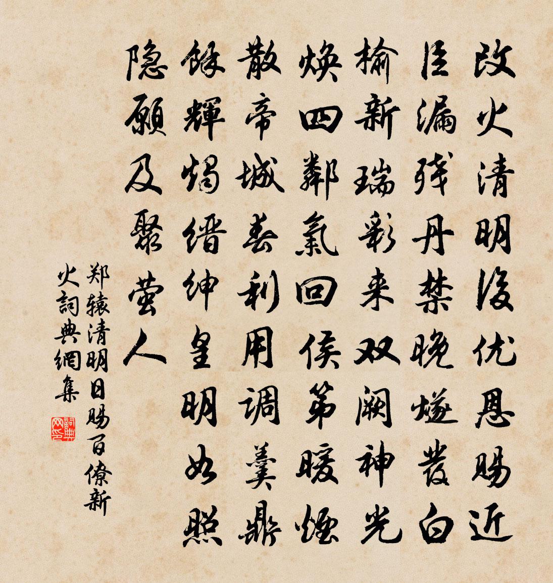 詩詞名句歷史字典書法欣賞書法字典國語詞典說文解字康熙字典古漢語字典標 題 作 者 詩 句 清明日賜百僚新火作者:鄭轅 朝代:唐代清明日賜百僚新火原文改火清明後,優恩賜近臣。漏殘丹禁晚,燧發白榆新。瑞彩來雙闕,神光煥四鄰。氣回侯第暖,煙散帝城春。利用調羹鼎,餘輝燭縉紳。皇明如照隱,願及聚螢人。詩詞問答問:清明日賜百僚新火的作者是誰?答:鄭轅問:清明日賜百僚新火寫於哪個朝代?答:唐代鄭轅清明日賜百僚新火書法欣賞清明日賜百僚新火書法作品注釋全唐詩:卷281_13詩詞推薦觀水嘆二首楊萬里〔宋代〕我方臥舟中,仰讀淵明詩。忽聞灘聲急,起視惟恐遲。八月濺飛雪,清覽良獨奇。好風從天來,翛然吹我衣。涼生歷陽壯士勤將軍名思齊歌李白〔唐代〕歷陽壯士勤將軍,神力出於百夫,則天太后召見,奇之,授游擊將軍,賜錦袍玉帶,朝野榮之。後拜橫南將軍。大漢宮春周紫芝〔宋代〕然如身在孤山,雪後園林、水邊籬落,使人神氣俱清。又明日,乃作此詞歌於妙香寮中,亦仆西來一可喜事也香滿漱玉軒為邑之佳處頃春祝寺僧少葺之重來則眼李石〔宋代〕知是禪師琢玉工,玉聲猶作水玲瓏。琢成大士笑無語,只在聲聞一悟中。晚春嚴少尹與諸公見過王維〔唐代〕松菊荒三徑,圖書共五車。烹葵邀上客,看竹到貧家。鵲乳先春草,鶯啼過落花。自憐黃髮暮,一倍惜年華。晨日湖{左氵右父}至青日有數老父攜筐筥拜道岳珂〔宋代〕路傍迎拜正紛紛,尚憶鋤山話事因。老去可憐心尚在,姓稀猶是耳曾聞。驛追少日傳行客,犬吠多年絕過軍。慚愧青玉案(守歲)薛泳〔宋代〕一盤消夜江南果。吃果看書只清坐。罪過梅花料理我。一年心事,半生牢落,盡向今宵過。此身本是山中個。才出譴瘧鬼韓愈〔唐代〕屑屑水帝魂,謝謝無餘輝。如何不肖子,尚奮瘧鬼威。乘秋作寒熱,翁嫗所罵譏。求食歐泄間,不知臭穢非。醫師寄黃景詠陳藻〔宋代〕仙翁早歲學吾鄉,我到衰年客仞牆。柳下和風今有惠,江西詩派又傳黃。幽居眾仰仁山靜,默坐身回佛日光。人世精列曹操〔魏晉〕厥初生,造劃之陶物,莫不有終期。莫不有終期。聖賢不能免,何為懷此憂?願螭龍之駕,思想崑崙居。思想崑崙章台月/一斛珠李彭老〔宋代〕露輕風細。中庭夜色涼如水。荷香柳影成秋意。螢冷無光,涼入樹聲碎。玉簫金縷西樓醉。長吟短舞花陰地。素娥紹熙辛亥六月中伏日出郭觀稼小休野石讀仲權滕鎮〔宋代〕身傍蓬萊近紫清,巧言一出忽職笙。祗今家食應無恙,書傅衡陽雁寄聲。青松贈林子歐陽修〔宋代〕青松生而直,繩墨易為功。良玉有天質,少力磨與◇。子誠懷美材,但未遭良工。養育既堅好,英華充厥中。於誰送牛尾狸與徐使君(時大雪中。)蘇軾〔宋代〕風卷飛花自入帷,一樽遙想破愁眉。泥深厭聽雞頭鶻,(蜀人謂泥滑滑為雞頭鶻。)酒淺欣嘗牛尾狸。通印子魚猶上湖田館南樓憶朱宴劉長卿〔唐代〕漂泊日復日,洞庭今更秋。白雲如有意,萬里望孤舟。何事愛成別,空令登此樓。天光映波動,月影隨江流。鶴唳洛中送韓七中丞之吳興口號五首劉禹錫〔唐代〕昔年意氣結群英,幾度朝回一字行。海北江南零落盡,兩人相見洛陽城。自從雲散各東西,每日歡娛卻慘淒。離別關河令周邦彥〔宋代〕秋陰時晴向暝。變一庭淒冷。佇聽寒聲,雲深無雁影。更深人去寂靜。但照壁、孤燈相映。酒已都醒,如何消夜永次韻答馬中玉三首黃庭堅〔宋代〕仁氣已蒸全楚盡,同雲欲合暮江前。爭春梅柳無三月,對雪樽罍屬二天。元應善利真人祠唐仲友〔宋代〕丹符列素奏,黃水晞雲漿。吾道固谷傳,世人殊可傷。授汝紫陽周,語爾茅山楊。食之仙人芝,引袂同飛翔。火田鄭次山貧士也有燕坐之處五為賦之觀小陳文蔚〔宋代〕一息萬里馳,白日天無光。歸來固吾圉,宇泰生吉祥。名句推薦待到秋來九月八,我花開後百花殺。黃巢《不第後賦菊》 綠波春浪滿前陂,極目連雲稏肥。韋莊《稻田》 黃衫飛白馬,日日青樓下。陳克《菩薩蠻·赤闌橋盡香街直》 黃雲萬里動風色,白波九道流雪山。李白《廬山謠寄盧侍御虛舟》 右手畫圓,左手畫方,不能兩成。韓非及後人《韓非子·功名》 笙歌散盡遊人去,始覺春空。歐陽修《採桑子·群芳過後西湖好》 江涵秋影雁初飛,與客攜壺上翠微。杜牧《九日齊山登高》 願得此身長報國,何鬚生入玉門關。戴叔倫《塞上曲二首·其二》 群居防口,獨坐防心。佚名《增廣賢文·下集》 曉風催我掛帆行,綠漲春蕪岸欲平。查慎行《曉過鴛湖》