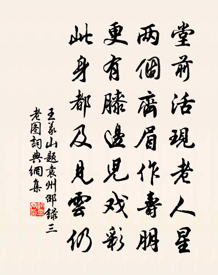 詩詞名句歷史字典書法欣賞書法字典國語詞典說文解字康熙字典古漢語字典標 題 作 者 詩 句 題袁州邵錄三老圖作者:王義山 朝代:宋代題袁州邵錄三老圖原文堂前活現老人星,兩個齊眉作壽朋。更有膝邊兒戲彩,此身都及見雲仍。詩詞問答問:題袁州邵錄三老圖的作者是誰?答:王義山問:題袁州邵錄三老圖寫於哪個朝代?答:宋代王義山題袁州邵錄三老圖書法欣賞題袁州邵錄三老圖書法作品詩詞推薦秋社陸游〔宋代〕雨余殘日照庭槐,社鼓冬冬賽廟回。又見神盤分肉至,不堪沙雁帶寒來。書因忌作閒終日,酒為治聾醉一杯。記取欲卜庵居未有勝地作詩識之陸游〔宋代〕破裘百結鬢垂蓬,旋過流年旋已空。魔眷屬如雲盡散,性光明似日方中。極知萬事不勞問,欲住一庵誰與同?會向享先農樂章。肅和佚名〔唐代〕樽彝既列,瑚簋方薦。歌工載登,幣禮斯奠。肅肅享祀,顒顒纓弁。神之聽之,福流寰縣。漁家傲(次韻贈戴時行)王灼〔宋代〕漠漠郊原荒宿草。黃花趁得秋風早。萬里岷峨歸夢到。東籬好。未應花似行人老。古往今來成一笑。為君醉里銷沈至德中贈內兄劉贊盧綸〔唐代〕時難訪親戚,相見喜還悲。好學年空在,從戎事已遲。聽琴泉落處,步履雪深時。惆悵多邊信,青山共有期。沁園春陸游〔宋代〕一別秦樓,轉眼新春,又近放燈。憶盈盈倩笑,纖纖柔握,玉香花語,雪暖酥凝。念遠愁腸,傷春病思,自怪平生如夢令·一晌凝情無語王之道〔宋代〕一晌凝情無語,手捻梅花何處。倚竹不勝愁,暗想江頭歸路。東去東去,短艇淡煙疏雨。書喜陸游〔宋代〕雨足郊原正得晴,地綿萬里盡春耕。陰陰阡陌桑麻暗,軋軋房櫳機杼鳴。亭鼓不聞知盜息,社錢易歛慶秋成。天公句劉昌詩〔宋代〕可堪添客恨。泉聲長帶佩聲寒。野徑縈迴路百盤。四塊玉侯善淵〔元代〕一點皎然冰玉潔。浩劫無生滅。跨古騰今無暫歇。遍極目,真空攝。此法方知通妙訣。玄理人難別。兩路曹溪分關題幽獨居楊備〔宋代〕金檢書殘石壁雲,二名幽獨彼何人。春深草沒松門路,泉下詩猶感鬼神。湖北驛中偶成馬祖常〔元代〕江田稻花露始零,浦中蓮子青復青。楚船祠龍來買酒,十幅蒲帆上洞庭。羅衣薰香錢滿篋,身是揚州販鹽客。明年次韻杜監簿方岳〔宋代〕杜曲無邊風露秋,瓮頭酒熟了無憂。一詩連夜穿兵衛,略似齊城戰火牛。草蟲佚名〔先秦〕喓喓草蟲,趯趯阜螽。未見君子,憂心忡忡。亦既見止,亦既覯止,我心則降。陟彼南山,言采其蕨。未見君子,猗猗堂下竹孔武仲〔宋代〕猗猗堂下竹,我來初萌芽。生意甚蹇薄,才能出泥沙。狂霖一夕作,霹靂連轟車。回首未幾日,其成何速耶。修然禪人寫師真請贊釋慧遠〔宋代〕畫出不堪,棄智雜毒。贊之不是,厭身桎梏。一十三處坐道場,二時粥飯何曾足。日裹夜行,投明暗宿。送家安國赴成都教授三絕蘇轍〔宋代〕城西社下老劉君,春服舞雩今幾人。白髮弟兄驚我在,喜君遊宦亦天倫。〈微之先生門人,惟仆與子瞻兄、復禮與次韻鮮于伯幾秋懷長句方回〔宋代〕逾燕涉漠將十霜,西風滿眼榆林黃。時逢北客話圍場,鞍馬意氣猶揚揚。駱駝紅乳蒲萄酒,袒割一醉千百觴。君今閱世陳藻〔宋代〕道理初從紙上求,因而處世得優遊。於今但閱人間世,自有文章筆下流。詠史下諸葛孔明八首陳普〔宋代〕褒斜邸閣可一飯,河渭安流漕九州。天首馬謖又霖雨,倍費心思作木牛。名句推薦酒已都醒,如何消夜永!周邦彥《關河令·秋陰時晴漸向暝》 春風旍旗擁萬夫,幕下諸將思草枯。黃庭堅《送范德孺知慶州》 泛樓船兮濟汾河,橫中流兮揚素波。劉徹《秋風辭》 少壯不努力,老大徒傷悲!佚名《長歌行》 城門失火,殃及池魚。佚名《增廣賢文·上集》 萬事到頭都是夢,休休。明日黃花蝶也愁。蘇軾《南鄉子·重九涵輝樓呈徐君猷》 兒大詩書女絲麻,公但讀書煮春茶。黃庭堅《送王郎》 春未來時,酒攜不到千岩路。吳文英《點絳唇·越山見梅》 更無柳絮因風起,惟有葵花向日傾。司馬光《客中初夏》 卜鄰近三徑,植果盈千樹。孟浩然《田園作》