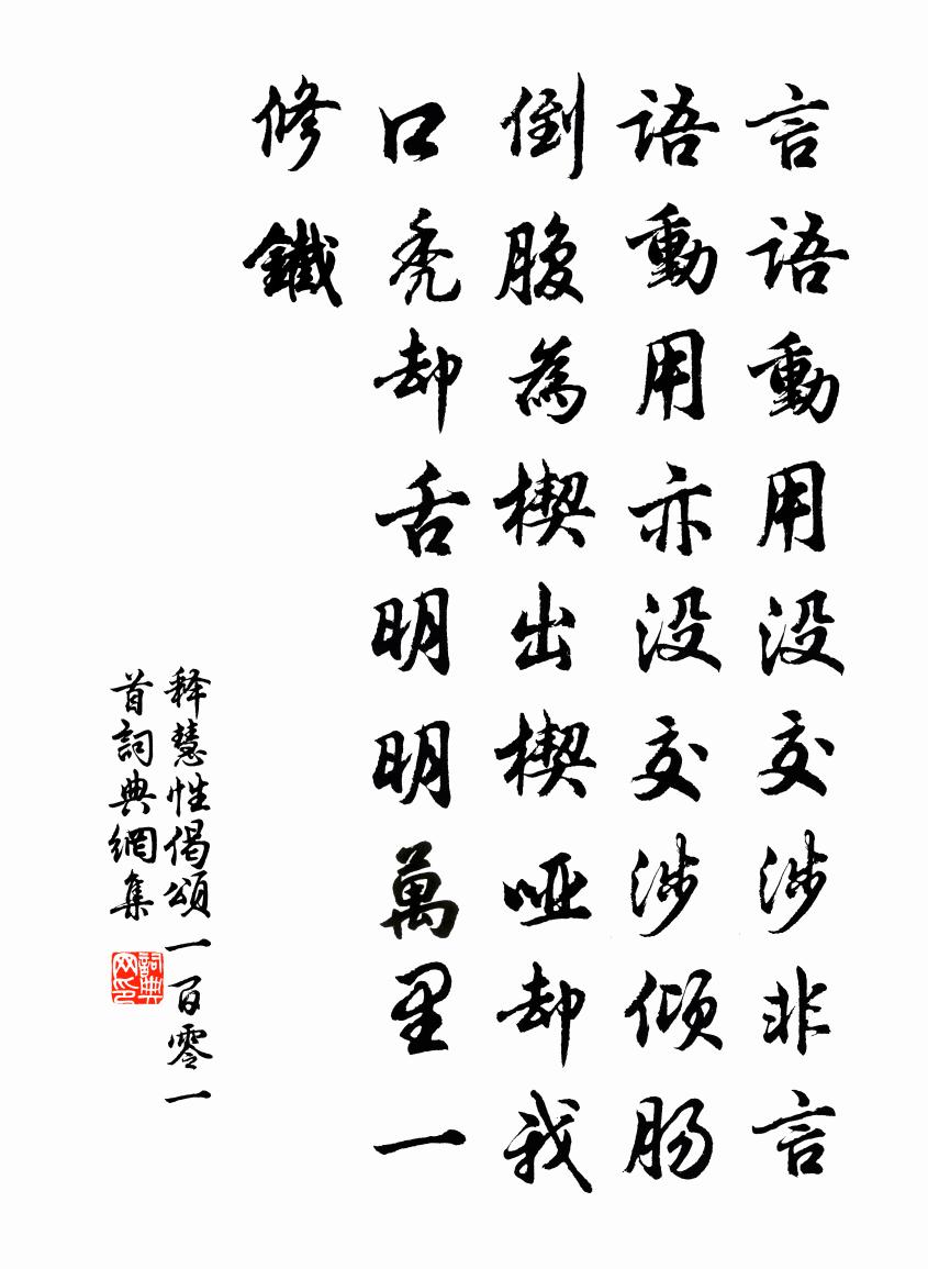 詩詞名句歷史字典書法欣賞書法字典國語詞典說文解字康熙字典古漢語字典標 題 作 者 詩 句 偈頌一百零一首作者:釋慧性 朝代:宋代偈頌一百零一首原文言語動用沒交涉,非言語動用亦沒交涉。傾腸倒腹,為楔出楔。啞卻我口禿卻舌,明明萬里一修鐵。詩詞問答問:偈頌一百零一首的作者是誰?答:釋慧性問:偈頌一百零一首寫於哪個朝代?答:宋代釋慧性偈頌一百零一首書法欣賞偈頌一百零一首書法作品詩詞推薦謝楊履道送銀茄四首黃庭堅〔宋代〕君家水茄白銀色,殊勝埧里紫彭亨。蜀人生疏不下箸,吾與北人俱眼明。寄高適杜甫〔唐代〕楚隔乾坤遠,難招病客魂。詩名惟我共,世事與誰論。北闕更新主,南星落故園。定知相見日,爛漫倒芳尊。句張鎡〔宋代〕自笑從來痴。送吳少保知鄂州項安世〔宋代〕第三閘外看征帆,閘鴃帆輕似箭奔。此去直挨湖北岸,吾廬正在水邊村。送公便作還家想,何日真酬去國言。最是哀甬東李鄴嗣〔清代〕篳栗頻吹斷,經旬敢一行。巷初投犬吠,市稍賀人聲。家在移前盡,身從定後驚。太平真足慕,容易偃柴荊。寄陳莘村林景英〔宋代〕玄冬梅半日,光接太丘星。雪月往來夢,溪山長短亭。利名成露草,行止付風萍。三十年來友,無如老典型。南鄉子 清畫張玉娘〔元代〕疏雨動輕寒。金鴨無心*麝蘭。深院深深人不到,憑闌。盡日花枝獨自看。銷睡報雙鬟。茗鼎香分小鳳團。雪浪不胡文恭倅宛陵距今將百年其後來官是邦者三人李彌遜〔宋代〕前賢不復夢逢迎,晚歲於公識典刑。肯子規橅夸錦繡,傳家翰墨炳丹青。碑存峴首長懷惠,學富韋門總帶經。會見壽鄒茶使二首洪咨夔〔宋代〕手挈蓬弧掛井參,籌邊樓下瑞雲深。傳將絕學聖賢脈,會得初陽天地心。議論文章胸萬甲,功名富貴腹三壬。春風次韻王仲行尚書宿直兩絕句周必大〔宋代〕東省南宮切太微,夔龍行集鳳凰池。更喔殿閣薰風句,坐覺微涼生桂枝。飲馬長城窟行陸機〔魏晉〕驅馬陟陰山。山高馬不前。往問陰山候。勁虜在燕然。戎車無停軌。旌旆屢徂遷。仰憑積雪岩。俯涉堅冰川。冬來延興門外作韋莊〔唐代〕芳草五陵道,美人金犢車。綠奔穿內水,紅落過牆花。馬足倦遊客,鳥聲歡酒家。王孫歸去晚,宮樹欲棲鴉。中秋陳藻〔宋代〕詩書讀罷問耕牛,等得時來死便休。一帶空村無潤屋,聊因社肉作中秋。獨酌吳儆〔宋代〕松竹開幽徑,蓬蒿閟荊扉。庭前兩梧桐,濃綠涵清輝。南楹開半山,晨夕異煙霏。樽酒自賓主,幽鳥更塤篪。飲罷衰疾陸游〔宋代〕衰疾憐新鬼,狂豪尚故吾。棋常先客著,行不許兒扶。硯潤閒蟾滴,香殘冷鴨爐。自憐風味在,尚欲泛江湖。讀東坡疊嶂圖有感因次其韻張九成〔宋代〕虬須英武喧天淵,當時功臣畫凌煙。漢家驍騎才三萬,北攻稽落事燕然。勛名鼎鼎磨星斗,百年衰落歸黃泉。人間荷李嶠〔唐代〕新溜滿澄陂,圓荷影若規。風來香氣遠,日落蓋陰移。魚戲排緗葉,龜浮見綠池。魏朝難接采,楚服但同披。游蔡峰道中三首半坑陳著〔宋代〕疊障中閒一隙天,數家茅屋鸛巢邊。逢人試問營生事,笑指岩前煮草煙。所思杜甫〔唐代〕苦憶荊州醉司馬,謫官樽俎定常開。九江日落醒何處,一柱觀頭眠幾回。可憐懷抱向人盡,欲問平安無使來。故憑菩薩蠻·柳花飛處鶯聲急牛嶠〔唐代〕柳花飛處鶯聲急,晴街春色香車立。金鳳小簾開,臉波和恨來。今宵求夢想,難到青樓上。贏得一場愁,鴛衾誰並名句推薦華而不實,恥也。左丘明《國語·晉語·秦伯享重耳以國君之禮》 人生自是有情痴,此恨不關風與月。歐陽修《玉樓春·尊前擬把歸期說》 夜中不能寐,起坐彈鳴琴。阮籍《詠懷八十二首·其一》 春風不相識,何事入羅幃。李白《春思》 今逢四海為家日,故壘蕭蕭蘆荻秋。劉禹錫《西塞山懷古》 漢家君臣歡宴終,高議雲台論戰功。王維《少年行四首》 長安大雪天,鳥雀難相覓。張孜《雪詩》 東風動百物,草木盡欲言。李白《長歌行》 死者不可再生,用法務在寬簡。吳兢《貞觀政要·卷八·論刑法》 長恨此身非我有,何時忘卻營營。蘇軾《臨江仙·夜飲東坡醒復醉》