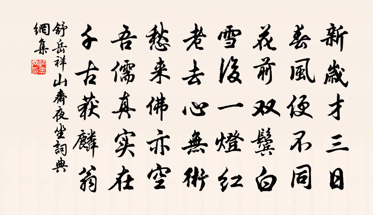 詩詞名句歷史字典書法欣賞書法字典國語詞典說文解字康熙字典古漢語字典標 題 作 者 詩 句 山齋夜坐作者:舒岳祥 朝代:宋代山齋夜坐原文新歲才三日,春風便不同。花前雙鬢白,雪後一燈紅。老去心無術,愁來佛亦空。吾儒真實在,千古獲麟翁。詩詞問答問:山齋夜坐的作者是誰?答:舒岳祥問:山齋夜坐寫於哪個朝代?答:宋代舒岳祥山齋夜坐書法欣賞山齋夜坐書法作品詩詞推薦對月贈答二首趙蕃〔宋代〕焚香拜月君懷我,對月停杯我憶君。莫羨月圓圓又缺,會看人合合無分。贈凌仙姥施肩吾〔唐代〕阿母從天降幾時,前朝惟有漢皇知。仙桃不啻三回熟,飽見東方一小兒。擬寒山拾得二十首王安石〔宋代〕汝無名高者,以見利貪叨。汝無行實者,以取著名高。行實尚非實,利名豈堅牢。一朝投土窟,魂魄散逃逃。鸚鵡曲 農夫渴雨馮子振〔元代〕年年牛背扶犁住。近日最懊惱殺農父。稻苗肥恰待抽花,渴煞青天雷雨。恨殘霞不近人情,截斷玉虹南去。望人間白雪米友仁〔宋代〕洞天晝永,正中和時候,涼飆初起。羽扇綸巾,雲流處,水繞山重雲委。好雨新晴,綺霞明麗,全是丹青戲。豪攘秋怨柳中庸〔唐代〕玉樹起涼煙,凝情一葉前。別離傷曉鏡,搖落思秋弦。漢壘關山月,胡笳塞北天。不知腸斷夢,空繞幾山川。送梁李二明府陳子昂〔唐代〕負書猶在漢,懷策未聞秦。復此窮秋日,芳樽別故人。黃金裝屢盡,白首契逾新。空羨雙鳧舄,俱飛向玉輪。昭武劉圻甫以{山栗}篁隱居圖求詩戴復古〔宋代〕相對兩山碧,春風搖綠篁。一巢雲建造,三澗水宮商。谷口躬耕稼,盤中歌壽昌。桃花認行路,他日訪劉郎。沁園春 韓雲卿 司邀賞牡丹,且雲, 芍藥有劉敏中〔元代〕諸公時余為國子祭酒先自空疏,幾載蹉跎,歷繞湖江。甚如今卻遣,官閒責重,茫然自愧,學陋言龐。鬢雪難消,安眠王洋〔宋代〕隨處便隨眠,昏昏息萬緣。魂如雙翅蝶,身在四禪天。素飾羅為幌,芳茵錦作筵。心如懷寵辱,未必得安然。長亭怨/長亭怨慢張炎〔宋代〕記橫笛、玉關高處。萬里沙寒,雪深無路。破卻貂裘,遠遊歸後與誰譜。故人何許。渾忘了、江南舊雨。不擬重逢祝英台近(後溪次韻日熙堂主人)周密〔宋代〕殢餘酲,尋舊雨,愁與病相半。綠意陰陰,絲竹靜深院。絕憐事逐春移,淚隨花落,似翦斷、鮫房珠串。喜重見。詠梅五十首呈史尚書釋紹嵩〔宋代〕玉樹交橫雪後天,新詩吟得百餘篇。郵筒不住如飛翼,送與襄陽孟浩然。觀鄰老栽松耿湋〔唐代〕雖過老人宅,不解老人心。何事斜陽里,栽松欲待陰。題扇二十四首曹勛〔宋代〕春去煙光綠已齊,陰陰欄檻曉晴時。新梢替盡殘芳靜,喜見余花一兩枝。讀先君新第落成詩有感因韻書示蒙孫陳宓〔宋代〕吾家清儉莫忘初,昔日儒酸白屋居。世事直須防滿溢,天公偏是喜乘除。看來負郭三千頃,不似傳家一卷書。謙損再會夏石芝宋伯仁〔宋代〕自與君相別,駸駸已數年。一緘書不寄,千里夢徒然。雨店花新長,風欞月幾圓。嶺梅無恙否,愁滿鬢絲邊。古詩贈相士吳楚峰謝枋得〔宋代〕世亂異人出,高者為神仙。方術皆救世,可知愚與賢。喜君風鑑別,妙處不可傳。著眼看福人,要識太平年。沁園春(送趙江陵東歸,再用前韻)辛棄疾〔宋代〕佇立瀟湘,黃鵠高飛,望君不來。被東風吹墮,西江對語,急呼斗酒,旋拂征埃。卻怪英姿,有如君者,猶欠封侯風入松(次韻代贈人)孫居敬〔宋代〕王孫去後幾時歸。音信全稀。綠痕染遍天涯草,更小紅、已破桃枝。此恨無人共說,夢回月滿樓時。只應明月照心名句推薦醉不成歡慘將別,別時茫茫江浸月。白居易《琵琶行 / 琵琶引》 縱然生得好皮囊,腹內原來草莽。曹雪芹《紅樓夢·第三回》 惟仁者宜在高位。孟子《孟子·離婁章句上·第一節》 守真志滿,逐物意移。周興嗣《千字文·全文》 水天清話,院靜人銷夏。項鴻祚《清平樂·池上納涼》 猶傶則疏之,毋使人圖之,猶疏則數之,毋使人曲之管仲《管子·侈靡》 八陣圖名成臥龍,六韜書功在飛熊。查德卿《蟾宮曲·懷古》 蠶無夏織桑充寨,田廢春耕犢勞軍。杜荀鶴《題所居村舍》 巧笑倩兮,美目盼兮。佚名《碩人》 歡宴良宵好月,佳人修竹清風。吳文英《風入松·麓翁園堂宴客》