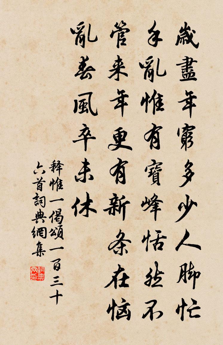 詩詞名句歷史字典書法欣賞書法字典國語詞典說文解字康熙字典古漢語字典標 題 作 者 詩 句 偈頌一百三十六首作者:釋惟一 朝代:宋代偈頌一百三十六首原文歲盡年窮,多少人腳忙手亂,惟有寶峰恬然不管。來年更有新條在,惱亂春風卒未休。詩詞問答問:偈頌一百三十六首的作者是誰?答:釋惟一問:偈頌一百三十六首寫於哪個朝代?答:宋代釋惟一偈頌一百三十六首書法欣賞偈頌一百三十六首書法作品詩詞推薦知廣安軍勾侯輓詩魏了翁〔宋代〕突兀雙楠樹,翹枝照戶青。春風吹湑湑,秋雨立亭亭。蟻夢迷符竹,牛涔兀屏篂。但令根本在,有茁媚階庭。玉樓春李子酉〔宋代〕紗窗春睡朦朧著。相見尚懷相別惡。夢隨城上角聲殘,淚逐樓前花片落。東風不解吹愁卻。明月幾番乖後約。當時十九日奉慈親再往吉祥院看花蔡襄〔宋代〕天意應偏與,春工已盡歸。來知從月下,去似逐雲飛。艷絕聲名遠,清多香氣微。輕陰資潤澤,斜照動光輝。劇飲碧蘆堂宋庠〔宋代〕寂寂虛堂一自幽,紺梢蒼葉更臨流。不須重畫滄浪境,一片江天小樣秋。壽竹西丘葵〔宋代〕中秋八月朔,人在竹之西。講席朝齊聽,吟寮夜獨棲。交情今管鮑,清操古夷齊。卻笑苔磯老,畏人頭愈低。四月一日早聞鶯方回〔宋代〕客里花都盡,初聞曉樹鶯。鶯聲雖已老,畢竟是鶯聲。殘雪楊萬里〔宋代〕殘雪堆成山數重,懸崖幽竇玉玲瓏。如何惜得仙代掌,擎取瓊瑤三四峰。送劉改這二首王居安〔宋代〕劉子堂堂七尺軀,高談世事奮髯須。觀渠論到前賢處,據我看來近世無。出語令人驚辟易,處窮無鬼敢揶揄。徜徉雜曲歌辭。飲酒樂聶夷中〔唐代〕日月似有事,一夜行一周。草木猶須老,人生得無愁。一飲解百結,再飲破百憂。白髮欺貧賤,不入醉人頭。我願訴衷情長筌子〔元代〕夜深人悄漏聲殘。秋色滿江乾。寒煙野塘橫渡,誰寫畫圖間。風瀝瀝,月彎彎。坐更闌。寶鼎香燼,銀漢星稀,蝶偈頌一百零二首釋紹曇〔宋代〕花錦蝶翻紅,柳煙鶯織曉。曾不動機絲,奪盡春工巧。玄中玄,妙中妙。三世諸佛覷不破,歷代祖師窮不到。窮得次韻夜雨陳師道〔宋代〕暗雨來何急,寒房客自醒。驟看燈閃閃,擬對竹青青。聲到江乾盡,風回葉上聽。更長那得曉,欹側想儀形。提宮宇文朝議輓辭郭印〔宋代〕憶昔我弱冠,辟廱尾群英。公時少二歲,籍注國子生。同舍氣味同,異姓而弟兄。厥後公筮仕,我亦獵科名。參辰八拍蠻仇遠〔宋代〕翠袖籠香醒宿酒,銀瓶汲水瀹新茶。幾處杜鵑啼暮雨,來禽空老一春花。折荷有贈李白〔唐代〕涉江玩秋水,愛此紅蕖鮮。攀荷弄其珠,蕩漾不成圓。佳人彩雲里,欲贈隔遠天。相思無因見,悵望涼風前。滿庭芳(賞梅)秦觀〔宋代〕庭院余寒,簾櫳清曉,東風初破丹苞。相逢未識,錯認是夭桃。休道寒香波較晚,芳叢里、便覺孤高。憑闌久,巡大鑒禪師贊釋慧開〔宋代〕菩堤無樹鏡非台,臭門分明鬼擘開。幸是賣柴無事獠,剛然惹得一身災。僧影韓偓〔唐代〕山色依然僧已亡,竹間疏磬隔殘陽。智燈已滅余空燼,猶自光明照十方。頌古三十八首釋從瑾〔宋代〕當面非暗投,應機皆直說。乾峰與雲門,兩口同一舌。若是續貂人,弄巧便成拙。一線泉葉茵〔宋代〕銀潢萬丈下嵯峨,想是天孫掛玉梭。休道此泉絲樣小,涓涓將見作江河。名句推薦清風朗月,輒思玄度。劉義慶《世說新語·言語》 俯皇都之宏麗兮,瞰雲霞之浮動。曹植《銅雀台賦》 狂風吹我心,西掛鹹陽樹。李白《金鄉送韋八之西京》 不管三七二十一馮夢龍《醒世恆言·卷一》 袨服華妝著處逢,六街燈火鬧兒童。元好問《京都元夕》 蜀道之難,難於上青天!李白《蜀道難》 山重水複疑無路,柳暗花明又一村。陸游《游山西村》 孤之有孔明,猶魚之有水也。陳壽《隆中對》 浮雲遮月不分明,誰挽長江一洗放天青?董士錫《虞美人·韶華爭肯偎人住》 月到東南秋正半。雙闕中間,浩蕩流銀漢。王國維《蝶戀花·月到東南秋正半》