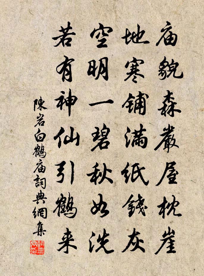 詩詞名句歷史字典書法欣賞書法字典國語詞典說文解字康熙字典古漢語字典標 題 作 者 詩 句 白鶴廟作者:陳岩 朝代:宋代白鶴廟原文廟貌森嚴屋枕崖,地寒鋪滿紙錢灰。空明一碧秋如洗,若有神仙引鶴來。詩詞問答問:白鶴廟的作者是誰?答:陳岩問:白鶴廟寫於哪個朝代?答:宋代陳岩白鶴廟書法欣賞白鶴廟書法作品詩詞推薦望江南李真人〔元代〕金與水,相見兩交並。復卦發爻依刻漏,壺中日月結成形。滄海幾回積雨蒸潤,體中不佳,頗思故居之樂,戲書呈范成大〔宋代〕門外泥深蘸馬鞍,墨雲未放四維寬。前山忽接後山暗,暑雨全如秋雨寒。夢裡江湖三嘆息,醉中天地一憑闌。斗升首尾吟邵雍〔宋代〕堯夫非是愛吟詩,詩是堯夫知幸時。日未出前朝象帝,天才春處謁庖犧。三杯五盞自勸酒,一局兩局無爭棋。韶濩清輝堂王朝佐〔宋代〕古汴寒灰不可溫,熒熒孤嶼火猶存。一抔未問長陵土,兩字先勞萬乘尊。卓筆有鋒兵自弱,投戈無志藝何論。清輝題心遠別墅張煒〔宋代〕聞說藏修所,憑已更接溪。百花攙序發,萬竹剪雲齊。地勝塵無染,廛居俗正迷。二王詩絕唱,何用我留題。偈頌二十一首釋堅璧〔宋代〕今朝六月中,嘉田雨沾足。山房冷似冰,千山擁寒玉。祖意不西來,法身無展縮。水上掛燈毬,鎮州出蘿蔔。三盞次韻王穉川客舍二首黃庭堅〔宋代〕五更歸夢常苦短,一寸客愁無奈多。慈母每占烏鵲喜,家人應賦扊扅歌。冬至寄行甫騰叔陳藻〔宋代〕江浙羈棲怕雪霜,早年聽得晚年嘗。生涯敗意多諳歷,節序隨緣少感傷。鴨肉餛飩看土俗,糯丸麻汗阻家鄉。二千和賀子忱喜雪曹勛〔宋代〕蘊玉梅初艷,埋青麥自豐。漸冰留水研,時喜拂窗風。能賦懷王粲,開樽憶孔融。警寒方認鶴,掃逕屢嗔童。色動雪中憶昔五首方回〔宋代〕憶昔凌晨泛雪湖,明天淨地一塵無。略聞倩盼歌金縷,盡聳清揚倒玉壺。屢造廟朝終擯逐,偶登名第自囚拘。即今句釋曉瑩〔宋代〕對景覓詩聯。次韻凌義山二首楊公遠〔宋代〕眼前詩料底消尋,移入蠻箋別淺深。無斧鑿痕方造妙,超塵俗表始堪吟。物情體狀須留意,句眼推敲好用心。試看臨江仙李之儀〔宋代〕九十日春都過了,尋常偶到江皋。水容山態兩相饒。草平天一色,風暖燕雙高。酒病厭厭何計那,飛紅更送無聊。步西湖次韻徐南卿陳造〔宋代〕徐郎小隱處,愛我許迂臨。多遻話歲晚,言歸忘夜深。祛愁倚詩酒,結伴卜山林。更喜檀欒舊,風煙挺綠沈。偶成曹彥約〔宋代〕可笑禪流錯用心,或思或罷兩追尋。窮年費煞精神後,陷入泥塗輾轉深。菊花天王哲〔元代〕苦勸伊家省自煎。須知每每居*。贏取日高眠。賣花天氣,別有玄玄。這個元來滋味好,自然滅火消煙。要入無生多麗(中秋)楊無咎〔宋代〕晚風清,淡雲卷盡輕羅。看銀蟾、初離海上,萬里碧漢澄波。碾雲衢、玉輪緩駕,照山影、寶鏡新磨。光徹庭除,春日雜興陸游〔宋代〕更事多來見物情,世間常恨太忙生。花開款款寧為晚,日出遲遲卻是晴。中秋扶病對月蘇泂〔宋代〕久病頭如石,中秋月似盆。起瞻惟一色,歸臥只空村。信有鄜州見,曾同秘省論。微吟到河漢,桂樹忽飛翻。山茶花俞國寶〔宋代〕花近東溪居士家,好攜樽酒款攜茶。玉皇收拾還天上,便恐筠陽無此花。名句推薦稻根科斗行如塊,田水今年一尺寬。范成大《夏日田園雜興》 秋風夜渡河,吹卻雁門桑。王昌齡《塞下曲·秋風夜渡河》 奔車之上無仲尼,覆舟之下無伯夷。韓非及後人《韓非子·安危》 晚來天欲雪,能飲一杯無?白居易《問劉十九》 求得人間成小會,試把金尊傍菊叢。晏殊《破陣子·燕子欲歸時節》 枯枝無醜葉,涸水吐清泉李白《長歌行》 聞道黃龍戍,頻年不解兵。沈佺期《雜詩三首·其三》 尾生與女子期於梁下,女子不來,水至不去,抱樑柱而死。莊子《莊子·雜篇·盜跖》 但責己,不責人,此遠怨之道也王永彬《圍爐夜話·第八五則》 世事悠悠渾未了,年光冉冉今如許。吳潛《滿江紅·送李御帶珙》