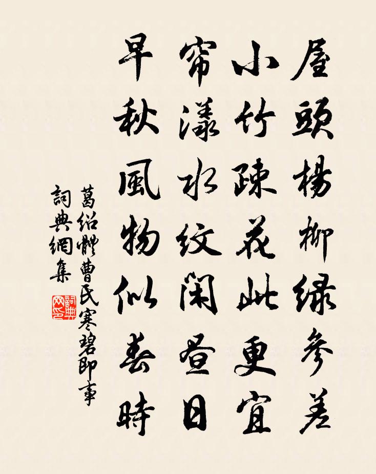 詩詞名句歷史字典書法欣賞書法字典國語詞典說文解字康熙字典古漢語字典標 題 作 者 詩 句 曹氏寒碧即事作者:葛紹體 朝代:宋代曹氏寒碧即事原文屋頭楊柳綠參差,小竹疎花此更宜。簾漾水紋閒晝日,早秋風物似春時。詩詞問答問:曹氏寒碧即事的作者是誰?答:葛紹體問:曹氏寒碧即事寫於哪個朝代?答:宋代葛紹體曹氏寒碧即事書法欣賞曹氏寒碧即事書法作品詩詞推薦金剛隨機無盡頌究竟無我分第十七釋印肅〔宋代〕眾生非滅度,說滅度成誤。真如法界中,你我何門戶。約黃董二親與桂堂諸侄避暑戴敏〔宋代〕世間無處避炎蒸,欲叫西風叫不應。恨乏白檀除熱惱,心思赤腳踏層冰。醉遊河朔誰同往,表借明光愧不能。聞有江城梅花引(登高)劉將孫〔宋代〕明霞回雨霽秋空。笑難逢。步城東。直上翠微,客有可人同。回首向來輕節序,筋力異,心猶在,愧鬢蓬。悲年冉翌日趙守轉以酴醿惠予用前韻謝之鄭剛中〔宋代〕壓架新蕤香未露,先得一枝天所付。既得復持平等心,膽瓶轉施愚翁處。次韻劉明遠移家徐璣〔宋代〕隱居須是僻,君向數家村。自以閒為樂,何嫌貧尚存。碧波連草舍,白日掩柴門。掛得一瓢在,風來應惡喧。偶成張耒〔宋代〕須知庖手有真如,合遣輪人笑讀書。擁褐 * 深閉目,老人於此有工夫。東西船方岳〔宋代〕昨日東船使風下,突過未興快於馬。今日西船使風上,適從何來急於浪。東船下時西船怨,西船上時東船羨。篙師餞廬按察楊公遠〔宋代〕軺車至日歲將更,又趁薰風理去程。歷遍山城留好句,蘇回民瘼快輿情。人言但有官如此,世道應無事不平。只恐即事章甫〔宋代〕風急收殘雨,花輕點客衣。江山爭秀髮,燕雁不同飛。異縣交遊少,中原信息稀。王師戰甚苦,方解蔡州圍。與至先兄游諸園看牡丹,三日行遍范成大〔宋代〕拄杖無邊處處過,粉圍紅繞奈春何。閶門昨日看不足,今日婁門花更多。蜂蝶蕭騷草露漫,小家籬落閉荒寒。欲知挽曾仲躬侍郎之室秦國太夫人馮氏孫應時〔宋代〕數近期頤壽,尊封大國秦。三從皆鼎食,九族盡朝紳。神劍須重合,蟠桃不再春。只令彤史載,備福更何人。同萬秀才讌楊侯別墅宋庠〔宋代〕苑路輕驂拂曉霞,斗城南畔列侯家。臨邛貴客傾中坐,漳水詞人記後車。一石蒲桃先載酒,萬株金谷正交花。風光六朝曾極〔宋代〕倒指六朝事,江城不忍登。燕巢非故宅,兔窟遍諸陵。亹亹稱王霸,嗟嗟感廢興。青山龍虎在,金氣又消凝。題畫章甫〔宋代〕一水鳴東西寺,春雨洗南北山。腳力未窮蒼翠,夢魂曾聽潺湲。賀新郎辛棄疾〔宋代〕曾與東山約。為鯈魚、從容分得,清泉一勺。堪笑高人讀書處,多少松窗竹閣。甚長被、遊人占卻。萬卷何言達時朔風詩曹植〔魏晉〕弦歌盪思。誰與銷憂。臨川慕思。何為泛舟。豈無和樂。游非我鄰。誰忘泛舟。愧無榜人。送僧入蜀過夏曹松〔唐代〕師言結夏入巴峰,雲水回頭幾萬重。五月峨眉須近火,木皮領重只如冬。許秀才至辱李蘄州絕句問斷酒之情因寄杜牧〔唐代〕有客南來話所思,故人遙枉醉中詩。暫因微疾須防酒,不是歡情減舊時。卿雲歌先秦無名〔先秦〕卿雲爛兮。乣縵縵兮。明明天上。爛然星陳。日月光華。旦復旦兮。日月有常。星辰有行。四時從經。萬姓允誠。浣溪沙向子諲〔宋代〕一夜涼颸動碧廚。曉庭飛雨濺真珠。玉人睡起倚金鋪。雲髻作堆初未整,柳腰如醉不勝扶。天仙風調世間無。名句推薦朽木不可雕也,糞土之牆不可杇也,於予與何誅?孔子弟子《論語·公冶長篇》 懷春情不斷,猶帶相思舊子。吳文英《丁香結·夷則商秋日海棠》 關山四面絕,故鄉幾千里。劉昶《斷句》 對聖賢言語,必要我平時照樣行去,才算讀書。王永彬《圍爐夜話·第二則》 歸時休放燭光紅,待踏馬蹄清夜月。李煜《木蘭花·曉妝初了明肌雪》 擬把疏狂圖一醉,對酒當歌,強樂還無味。柳永《蝶戀花·佇倚危樓風細細》 一溪煙柳萬絲垂,無因系得蘭舟住。周紫芝《踏莎行·情似遊絲》 交河城邊鳥飛絕,輪台路上馬蹄滑。岑參《天山雪歌送蕭治歸京》 花隱掖垣暮,啾啾棲鳥過。杜甫《春宿左省》 床前明月光,疑是地上霜。李白《靜夜思》