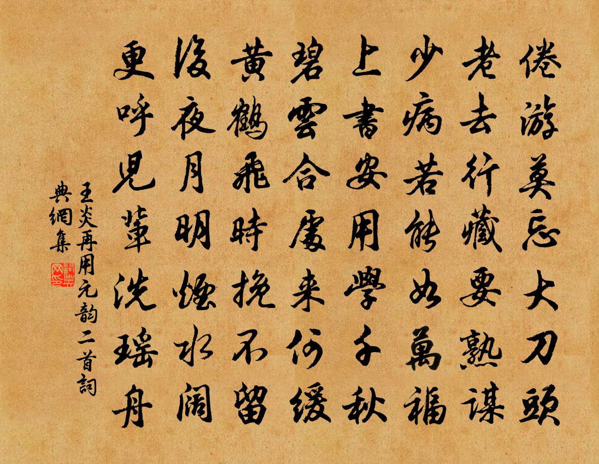 詩詞名句歷史字典書法欣賞書法字典國語詞典說文解字康熙字典古漢語字典標 題 作 者 詩 句 再用元韻二首作者:王炎 朝代:宋代再用元韻二首原文倦遊莫忘大刀頭,老去行藏要熟謀。少病若能如萬福,上書安用學千秋。碧雲合處來何緩,黃鶴飛時挽不留。後夜月明煙水闊,更呼兒輩洗瑤舟。詩詞問答問:再用元韻二首的作者是誰?答:王炎問:再用元韻二首寫於哪個朝代?答:宋代王炎再用元韻二首書法欣賞再用元韻二首書法作品詩詞推薦九辯宋玉〔先秦〕悲哉!秋之為氣也。 蕭瑟兮,草木搖落而變衰。 憭栗兮,若在遠行。 登山臨水兮,送將歸。 泬寥兮,天高曉入南山孟浩然〔唐代〕瘴氣曉氛氳,南山復水雲。鯤飛今始見,鳥墜舊來聞。地接長沙近,江從汨渚分。賈生曾吊屈,余亦痛斯文。別林黃中帥湖南陳藻〔宋代〕清秋緩轡馬如雲,論定忠邪黑白分。湘水傳呼新刺史,霸陵改觀舊將軍。平生孤節人難到,自此一番名愈聞。定有又和賞梅范仲淹〔宋代〕故人為使富天才,相與抽毫賦早梅。氣豓未勞橫玉笛,風光先合倒金壘。隴頭欲寄交情遠,林下初逢病眼開。必若謝章泉再以前韻見寄三首劉宰〔宋代〕白杜相從遠與劉,可憐衲子溷儒流。自嗟達巷知夫子,緬想諸荀從太丘。書寄洪喬寄爾耳,詩編杜集可容不。前山惜花寄孫員外(一本缺孫字)李建勛〔唐代〕朝始一枝開,暮復一枝落。只恐雨淋漓,又見春蕭索。侵晨結駟攜酒徒,尋芳踏盡長安衢。思量少壯不自樂,他日送韓少汲萍鄉尉蘇籀〔宋代〕大門人望舊旌旄,嶺表瀧頭罄錯刀。中饋從誰合紅卺,郵亭自詭絮征袍。青衫九品非君慍,黃卷連車慰我曹。蘭蕙寒食雨二首蘇軾〔宋代〕春江欲入戶,雨勢來不已。小屋如漁舟,蒙蒙水雲里。空庖煮寒菜,破灶燒濕葦。那知是寒食,但見烏銜紙。君門泛湖十絕句陳造〔宋代〕樓前行客竟昂頭,樓上齊聲唱石州。袞遍實催猶未徹,暑風晴月各新秋。挽開國陳寺丞二首劉克莊〔宋代〕昨御祥琴後,多傳吉語通。虛令古列宿,不料奏悲風。華表孫從祖,生芻婿吊翁。九原一無憾,全璧見先公。紹興淳熙分命館職定撰十七首佚名〔宋代〕[圜鍾為宮]上直房民,時惟明堂。配天享親,宗祀有常。盛德在金,日吉辰良。享我克誠,來格來康。題雲岫半閒堂用李涉韻趙必象〔宋代〕一塢白雲茅數間,歸與釣水采於山。寄聲靈徹休相笑,未必僧閒似我閒。秋登張明府海亭孟浩然〔唐代〕海亭秋日望,委曲見江山。染翰聊題壁,傾壺一解顏。歌逢彭澤令,歸賞故園間。予亦將琴史,棲遲共取閒。夫人閣春帖子趙湘〔唐代〕重錦褰妝幕,輕羅換舞衣。釵頭雙燕子,先向社前飛。詠湯泉(在白水山。)蘇軾〔宋代〕積火焚大槐,蓄油災武庫。驚然丞相井,疑浣將軍布。自憐耳目隘,未測陰陽故。郁攸火山烈,觱沸湯泉注。豈惟題潘少白詩舒岳祥〔宋代〕海颶既過天泬寥,瓦檠弄焰靜自搖。特山吟稿適在案,讀罷不知山月高。早從唐體入圓妥,更向派家事掀簸。盡囊所居遇雪衛宗武〔宋代〕去年雪於臘,見晛跡已滅。今年天作花,再白遂凝結。鱗鱗甍相接,爛爛銀互疊。平尺雖未盈,皓若布層氎。洪纖秦樓月·浮雲集范成大〔宋代〕浮雲集。輕雷隱隱初驚蟄。初驚蟄。鵓鳩鳴怒,綠楊風急。玉爐煙重香羅浥。拂牆濃杏燕支濕。燕支濕。花梢缺處感懷孟郊〔唐代〕孟冬陰氣交,兩河正屯兵。煙塵相馳突,烽火日夜驚。太行險阻高,挽粟輸連營。奈何操弧者,不使梟巢傾。猶聞題中山出遊圖龔開〔宋代〕髯君家本住中山,駕言出遊安所適。謂為小獵無鷹犬,以為意行有家室。阿妹韶容見靚妝,五色臙脂最宜黑。道逢名句推薦天街曾醉美人畔,涼枝移插烏巾。吳文英《夜飛鵲·蔡司戶席上南花》 閉門覓句陳無己,對客揮毫秦少游。黃庭堅《病起荊江亭即事》 暗數十年湖上路,能幾度,著娉婷。盧祖皋《江城子·畫樓簾暮卷新晴》 以子之矛,陷子之盾韓非及後人《韓非子·難一》 二月賣新絲,五月糶新谷。聶夷中《詠田家 / 傷田家》 想文君望久,倚竹愁生步羅襪。姜夔《八歸·湘中送胡德華》 若問相思甚了期,除非相見時。晏幾道《長相思·長相思》 春江潮水連海平,海上明月共潮生。張若虛《春江花月夜》 致君堯舜上,再使風俗淳。杜甫《奉贈韋左丞丈二十二韻》 奢者富而不足,何如儉者貧而有餘。洪應明《菜根譚·概論》