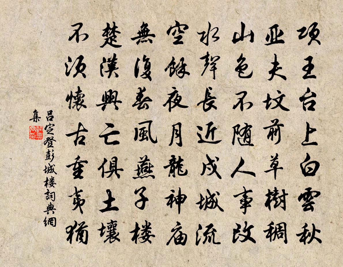 詩詞名句歷史字典書法欣賞書法字典國語詞典說文解字康熙字典古漢語字典標 題 作 者 詩 句 登彭城樓作者:呂定 朝代:宋代登彭城樓原文項王台上白雲秋,亞夫墳前草樹稠。山色不隨人事改,水聲長近戍城流。空餘夜月龍神廟,無復春風燕子樓。楚漢興亡俱土壤,不須懷古重夷猶。詩詞問答問:登彭城樓的作者是誰?答:呂定問:登彭城樓寫於哪個朝代?答:宋代呂定登彭城樓書法欣賞登彭城樓書法作品詩詞推薦大滌洞何炳然〔宋代〕杳默閟虛曠,森爽離人寰。玉室非所詣,回首煙中山。青渠追和宋金都壁間韻洪咨夔〔宋代〕短亭放腳小軒渠,從險趨平本一塗。掌上煙川三百里,蜀都風物似吳都。殿柱記李石〔宋代〕蒼龍甲戌歲,修築周公殿。文翁至高君,學校已再變。順考興平年,寔紀漢之獻。或雲鍾會書,入木字隱見。自獻宮詞一百首岳珂〔宋代〕氈廈鴻儒彯侍纓,百年豐芑燕承平。上方親述先朝志,黃繖清晨下邇英。懷廬岳舊遊寄劉鈞因感鑒上人李中〔唐代〕昔年廬岳閒遊日,乘興因尋物外僧。寄宿愛聽松葉雨,論詩惟對竹窗燈。各拘片祿尋分別,高謝浮名竟未能。一念和王克寬有所寄草堂詩二首劉宰〔宋代〕身在金華與玉堂,寄聲時到祝豀鄉。為言舊訪薦仝處,柳壓平堤水滿塘。題濂溪畫像陳杰〔宋代〕睟盎真元會,揚休沕穆宣。定非三代下,自得六經先。翠草紅蓮地,光風霽月天。幾神千載悟,紙上更須圈。雨後月明起坐戲成舒岳祥〔宋代〕雨後月明,如醉而醒。不見其形,但見其影。我夢初回,非曙非暝。道人無言,起舞弄景。永鳥無聲,一鶴自警。驀山溪(游三榮龍洞)陸游〔宋代〕窮山孤壘,臘盡春初破。寂寞掩空齋,好一個、無聊底我。嘯台龍岫,隨分有雲山,臨淺瀨,蔭長松,閒據胡床坐述字迴文偈七首宋太宗〔宋代〕舊前憂依述,最亨知休以。祐然留希佛,背生推求比。緣識宋太宗〔宋代〕深秋雲物冷,經雨斗添寒。盡日緣情坐,霜葉易燋右乾。沁園春(二月二日壽玉林)馮取洽〔宋代〕稟氣之中,具聖之和,生逢令辰。算三春仲月,方才破二,百年大齊,恰則平分。立玉林深,散花庵小,中有然自南海晚望貫休〔唐代〕海上聊一望,舶帆天際飛。狂蠻莫掛甲,聖主正垂衣。風惡巨魚出,山昏群獠歸。無人知此意,吟到月騰輝。贈越客趙嘏〔唐代〕故國波濤隔,明時心久留。獻書雙闕晚,看月五陵秋。南棹何當返,長江憶共游。定知釣魚伴,相望在汀州。偈傾一百六十九首釋智朋〔宋代〕正不立玄,偏無所附。三十年異類中行,末後句月圓古渡。夜船撥轉琉璃殿,白鳥飛宿無影樹。寒食夜有寄韓偓〔唐代〕風流大抵是倀倀,此際相思必斷腸。雲薄月昏寒食夜,隔簾微雨杏花香。早秋西歸有懷劉威〔唐代〕求歸方有計,惜別更堪愁。上馬江城暮,出郊山戍秋。暗銷何限事,白盡去年頭。莫怪頻惆悵,異鄉難再游。共樂堂陳俊卿〔宋代〕共樂堂前花木深,登臨當暑豁塵襟。紅垂荔子千家熟,翠擁篔簹十畝陰。老退已尋居士服,清歡時伴醉翁吟。憑欄偶書鄭谷〔唐代〕承時偷喜負明神,務實那能得庇身。不會蒼蒼主何事,忍飢多是力耕人。泝行回溪三十里入婺源縣界方回〔宋代〕軍馬所不到,大山夾長谷。千載幾離亂,不知有殺戮。雞犬何晏然,未羨鄠杜曲。連林望不極,春晚蓊以綠。其大名句推薦朱弦已為佳人絕,青眼聊因美酒橫。黃庭堅《登快閣》 樹挪死,人挪活。佚名《增廣賢文·下集》 天地有萬古,此身不再得;人生只百年,此日最易過。洪應明《菜根譚·概論》 仁者愛人,有禮者敬人。愛人者人恆愛之,敬人者人恆敬之。孟子《孟子·離婁章句下·第二十八節》 夜來小雨新霽,雙燕舞風斜。万俟詠《訴衷情·送春》 參差煙樹灞陵橋,風物盡前朝柳永《少年游·參差煙樹灞陵橋》 性孤高似柏,阿嬌金屋。陸容《滿江紅·詠竹》 思牽今夜腸應直,雨冷香魂吊書客。李賀《秋來》 年年遊子惜余春,春歸不解招遊子。賀鑄《惜余春·急雨收春》 曾伴浮雲歸晚翠,猶陪落日泛秋聲。高蟾《金陵晚望》