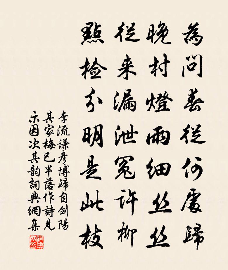 詩詞名句歷史字典書法欣賞書法字典國語詞典說文解字康熙字典古漢語字典標 題 作 者 詩 句 彥博歸自劍陽其家梅已半落作詩見示因次其韻作者:李流謙 朝代:宋代原文為問春從何處歸,晚村燈雨細絲絲。從來漏泄冤許柳,點檢分明是此枝。詩詞問答問:《彥博歸自劍陽其家梅已半落作詩見示因次其韻》的作者是誰?答:李流謙問:該詩寫於哪個朝代?答:宋代書法欣賞彥博歸自劍陽其家梅已半落作詩見示因次其韻書法作品詩詞推薦寄柳塘汪叔畊三首詹初〔宋代〕數月未論心,此心覺還真。矢以惺惺法,始終奉此身。登嵩山十首 玉女窗蘇轍〔宋代〕岩竇有虛明,曨曨發晴曉。真人無儔匹,窗下晨妝早。門開秋雨入,室靜長風掃。絕跡杳難尋,朱顏未嘗老。送倪道士之廬山趙師秀〔宋代〕近方辭地肺,本自住天台。有鶴相同出,無雲作伴回。道房隨處借,詩板逐時開。又說廬山去,閒看瀑布來。挽趙集賢□□□三首陳著〔宋代〕三年集賢院,一老無游身。鐙火影相弔,家山眉兩顰。生還空有日,病臥竟無晨。瞑斂夫何憾,同朝多故人。題蔡潤畫李耕〔宋代〕雨過天如沐,回山濃翠侵。平橋帶野水,涓涓繞竹林。茅屋闃無人,案上橫素琴。白鷺正熟睡,杳無羨魚心。維舟錦堂春佚名〔宋代〕活骷髏。算來有甚風流。著衣衫、遮形蓋體,弄精神、虛度春秋。又不念、無常近也,又不怕、閻老來勾。巧使機謝侯彥明惠白蓮栽張栻〔宋代〕青鞋不踏遠化社,偶共濂溪嗜好同。少待薰風開玉鏡,與君來賦月明中。三月望日微雨汎舟西湖四首張鎡〔宋代〕清明才過雨連風,著色湖山便面中。草上踏青人自出,艤船無地不飛紅。三月二日奉詔赴西園曲宴席上賦呈致政開府太蘇頌〔宋代〕昔美都門祖二疏,太沖篇詠貴良圖。不聞賓主俱公鼎,未見篇章出賓跗。河嶽英靈添賦詠,都人士女競歡娛。皆言報師恩 疏慵丘處機〔元代〕懶看經教懶燒香。兀兀騰騰似醉狂。日月但知生與落,是非寧辨短和長。客來坐上心慵問,飯到唇邊口倦張。不是陪辛大夫西亭宴觀妓劉長卿〔唐代〕歌舞憐遲日,旄麾映早春。鶯窺隴西將,花對洛陽人。醉罷知何事,恩深忘此身。任他行雨去,歸路裛香塵。滿庭芳 懷修煉馬鈺〔元代〕物物心休,般般事已,進入退己從長。無爭上士,柔弱勝剛強。坦蕩逍遙度日,處清淨、成就圓方。懷修煉,亘初過三鄉望女幾山,早歲有卜築之志羊士諤〔唐代〕女幾山頭春雪消,路傍仙杏發柔條。心期欲去知何日,惆悵回車上野橋。雜賦陸游〔宋代〕養疾清溪曲,風林幾著霜。細書如助嬾,薄酒不成狂。老嘆朋儕盡,閒知歲月長。柴門偶一出,倚杖立斜陽。曹主簿涇自卜壽藏追范石湖韻謹依虛谷使君例汪炎昶〔宋代〕百的孰不寄荒隅,螻蟣嘆欣悵野鳥。畏死固知非過士,輕生斷亦是狂夫。樂天陶令詞堪續,荷鍤劉伶跡易模,石礅五盤(七盤嶺在廣元縣北一名五盤棧道盤曲有五重)杜甫〔唐代〕五盤雖雲險,山色佳有餘。仰凌棧道細,俯映江木疏。地僻無網罟,水清反多魚。好鳥不妄飛,野人半巢居。喜見自嘲陸游〔宋代〕野老家風子未知,天教甫里出孫枝。遍游竹院尋僧語,時拂楸枰約客棋。是處登臨有風月,平生揚歷半宮祠。即今贈隱者忘機家鉉翁〔宋代〕寂然不動機已兆,感而遂通機乃神。一陽昨夜回冰底,生意流行萬象春。烏夜啼潘牥〔宋代〕無端小雪廉纖。入平檐。金鴨旋添龍餅,莫開簾。尋梅約。開還落。可曾忺。合作一年春恨,上眉尖。頌古十二首釋法泰〔宋代〕朝三暮四一何少,暮四朝三何太多。多少未能知數量,有無從此見殽訛。不殽訛,唵囌嚧,{左口右悉}唎薩婆訶名句推薦西湖又還春晚,水樹亂鶯啼。仲殊《訴衷情·寶月山作》 黃埃散漫風蕭索,雲棧縈紆登劍閣。白居易《長恨歌》 野店桃花紅粉姿,陌頭楊柳綠菸絲。趙孟頫《東城》 示上以足,示下以惠,怨自削減。來俊臣《羅織經·固榮卷第六》 一叫一迴腸一斷,三春三月憶三巴。李白《宣城見杜鵑花 / 子規》 年年負卻花期!過春時,只合安排愁緒送春歸。張惠言《相見歡·年年負卻花期》 別後不知君遠近。觸目淒涼多少悶。歐陽修《玉樓春·別後不知君遠近》 光景不勝閨閣恨,行行坐坐黛眉攢。閻選《八拍蠻·雲鎖嫩黃煙柳細》 葉落當歸根,雲沉久必起。錢嶫《憫黎詠》 三年羈旅客,今日又南冠。夏完淳《別雲間》