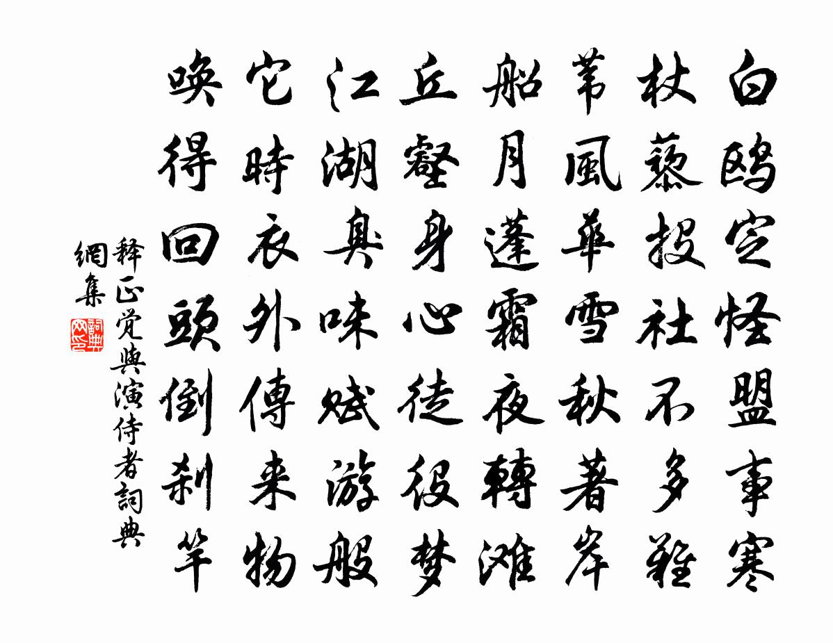 詩詞名句歷史字典書法欣賞書法字典國語詞典說文解字康熙字典古漢語字典標 題 作 者 詩 句 與演侍者作者:釋正覺 朝代:宋代與演侍者原文白鷗定怪盟事寒,杖藜投社不多難。葦風華雪秋著岸,船月蓬霜夜轉灘。丘壑身心徒役夢,江湖臭味賦游般。它時衣外傳來物,喚得回頭倒剎竿。詩詞問答問:與演侍者的作者是誰?答:釋正覺問:與演侍者寫於哪個朝代?答:宋代釋正覺與演侍者書法欣賞與演侍者書法作品詩詞推薦貴要之客來陳杰〔宋代〕幽居日對野人多,滿耳桑麻不及他。驚怪朝來富新事,徑容貴客偶相過。滿江紅(辛卯生日二首)趙善括〔宋代〕海岳儲祥,符昌運、挺生前哲。天賦與、飄然才氣,凜然忠節。穎脫難藏沖鬥劍,誓清行擊中流楫。二十年、麾節酴醿張九成〔宋代〕昨夜姮娥到萬山,更攜青女散山間。天明欲去歸不得,化作此花來破顏。喜吳幾道遷右正言知諫院鄭獬〔宋代〕精金喜入陶熔手,玉鑒直須明主知。志士本來能許國,古人所恨不逢時。漢成不用朱雲劍,舜帝嘗聞大禹辭。莫道踏莎行(春暮)趙長卿〔宋代〕柳暗披風,桑柔宿雨。一番綠遍江頭樹。鶯花已過苦無多,看看又是春歸去。病酒情懷,光陰如許。閒愁俏沒安排寄題惠林李侍郎舊館李德裕〔唐代〕棟宇非吾室,煙山是我鄰。百齡惟待盡,一世樂長貧。半壁懸秋日,空林滿夕塵。只應雙鶴弔,松路更無人。覽古四十二首 其三十一楊維楨〔元代〕騷雅去已久,宮體爭哇淫。洛陽風一變,枳性隨人心。鄉關思蕭瑟,作賦哀江南。調入金釵臂,亡國有餘音。桂岩為學上人賦釋行海〔宋代〕蟾枝花放月香浮,石里幽人住最幽。昨夜滿林風露冷,廣寒宮殿一般秋。五郊樂章。雍和魏徵〔唐代〕陽月斯紀,應鐘在候。載絜牲牷,爰登俎豆。既高既遠,無聲無臭。靜言格思,惟神保祐。奉和聖制答張說扈從南出雀鼠谷之作王光庭〔唐代〕省俗恩將遍,巡方路稍回。寒隨汾谷盡,春逐晉郊來。雲騎傳行漏,煙旄引從台。惠風初應律,和氣正調梅。雅頌臨江仙蘇軾〔宋代〕九十日春都過了,貪忙何處追游。三分春色一分愁。雨翻榆莢陣,風轉柳花球。閬苑先生須自責,蟠桃動是千秋。清明病中賀鑄〔宋代〕寒食晴陽少,江南此候同。侵晨潑火雨,薄暮駕潮風。目力書籤上,生涯藥裹中。可憐佳節物,似不系衰翁。猿方岳〔宋代〕三峽巴江水,何年籬爾群。艱難俱未免,清切不堪聞。羈旅仍春蒲,愁懷況暮雲。尚思靈澗冷,蘿蔦月紛紛。景安錄示舊雪詩擬簡齋走筆賦所感奉謝方回〔宋代〕名都十萬戶,擁貂者為誰。一二達官外,絮纊或無之。南雪壓瘴癘,此事不可遲。窶人既雲眾,速霽斯為宜。天公重到華陽觀舊居白居易〔唐代〕憶昔初年三十二,當時秋思已難堪。若為重入華陽院,病鬢愁心四十三。天育二老禪惠示經佛偈答以十詩鄭清之〔宋代〕二老毫端一滴曹,喚醒{上穴下左爿右臬}語沒忉忉。更無慧可安身處,作麽當時立得牢。句曹組〔宋代〕茅屋蕭然野水東。和裴校書鷺鷥飛元稹〔唐代〕鷺鷥鷺鷥何遽飛,鴉驚雀噪難久依。清江見底草堂在,一點白光終不歸。送丁南一劉克莊〔宋代〕疇昔奇君志不凡,天風萬里送雲帆。只須讀賦驚崔郾,何待移書祝陸傪。墨點不施紅勒帛,錦衣與換白襴衫。定知月宋祁〔宋代〕西顥涼飈度,金樞宿靄收。映波休混璧,入幔且迷鉤。蚌冷侵珠潤,羅疏逼帳秋。風流知不淺,庾令在江樓。名句推薦況是清明好天氣,不妨游衍莫忘歸。程顥《郊行即事》 恨入空帷鸞影獨,淚凝雙臉渚蓮光,薄情年少悔思量。顧敻《浣溪沙·荷芰風輕簾幕香》 輕則寡謀,驕則無禮。左丘明《國語·周語·王孫滿觀秦師》 窗含西嶺千秋雪,門泊東吳萬里船。杜甫《絕句》 軍中無戲言羅貫中《三國演義·第二十五回》 縱明月相思千里隔。夢咫尺。勤書尺。賀鑄《琴調相思引·送范殿監赴黃崗》 行水得其理,漂石折舟;用民得其性,則令行如流。孫臏《孫臏兵法·奇正》 江間波浪兼天涌,塞上風雲接地陰。杜甫《秋興八首·其一》 已是懸崖百丈冰,猶有花枝俏。 * 《卜運算元·詠梅》 登高望蓬流,想像金銀台。李白《游泰山六首》