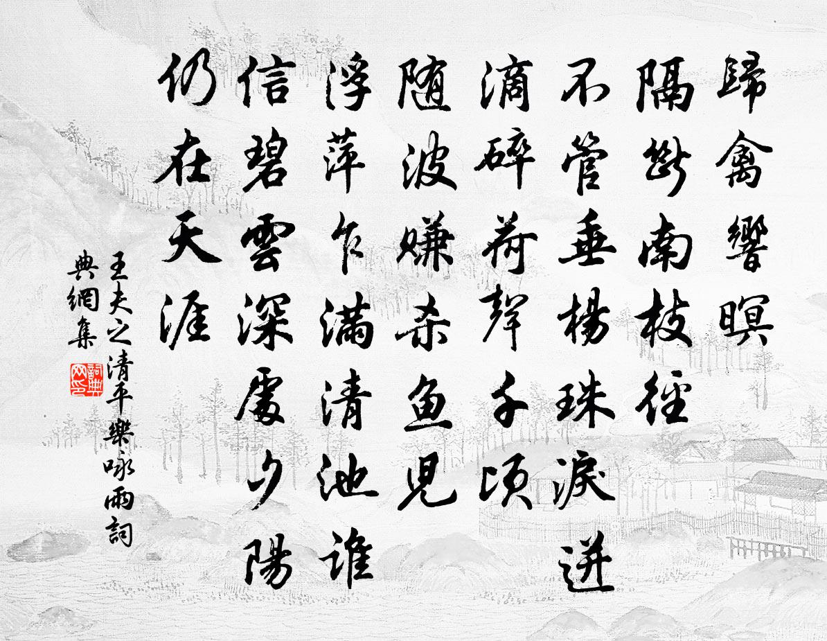 詩詞名句歷史字典書法欣賞書法字典國語詞典說文解字康熙字典古漢語字典標 題 作 者 詩 句 清平樂 詠雨作者:王夫之 朝代:清代清平樂 詠雨原文歸禽響暝。隔斷南枝徑。不管垂楊珠淚迸。滴碎荷聲千頃。 隨波賺殺魚兒。浮萍乍滿清池,誰信碧雲深處,夕陽仍在天涯。詩詞問答問:清平樂 詠雨的作者是誰?答:王夫之問:清平樂 詠雨寫於哪個朝代?答:清代問:清平樂 詠雨是什麼體裁?答:詞王夫之清平樂 詠雨書法欣賞清平樂 詠雨書法作品注釋暝:指空漾灰暗的天色。賺殺:賺煞。意謂逗煞。言雨滴水面,魚兒疑為投食,遂被賺接喋。詩文賞析這哪裡是在詠雨,分明是詞人撫世傷心的熱淚!過片假寫池中魚兒,罵盡天下隨波逐流浮沉之輩。結句既是富有哲理的人生感悟,更是對世態炎涼的深沉感喟。顧炎武曾有“亡國”與“亡天下”之辨,這首詞即為“亡天下”之音。 詩詞推薦感遇十首次韻和黃著作魯直以將窮山海跡勝絕晁補之〔宋代〕楚有吹竹者,工作百獸音。削格為爾多,滔滔寧適今。嘗俾范馳驅,終日無一禽。復之儻或可,詭遇亦何心。送君范到上溪頭陳著〔宋代〕老來多病腳蹣跚,不覺追行一里寬。歸去閉門還靜坐,世途步步是邯鄲。游近村陸游〔宋代〕被發行歌雪滿膺,夕陽顧影亂鬅鬙。乞漿得酒人情好,賣劍買牛農事興。社鼓賽秋聞坎坎,塔燈照夜望層層。歸來寄家子震寺丞韓維〔宋代〕商山不可極,跨壓梁與秦。地產富靈藥,岩棲多異人。子才老不用,一邑聊庇身。方將斂餘間,煉丹駐形神。訪道七十翁吟七言十首方回〔宋代〕幼孤何敢事兒嬉,聞道惟慚性鈍遲。早尚虛文迷釋老,晚參實學溯濂伊。五更燈火芸千卷,兩世冠裳桂一枝。夢幻園鶴游九言〔宋代〕擲米不盈掬,群雀下階除。昂昂圃中鶴,飯糗不可呼。嬉翔白雲外,飲啄春山隅。日淡煙水鄉,風曬翎羽舒。群雞昭君怨 梅花鄭域〔宋代〕道是花來春未,道是雪來香異。竹外一枝斜,野人家。冷落竹籬茅舍,富貴玉堂瓊榭。兩地不同栽,一般開。北風吹于謙〔明代〕吹我庭前柏樹枝。樹堅不怕風吹動,節操稜稜還自持,冰霜歷盡心不移。況復陽和景漸宜,閒花野草尚葳蕤,風吹問梅宋伯仁〔宋代〕痴風袞袞送寒來,竹裹人家總未開。唯有老岩心事苦,瘦筇敲雪問梅腮。重送呂知錄表叔蘇泂〔宋代〕別味中年畏,離筵近日頻。青山千騎遠,綠樹一蟬新。典獄須吾表,窮涯亦我民。時因過周守,相與話推仁。宮詞王珪〔唐代〕石刻蛟螭扶繡柱,金盤龍鳳走雕楹。萬年枝上流鶯囀,屏掩春山夢不成。戲書蘇軾〔宋代〕五言七言正兒戲,三行兩行亦偶爾。我性不飲只解醉,正如春風弄群卉。四十年來同幻事,老去何須別愚智。古人相逢行謝靈運〔南北朝〕行行即長道。道長息班草。邂逅賞心人。與我傾懷抱。夷世信難值。憂來傷人。平生不可保。陽華與春渥。陰柯長依韻和達觀禪師山中見寄梅堯臣〔宋代〕豶豕在塗龍在澤,豺狼食肉麝食柏。蹄毛與角不對齒,啄觜兩足副以翮。既能閒閒住深谷,豈使于于佩鳴玉。水邊萍鄉縣丞求頌釋印肅〔宋代〕杜門終日不通書,得意忘言總不拘。舉向世間人不會,妄談生死事區區。信香不昧和光爇,禍福皆心豈有殊。心本雨二首曾幾〔宋代〕秋冬久不雨,氣濁喜雲生。麥隴崇朝潤,茅檐徹夜聲。初來斷幽徑,漸密雜疏更。賴有牆陰薺,離離已可烹。和孔武仲金陵九詠其二覽輝亭蘇轍〔宋代〕城裡最高處,坡陀見一城。山多來有緒,江遠靜無聲。歌吹風前度,樓台雨後明。風光同楚蜀,聊此慰平生。次韻徐秀才十首陳造〔宋代〕閱世難衣食,眼中子能賢。萬像入吟筆,摹寫皆其天。蹇孑我荒學,一字不蘄傳。子家文章錄,得書或牽聯。次韻張提刑送行六絕洪咨夔〔宋代〕伊川去後幾多年,道在離堆沫水邊。身任茲文須著力,莫將人事屬之天。從主移西州寓直齋內霖雨不晴懷郡中游聚詩何遜〔南北朝〕寓直慚虎賁。沉迷豈職事。祈祈寒枝動。蒙蒙秋雨駛。不見眼中人。空想山南寺。雙桐傍櫩上。長楊夾門植。夙昔名句推薦魂來楓葉青,魂返關塞蒙杜甫《夢李白二首·其一》 舉觴酹先酒,為我驅憂煩。柳宗元《飲酒》 若有知音見采,不辭遍唱陽春。晏殊《山亭柳·贈歌者》 東門之楊,其葉牂牂。佚名《東門之楊》 柴門聞犬吠,風雪夜歸人。劉長卿《逢雪宿芙蓉山主人》 誰憐一片影,相失萬重雲?杜甫《孤雁 / 後飛雁》 多情卻被無情惱,今夜還如昨夜長。元好問《鷓鴣天·候館燈昏雨送涼》 看朱成碧思紛紛,憔悴支離為憶君。武則天《如意娘》 此已被私慾隔斷,不是知行的本體了。王陽明《傳習錄·卷上·徐愛錄》 纖雲弄巧,飛星傳恨,銀漢迢迢暗度。秦觀《鵲橋仙·纖雲弄巧》
