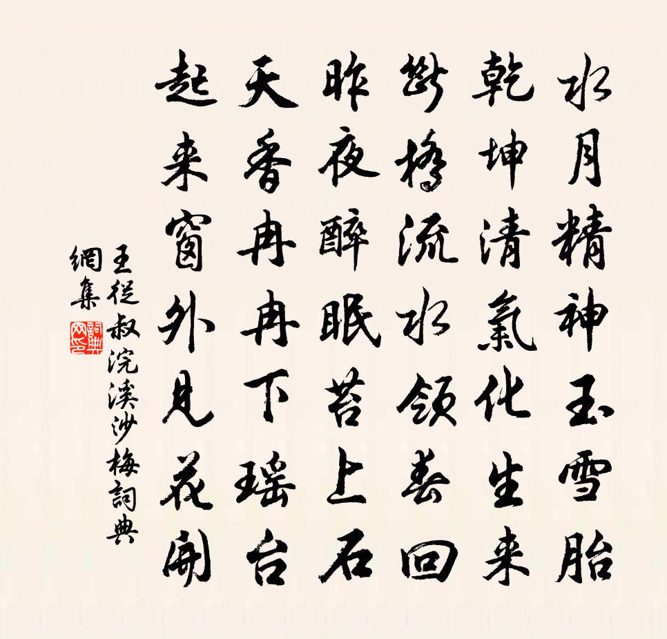詩詞名句歷史字典書法欣賞書法字典國語詞典說文解字康熙字典古漢語字典標 題 作 者 詩 句 浣溪沙(梅)作者:王從叔 朝代:宋代浣溪沙(梅)原文水月精神玉雪胎。乾坤清氣化生來。斷橋流水領春回。昨夜醉眠苔上石,天香冉冉下瑤台。起來窗外見花開。詩詞問答問:浣溪沙(梅)的作者是誰?答:王從叔問:浣溪沙(梅)寫於哪個朝代?答:宋代問:浣溪沙(梅)是什麼體裁?答:詞王從叔浣溪沙(梅)書法欣賞浣溪沙(梅)書法作品詩詞推薦薛老峰周朴〔唐代〕薛老峰頭三個字,須知此與石齊生。直教截斷蒼苔色,浮世人儕眼始明。贈相士丁日宣周文璞〔宋代〕張公謂余可神仙,薛顛謂余可英傑。丁生謂二皆無成,世間安有此奇絕。麒麟閣上冠貂蟬,龍虎鼎內治大丹。興來巳未春日山居雜興十二解楊萬里〔宋代〕金作林檎花絕穠,十年花少怨東風。即今遍地欒枝錦,不則梢頭幾點紅。偈頌十首釋德光〔宋代〕口似備盆呵佛祖,牙如劍樹罵諸方。而今死入阿鼻獄,看你如何孟八郎。贛士曾興宗字光祖以其居篔谷圖來求詩陸游〔宋代〕高人心虛萬物宗,家世常以仕易農。買山本愛坡上竹,手種已偃岩前松。瀑泉三伏凜冰雪,谷聲火里酣笙鏞。了知句徐良弼〔宋代〕青春不再汝知乎。詠未開牡丹贈李氏張浩〔宋代〕迎日香苞四五枝,我來恰見未開時。包藏春色獨無語,分付芳心更待誰。贈歌人武元衡〔唐代〕仙歌靜轉玉簫催,疑是流鶯禁苑來。他日相思夢巫峽,莫教雲雨晦陽台。經和靖林先生舊隱強至〔宋代〕獨行先生舊隱荒,大名寧受一棺藏。能詩秀骨應無朽,近冢閒花亦自香。捲軸門人收篋笥,歲時族子奉烝嘗。逸民垂老釋文珦〔宋代〕垂老飄零兩鬢華,重陽又復對黃花。明年決定謀歸去,免使禽猿有怨嗟。北征杜甫〔唐代〕皇帝二載秋,閏八月初吉。杜子將北征,蒼茫問家室。維時遭艱虞,朝野少暇日。顧慚恩私被,詔許歸蓬蓽。拜辭和子野四首仇遠〔宋代〕詭遇非吾事,支離笑我身。文章寧可拙,仕宦豈宜貧。鄉故多新鬼,年荒少佚民。休嗟華黍廢,陽穀易回春。訪吳式賢歸賦詩復以未用韻成篇如前數方回〔宋代〕秋仲已數晨,殘暑饕餘威。兩旬赫斯旱,歲事將告飢。五穀既不熟,百卉亦具腓。白露輟救田,巫祝絕禱祈。湍漭初離陳寄孫戶曹兄弟張耒〔宋代〕三年流落寓於陳,一命青衫淮水濱。城北橋邊長送別,扁丹今自作行人。贈仙居宰陳述古鄭穆〔宋代〕我愛仙居宰,接人推至誠。一官崖岸絕,百志惠慈生。清平樂·圖書一室周晉〔宋代〕圖書一室。香暖垂簾密。花滿翠壺熏研席。睡覺滿窗晴日。手寒不了殘棋。篝香細勘唐碑。無酒無詩情緒,欲梅欲江頭俞桂〔宋代〕漁浦山邊白鷺飛,西興渡口夕陽微。等閒更上層樓望,貪看江潮不肯歸。觀洛神圖慨然有作三首張嵲〔宋代〕殷勤遵渚饋明璫,情托微波事渺茫。油壁卻歸天上去,沙晴空見水禽翔。頌古四十四首釋法泰〔宋代〕風前露出無瑕璧,室內擎將如意珠。兩度獻渠渠不識,可憐流落在江湖。鷓鴣天石孝友〔宋代〕收拾眉尖眼尾情。夜來真箇夢傾城。鴛鴦有底情難盡,蝴蝶無端夢易驚。愁一掬,月三更。繡幃應好睡輕盈。知他名句推薦朔風如解意,容易莫摧殘。崔道融《梅花》 風鳴兩岸葉,月照一孤舟。孟浩然《宿桐廬江寄廣陵舊遊》 仁者愛萬物而智者備禍於未形,不仁不智,何以為國?司馬遷《史記·趙世家》 怕歌愁舞懶逢迎。妝晚托春酲。陸游《朝中措·代譚德稱作》 居移氣,養移體。孟子《孟子·盡心章句上·第三十六節》 往事思量一晌空,飛絮無情,依舊煙籠。夏完淳《一剪梅·詠柳》 非得賢之難,用 之難。非用之難,信之難。房玄齡《晉書·列傳·第二十二章》 奈南牆冷落,竹煙槐雨。吳文英《惜秋華·七夕前一日送人歸鹽官》 死生驚懼不入乎其胸,是故忤物而不懾。列子及其弟子《列子·黃帝》 月照城頭烏半飛,霜淒萬樹風入衣。李頎《琴歌》