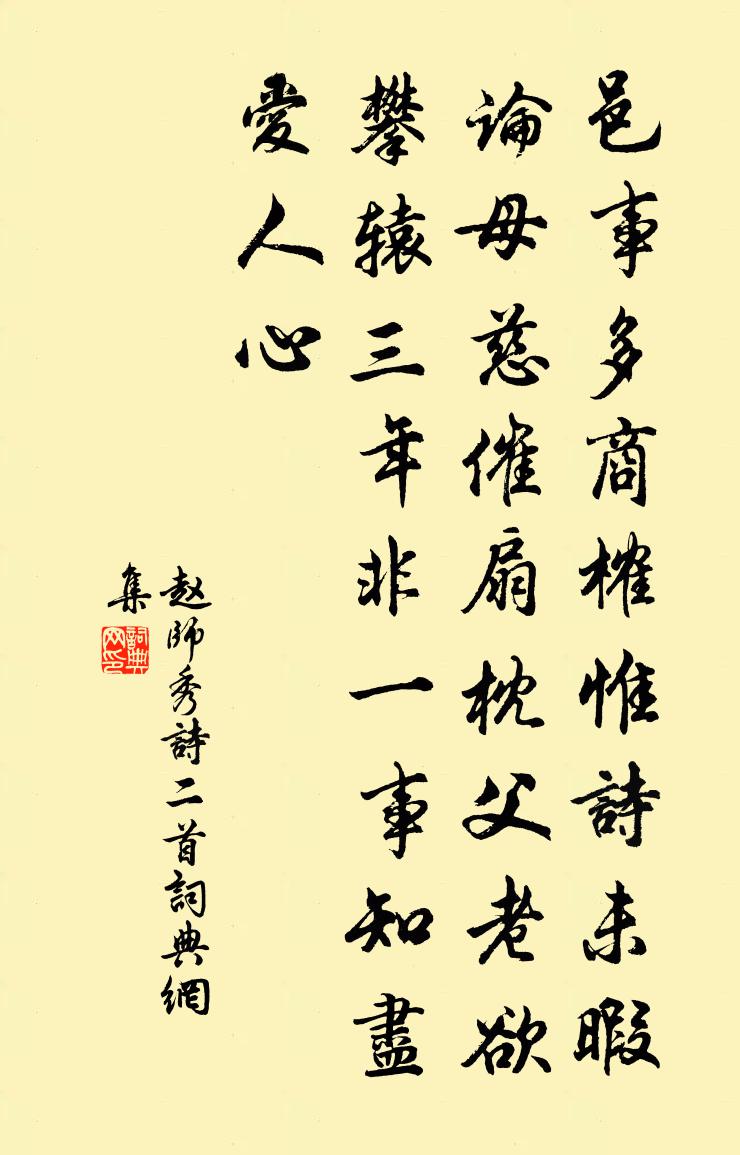 詩詞名句歷史字典書法欣賞書法字典國語詞典說文解字康熙字典古漢語字典標 題 作 者 詩 句 詩二首作者:趙師秀 朝代:宋代詩二首原文邑事多商榷,惟詩未暇論。母慈催扇枕,父老欲攀轅。三年非一事,知盡愛人心。詩詞問答問:詩二首的作者是誰?答:趙師秀問:詩二首寫於哪個朝代?答:宋代趙師秀詩二首書法欣賞詩二首書法作品詩詞推薦句楊億〔宋代〕前瞰琵琶州,後枕思禪寺。觀八陣圖說岳珂〔宋代〕八陣初興黃帝時,貙劉在漢紀乘之。流形龍虎隨雷雨,定位鳥蛇分坎離。地以雲升高復下,天從風別正之奇。自然春社有感陸游〔宋代〕憔悴前朝白髮郎,祠庭賦祿玷恩光。寸心未與年俱老,萬事惟憑酒暫忘。穿仗兩曾觀揖遜,扶犁獨幸返耕桑。耆年品令呂渭老〔宋代〕繡衣未整。傍窗格、臨清鏡。新霜薄霧,這下幾日,陰晴不定。欲插黃花,心事又還記省。去年香徑。共粉蝶、閒風琴貫休〔唐代〕至境心為造化功,一枝青竹四弦風。寥寥雙耳更深後,如在緱山明月中。醉亭樓劉使君〔宋代〕平生性格,隨分好些春色。沉醉戀花陌。雖然年老心未老,滿頭花壓巾帽側。鬢如霜,須似雪,自嗟惻。幾個相知南樓令(戲次趙元父韻)周密〔宋代〕好夢不分明。楚雲千萬層。帶圍寬、愁損蘭成。玉杵玄霜才咫尺,青羽信、便沈沈。水調夜樓清。清宵誰共聽。砑晚望二首楊萬里〔宋代〕月是小春春未生,節名大雪雪何曾。夕陽不管西山暗,只照東山 * 棱。酬殷堯藩許渾〔唐代〕相如愧許詢,寥落向溪濱。竹馬兒猶小,荊釵婦慣貧。獨愁憂過日,多病不如人。莫怪青袍選,長安隱舊春。次韻王穉川客舍二首黃庭堅〔宋代〕五更歸夢常苦短,一寸客愁無奈多。慈母每占烏鵲喜,家人應賦扊扅歌。次韻知郡郎中應期喜雪強至〔宋代〕公將民欲達天心,瑞雪如期白晝陰。皓色恍疑霄宇接,濃寒都為歲華深。辭妍席右人雄贍,興盡溪邊客訪尋。鈴閣早發始興江口至虛氏村作宋之問〔唐代〕候曉逾閩嶠,乘春望越台。宿雲鵬際落,殘月蚌中開。薜荔搖青氣,桄榔翳碧苔。桂香多露裛,石響細泉回。抱葉酬顏對聞監稅釋紹嵩〔宋代〕地僻春來靜,孤山夕照余。深慚長者轍,新欠故人書。有酒招元亮,無人誦子虛。相從又相別,意緒各何如。觀音贊釋可湘〔宋代〕聲色海中,隨波發現。駕一葉之優曇,開普門之方便。洛伽山,慈悲岸,無十萬億國之遠。次韻子瞻賦雪二首蘇轍〔宋代〕點綴偏工亂鵠鴉,淹留欲解惱船車。乘春已覺矜餘力,聘巧時能作細花。僵雁墮鴟誰得罪,敗牆破壁若為家。天公雜劇·望江亭中秋切鱠關漢卿〔元代〕第一折(旦兒扮白姑姑上,雲)貧道乃白姑姑是也。從幼年間便舍俗出家,在這清安觀里做著個住持。此處有一女紅樓院應制(一作僧廣宣詩)沈佺期〔唐代〕紅樓疑見白毫光,寺逼宸居福盛唐。支遁愛山情謾切,曇摩泛海路空長。經聲夜息聞天語,爐氣晨飄接御香。誰謂公立煎茶之絕品以待諸友退皆作詩因附眾篇之強至〔宋代〕造化於草木,所與有薄厚。茶生天地間,建溪獨為首。南土眾富兒,一餅千金售。公立須南官,好居眾富右。俸錢水龍吟劉克莊〔宋代〕行藏自決於心,不消謀及門前客。平生慕用,著書玄晏,掛冠貞白。帝獎孤高,別加九錫,一筇雙屐。更賜之車服又上後園山腳杜甫〔唐代〕昔我游山東,憶戲東嶽陽。窮秋立日觀,矯首望八荒。朱崖著毫髮,碧海吹衣裳。蓐收困用事,玄冥蔚強梁。逝水名句推薦黃葉仍風雨,青樓自管弦。李商隱《風雨》 況故人新擁,漢壇旌節。辛棄疾《滿江紅·漢水東流》 漸紅濕杏泥,愁燕無語。吳文英《掃花游·西湖寒食》 弱水三千,我只取一瓢飲。曹雪芹《紅樓夢·第九十一回》 擬泛煙中片葉,但兩湖佳處,任風吹泊徐燦《念奴嬌·西湖雨感次素庵韻》 暗相思,無處說,惆悵夜來煙月。韋莊《應天長·別來半歲音書絕》 不知而自以為知,百禍之宗也。呂不韋《呂氏春秋·覽·有始覽》 村北村南布穀忙,村前村後稻花香。方向《詠儋耳二首》 斜陽外,寒鴉萬點,流水繞孤村。秦觀《滿庭芳·山抹微雲》 痴男怨女,可憐風月債難償。曹雪芹《紅樓夢·第五回》