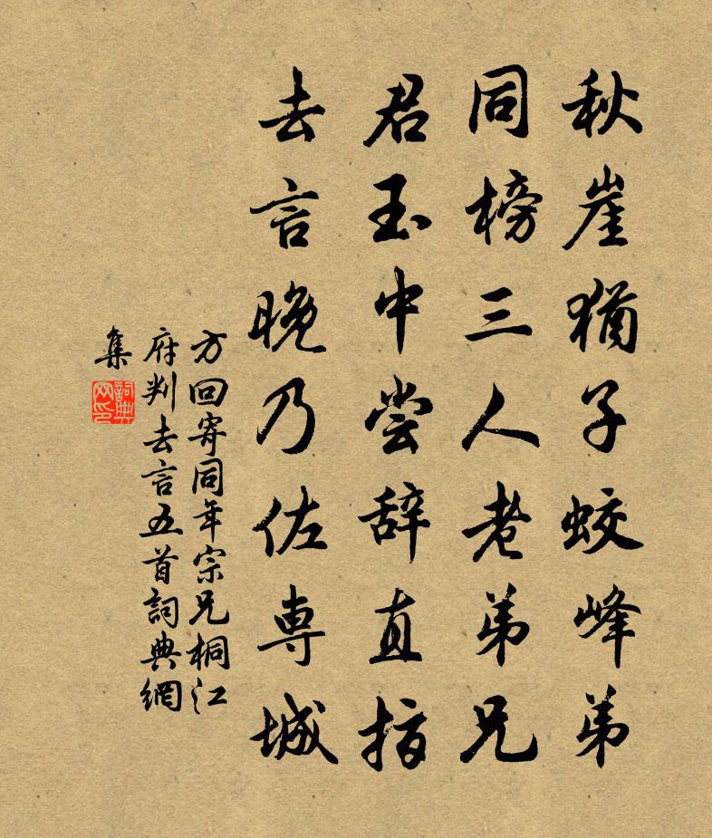 詩詞名句歷史字典書法欣賞書法字典國語詞典說文解字康熙字典古漢語字典標 題 作 者 詩 句 寄同年宗兄桐江府判去言五首作者:方回 朝代:宋代原文秋崖猶子蛟峰弟,同榜三人老弟兄。君玉中嘗辭直指,去言晚乃佐專城。詩詞問答問:《寄同年宗兄桐江府判去言五首》的作者是誰?答:方回問:該詩寫於哪個朝代?答:宋代書法欣賞寄同年宗兄桐江府判去言五首書法作品詩詞推薦范參軍輓詞張耒〔宋代〕力學志不就,多才宦可嗟。生平叔知己,身後婦成家。溫洛新阡茂,東吳慶系賒。功名付兒子,文史舊生涯。六月二十四日病起,喜雨聞鶯,與大兒議秋涼楊萬里〔宋代〕暑氣朝來掃地空,南風畢竟讓西風。秋生楚尾吳頭外,涼殺天涯地角中。萬疊山連千澗水,雙行纏伴一郫筒。初程偈二首釋證悟〔宋代〕寄語江西老古錐,從教日炙與風吹。兒孫不是無料理,要見冰消瓦解時。挽許秋浦馬廷鸞〔宋代〕青門何在從瓜孰,玉水難忘對竹喔。政復安車裹輪好,情知老子不婆娑。呂郎治先以職事至常山縣不敢越境以書致兩郡曾幾〔宋代〕子到常山縣,饒陽有敝廬。相望百里地,空得數行書。睡思茶料理,愁懷酒破除。新秋即在眼,過我定何如。奉使契丹二十八首 神水館寄子瞻兄四絕〈十蘇轍〔宋代〕少年病肺不禁寒,命出中朝敢避難。莫倚皂貂欺朔雪,更催靈火煮鉛丹。寄題宮師相公宴息園宋祁〔宋代〕相公納衡樞,卜築來東里。恤他匪足尚,自適乃雲美。中園興夷爽,薄言謝朝市。壤石非遠遷,松竹皆故蒔。絳蘤賈誼論蘇軾〔宋代〕非才之難,所以自用者實難。惜乎!賈生,王者之佐,而不能自用其才也。 夫君子之所取者遠,則必有所待;郡事多冗命繩翁拉彥翔則明德素游趙園彥翔歸程公許〔宋代〕世溷溷爭捷徑,發種種不勝簪。款門恰來石友,倚檻同觀玉岑。雨後至近村陸游〔宋代〕夜雨曉方止,朝雲猶作陰。山餘一寸碧,溪長半篙深。臥泛白鷗渚,行穿黃葉林。老農能共語,真率會人心。白蓮黃庚〔宋代〕泰華峰頭種,移根植野塘。一池秋夜月,萬柄曉天霜。西帝羅青蓋,真妃逞素狂。鷺飛無認處,點點水雲鄉。王庵和劉府教釋紹曇〔宋代〕鹿眠芳草印春庭,月掛蘿窗曉半扃。白髮老僧偏愛客,忍寒同看換鵝經。酬萬年張郎中見寄姚合〔唐代〕貢籍常同府,周行今一時。諫曹誠已忝,京邑豈相宜。黑髮年來盡,滄江歸去遲。何時得攜手,林下靜吟詩。使風梅堯臣〔宋代〕胯下橋南逆水風,十幅蒲帆彎若弓。淮波帶日魚鱗紅,岌岌飛上北斗中。龜山始撞人定鍾,岸草澀澀鳴秋蟲。瓜步阻風孔武仲〔宋代〕昨日焚香謁聖母,青衫鞠躬如負弩。但乞天開萬里明,掃去浮雲戢風雨。謂宜言發即音報,豈知神不聽我語。門前一百五日官舍作宋祁〔宋代〕晉歌本自傳幽憤,楚俗緣何作勝游。宴豆雕文夸瀹卵,俠場星影斗飛毬。光翻蘋吹都無力,暖著花煙不肯流。擣杏前緩聲歌沈約〔南北朝〕羽人廣宵宴。帳集瑤池東。開霞泛彩靄。澄霧迎香風。龍駕出黃苑。帝服起河宮。九疑轥煙雨。三山馭螭鴻。玉鑾和毛君州宅八詠 磨劍池蘇轍〔宋代〕神仙鑄劍本無硎,岸古班班尚鐵銼。天上少年仍狡獪,不須還爾對方平。別蘄春王判官裴夷直〔唐代〕四十年來真久故,三千里外暫相逢。今日一杯成遠別,煙波眇眇恨重重。江行第八十八文天祥〔宋代〕連山暗烽燧,川谷血橫流。揮淚臨大江,上有行雲愁。名句推薦謝公宿處今尚在,淥水蕩漾清猿啼李白《夢遊天姥吟留別/夢遊天姥山別東魯諸公》 聽人以言,樂於鐘鼓琴瑟。荀子《荀子·非相》 記年時、舊宿淒涼,暮煙秋雨野橋寒。吳文英《霜花腴·重陽前一日泛石湖》 國無義,雖大必亡;人無善志,雖勇必傷。劉安及其門客《淮南子·主術訓》 反聽之謂聰,內視之謂明,自勝之謂強。司馬遷《史記·商君列傳》 雲物不殊鄉國異,教兒且覆掌中杯。杜甫《小至》 寂寞深閨,柔腸一寸愁千縷。李清照《點絳唇·閨思》 當時父母念,今日爾應知。白居易《燕詩示劉叟》 一曲高歌一樽酒,一人獨釣一江秋。王士禎《題秋江獨釣圖》 青山一道同雲雨,明月何曾是兩鄉。王昌齡《送柴侍御》