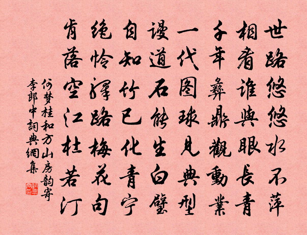 詩詞名句歷史字典書法欣賞書法字典國語詞典說文解字康熙字典古漢語字典標 題 作 者 詩 句 和方山房韻寄李郎中作者:何夢桂 朝代:宋代和方山房韻寄李郎中原文世路悠悠水不萍,相看誰與眼長青。千年彝鼎觀動業,一代圖球見典型。謾道石能生白璧,自知竹已化青寧。絕憐驛路梅花句,肯落空江杜若汀。詩詞問答問:和方山房韻寄李郎中的作者是誰?答:何夢桂問:和方山房韻寄李郎中寫於哪個朝代?答:宋代何夢桂和方山房韻寄李郎中書法欣賞和方山房韻寄李郎中書法作品詩詞推薦頌古三十一首釋如本〔宋代〕特來設粥夸英俊,那知王老更風流。打破粥鍋呈醜拙,狸奴白牯一齊收。生查子晏幾道〔宋代〕金鞭美少年,去躍青驄馬。牽繫玉樓人,繡被春寒夜。訊息未歸來,寒食梨花謝。無處說相思,背面鞦韆下。秋夜陳與義〔宋代〕中庭淡月照三更,白露洗空河漢明。莫遣西風吹葉盡,卻愁無處著秋聲。到馬塍哭堯章蘇泂〔宋代〕花桉空空但滿塵,樂章起草遍窗身。孺人侍妾相持泣,安得君歸更肅賓。忠顯劉公輓詩四首張嵲〔宋代〕抗論中朝猶在耳,鳴弓仇敵已臨城。王都竟失金湯固,朝士方貪雀鼠生。慷慨一朝先奮節,華戎終占共知名。可惜寄子虡陸游〔宋代〕汝官南壽春,我居東會稽;疋馬護秋塞,兩犢翻春泥。淮天沙雁過,江村雪雲低。書來動半年,相望常愴淒。父子百年歌陸機〔魏晉〕三十時。行成名立有令聞。力可扛鼎志乾雲。食如漏巵氣如熏。辭家觀國綜典文。高冠素帶煥翩紛。酒將炙奈樂何輓趙秋曉陳庚〔宋代〕客至支筇出,俱雲步履強。禮猶尚筋力,病忍謂膏肓。此別終千古,相陪苦一霜。蕭蕭亭畔柳,回首重淒涼。水調歌頭 和韻送公李孝光〔元代〕酒酣肝膽露,把手共高歌。中年底用離別,作惡漸應多。春盡江頭苦雨,日暮風沙萬里,重俯大江沱。行李幾時發送衢州崔員外薛逢〔唐代〕笑分銅虎別京師,嶺下山川想到時。紅樹暗藏殷浩宅,綠蘿深覆偃王祠。風茅向暖抽書帶,露竹迎風舞釣絲。休指次虞仲房司馬送秋韻丁世昌〔宋代〕自入秋光能幾時,無端又賦別秋詩。夜長月冷蟲鳴急,天闊風高雁過遲。三徑黃花存舊節,半欄紅葉墮殘枝。往來送羅永年西歸二首楊萬里〔宋代〕梅莟蒼香邊蹈雪來,杏花雨裡帶春回。明朝解纜還千里,今日看花更一杯。虞主歌佚名〔宋代〕轉紫芝。指東都帝畿。愁霧裡、簫聲宛轉,輦路逶迤。那堪見、郊原芳菲。日遲遲。對列鳳翣龍旗。輕陰黯四垂。偈六十三首釋道寧〔宋代〕先賢垂範,流落人間。日久歲深,禪人不顧。語非玄妙,直透重關。畫瓶打破,淥水青山。莫訝報慈多冷淡,得盤頌古一百則釋正覺〔宋代〕君王底意語知音,天下傾誠葵藿心。掇出中原無價寶,不同趙璧與燕金。中原之寶呈興化,一段光明難定價。帝業頔上人索春間詩軸以臂疼未能錄去姑以偈語展鄭清之〔宋代〕轉盼湖山忽半年,春鶯啼處起秋蟬。詩囊未倒真成債,道眼相看總是禪。壯士不甘弓掛壁,病翁猶有筆如椽。少須和子西喜雨袁說友〔宋代〕戰龍捲水動詩兵,著語才非喜雨亭。但得雲粳香顆顆,不愁霜發短星星。秧針刺水輕浮綠,麥浪翻風半挾青。只願過大浪灘鄭克已〔宋代〕急浪吹飛雪,鳴稿破曉灘。異鄉人易老,行路古來難。玉露晨初濕,天河夜不乾。飄流雙鬢白,未有一枝安。次韻徐贊府蜚英八首方回〔宋代〕屏除呵殿少人知,隨馬囊詩更有誰。五百不來村落靜,自然生齒似螽斯。丘母太碩人臧氏輓詩二首楊萬里〔宋代〕行樂潘慈母,榮封衛碩人。金花五色誥,雨葉六番春。白露凋萱慘,青山拱木新。九齡真上壽,一子更名臣。名句推薦時光只解催人老,不信多情,長恨離亭,淚滴春衫酒易醒。晏殊《採桑子·時光只解催人老》 蕃甲鎖蛇鱗,馬嘶青冢白。李賀《塞下曲》 兵久則力屈,人悉則變生。范曄《後漢書·列傳·桓譚馮衍列傳上》 喃喃教言語,一一刷毛衣。白居易《燕詩示劉叟》 口之宣言也,善敗於是乎興左丘明《國語·周語·邵公諫厲王弭謗》 可惜一溪風月,莫教踏碎瓊瑤。蘇軾《西江月·頃在黃州》 不畏浮雲遮望眼,只緣身在最高層王安石《登飛來峰》 聽風聽雨過清明。愁草瘞花銘。吳文英《風入松·聽風聽雨過清明》 平生端有活國計,百不一試薶九京。黃庭堅《送范德孺知慶州》 誠者自成也,而道自道也。子思《中庸·第二十五章》