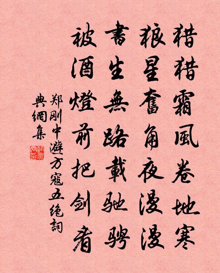 詩詞名句歷史字典書法欣賞書法字典國語詞典說文解字康熙字典古漢語字典標 題 作 者 詩 句 避方寇五絕作者:鄭剛中 朝代:宋代避方寇五絕原文獵獵霜風捲地寒,狼星奮角夜漫漫。書生無路載馳騁,被酒燈前把劍看。詩詞問答問:避方寇五絕的作者是誰?答:鄭剛中問:避方寇五絕寫於哪個朝代?答:宋代鄭剛中避方寇五絕書法欣賞避方寇五絕書法作品詩詞推薦頌古五十七首釋道昌〔宋代〕是兩頭語,未出泥水。非兩頭語,依前自死。振錫卓然。白日青天。風力還他敗壞時,漫天網生輝。折柳篇許景先〔唐代〕春色東來度渭橋,青門垂柳百千條。長楊西連建章路,漢家林苑紛無數。縈花始遍合歡枝,遊絲半罥相思樹。春樓寄朝宗二首吳芾〔宋代〕海棠已試十分妝,細看妖嬈更異常。不得與君同勝賞,空燒銀燭照花光。譏王黼宣和民謠〔宋代〕三百貫,且通判;五百索,直秘閣。溪山堂三首王阮〔宋代〕地勝年年別,人閒事事幽。水流縈檻角,山奮入簾鈞。舊好空馳馬,新盟但狎鷗。故人紼得路,何日共茲游。宴桃源/如夢令王之道〔宋代〕風急柳花飛驟。白盡千林萬岫。樵擔晚來歸,正在棲鴉啼後。知否。知否。語到謝娘詩就。訪陶山寺石世英〔宋代〕深谷不易到,煙霞真勝游。翻身渺雲海,長嘯落滄洲。曙色楓林曉,天香桂子秋。更期南澗石,重約泛浮丘。卜運算元 飲酒不寫書辛棄疾〔宋代〕一飲動連宵,一醉長三日。廢盡寒暄不寫書,富貴何由得。請看冢中人,冢似當時筆。萬札千書只恁休,且進杯中長思仙 贈六曲社丁李張三道友馬鈺〔元代〕休哀人。休哀人。急急灰心哀自身。回頭結善因。早搜真。早搜真。營養身中神內神。功成禮洞賓。冬除夜書情盧延讓〔唐代〕兀兀坐無味,思量誰與鄰。數星深夜火,一個遠鄉人。雁翥天微雪,風號樹欲春。愁章自難過,不覺苦吟頻。和趙章泉見寄二首劉宰〔宋代〕先生人物眇應劉,千載詩亡獨泝流。五字還堪薦郊廟,一官何事老林丘。章泉樂處知何似,南澗良朋亦健不。欲拜木蘭花慢 次韻陳見心文學孤山問梅張翥〔元代〕壓西湖千樹,曾幾度,為攜尊。向柳外停橈,苔邊待鶴,酒熟詩溫。瀛洲舊時月色,悵荒涼、惟有數枝存。天上梨寄帥初舒岳祥〔宋代〕寄語榆林戴,年來書不靈。翠微雙鬢白,茅舍一燈青。醉後窮豪在,吟成老健能。楊梅時節近,吾欲理行縢。月宮春(和吳尉)韓淲〔宋代〕柳嬌花妒燕鶯喧。斷腸空眼穿。一春風雨夜厭厭。不聞鐘鼓傳。香冷曲屏羅帳掩,園林誰與上鞦韆。憶得年時鳳枕寄超然居士釋慧遠〔宋代〕瀫水一言親領略,桐城千里重相聞。節角謠訛斬新句,不知居士與誰論。偈頌二十四首釋智遇〔宋代〕舊去新來懶送迎,岩間冢下見枯形。忍成殘臘半宵夢。儈地寒檠兩歲燈。和史君喜雨周南〔宋代〕蠶筐無葉不成眠,眯眼黃沙障麥天。誰遣爐煙生濕霧,立翻江水沃桑田。雹飛鄰壤同時事,春入民襦賴吏賢。欲把臨終辭眾偈釋元聰〔宋代〕來未嘗來,去未嘗去。七十四年,月印寒渚。謝送夏衣謝枋得〔宋代〕南州久客困炎歊,汗浥春衫上白毛。細葛含風常著看,此情猶勝舊綈袍。霜風王同祖〔宋代〕一夜霜風動地寒,塞垣火未報平安。嫦娥亦帶傷心色,為照征人尚抱鞍。名句推薦以陽求陰,苞以德也;以陰結陽,施以力也。王詡《鬼谷子·捭闔》 誠者自成也,而道自道也。子思《中庸·第二十五章》 屋上春鳩鳴,村邊杏花白。王維《春中田園作》 長簟迎風早,空城澹月華韓翃《酬程延秋夜即事見贈》 我欲穿花尋路,直入白雲深處,浩氣展虹霓。黃庭堅《水調歌頭·遊覽》 秋草獨尋人去後,寒林空見日斜時。劉長卿《長沙過賈誼宅》 新葉初冉冉,初蕊新霏霏。謝朓《詠落梅》 秋色從西來,蒼然滿關中。岑參《與高適薛據同登慈恩寺浮圖》 子貢之無諂,原思之坐弦,是賢人守貧窮之法。王永彬《圍爐夜話·第四九則》 湛湛長江去,冥冥細雨來。杜甫《梅雨》