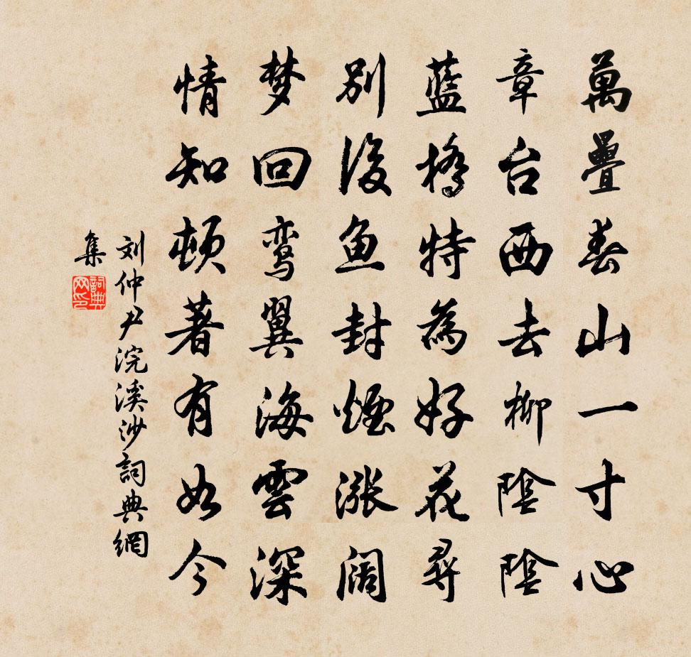 詩詞名句歷史字典書法欣賞書法字典國語詞典說文解字康熙字典古漢語字典標 題 作 者 詩 句 浣溪沙作者:劉仲尹 朝代:元代浣溪沙原文萬疊春山一寸心。章台西去柳陰陰。藍橋特為好花尋。別後魚封煙漲闊,夢回鸞翼海雲深。情知頓著有如今。詩詞問答問:浣溪沙的作者是誰?答:劉仲尹問:浣溪沙寫於哪個朝代?答:元代問:浣溪沙是什麼體裁?答:詞劉仲尹浣溪沙書法欣賞浣溪沙書法作品詩詞推薦禪人並化主寫真求贊釋正覺〔宋代〕天與之形,月皎河橫。地與之儀,山高水低。華燈連有據,桃李默成蹊。十方三世混不得,萬像森羅類莫齊。失調名仲殊〔宋代〕瀟瀟暮雨,梨花寒食。任元受耿時舉有和篇謹用韻寫寄阮閱〔宋代〕射策明光最上游,乾霄直氣接雲浮。平生所聞任定祖,十年堅臥岩壑幽。胸中經濟幾韜略,價高連城人不酬。急流越州歌二十首汪元量〔宋代〕賈廟巍巍盡敕封,秦齊兩國受恩同。木棉庵下無依鬼,合策麒麟第一功。次韻劉貢父從駕蘇轍〔宋代〕一經空記弟傳兄,舊德終慚比長卿。扈駕聯翩來接武,登科先後憶題名。竹林共集連諸子,棣萼相輝賴友生。它日訪何茂恭於南湖作三絕句喻良能〔宋代〕十里相望煙樹,旬月不絕籃輿。漱石枕流戲彩,浮家泛宅南湖。送人李建勛〔唐代〕相見未逾月,堪悲遠別離。非君誰顧我,萬里又南之。雨逼清明日,花陰杜宇時。愁看掛帆處,鷗鳥共遲遲。趙成父築亭上饒即用東里舊圃榜曰魚計葉適〔宋代〕秦僑洛寓隨南公,新條復欲無開封。亭名若有土斷法,鄭圃豈在章泉中。舊魚遙應化龍去,今魚且復波間住。人為金陵雜興二百首蘇泂〔宋代〕浪說思家不我聽,蕭齋閒對竹青青。若為解釋妻兒念,讀盡欒城道德經。別三十弟彥臣梅堯臣〔宋代〕朝辭都城裡,暮止汴堤頭。滿目非相親,寂默對河流。玉麟堂會諸司觀牡丹酴醾三絕范成大〔宋代〕洛園姚魏碧雲愁,風物江東亦上游。憶起遨頭八年夢,彭州花檻滿西樓。延福寺謝諤〔宋代〕閱世岩松古,隨人徑蘚斑。樓台去冉冉,沙石水潺潺。興出崎嶇外,身行杳靄間。通天知有路,一笑檻前山。句游九言〔宋代〕平生意思春風裡,信手題詩不用工。燭蛾孟郊〔唐代〕燈前雙舞蛾,厭生何太切。想爾飛來心,惡明不惡滅。天若百尺高,應去掩明月。贈何畫梅白玉蟾〔宋代〕一枝照夜向清寒,恍似孤山跂馬看。卻恐春風咎毛穎,泄池訊息貌他顏。和從駕登雲居寺塔詩庾信〔南北朝〕重巒千仞塔。危磴九層台。石關恆逆上。山樑乍斗回。階下雲峰出。窗前風洞開。隔嶺鐘聲度。中天梵響來。平時古意六首艾性夫〔宋代〕賤妾燕子身,銜泥巢君堂。遊子黃鵠志,辭家猶南翔。採花為誰容,襲蘭為誰香。安得小心風,寄子雙明璫。贈存古楊茂盛卿方回〔宋代〕捲軸年深碎破時,我能補苴以完之。驚逢大桁重華典,喜見由庚束皙詩。王會周篇汲郡冢,儒生秦頌泰山碑。裝潢羽林行鮑溶〔唐代〕朝出羽林宮,入參雲台議。獨請萬里行,不奏和親事。君王重年少,深納開邊利。寶馬雕玉鞍,一朝從萬騎。煌煌次韻何子應留詩為別王灼〔宋代〕周南底事苦淹留,杯水那容萬斛舟。穩駕長風歸去好,鳳凰池上醉遨遊。名句推薦十年種木,一年種穀,都付兒童。元好問《人月圓·重岡已隔紅塵斷》 春恨秋悲皆自惹,花容月貌為誰妍。曹雪芹《紅樓夢·第五回》 崑山玉碎鳳凰叫,芙蓉泣露香蘭笑。李賀《李憑箜篌引》 總是向人深處,當時枉道無情陸游《朝中措·代譚德稱作》 集韻增廣,多見多聞。佚名《增廣賢文·上集》 落葉人何在,寒雲路幾層。李商隱《北青蘿》 至言忤於耳而倒於心,非賢聖莫能聽韓非及後人《韓非子·難言》 君子不器。孔子弟子《論語·為政篇》 寧可正而不足,不可邪而有餘。佚名《增廣賢文·上集》 笑殺陶淵明,不飲杯中酒。李白《嘲王歷陽不肯飲酒》
