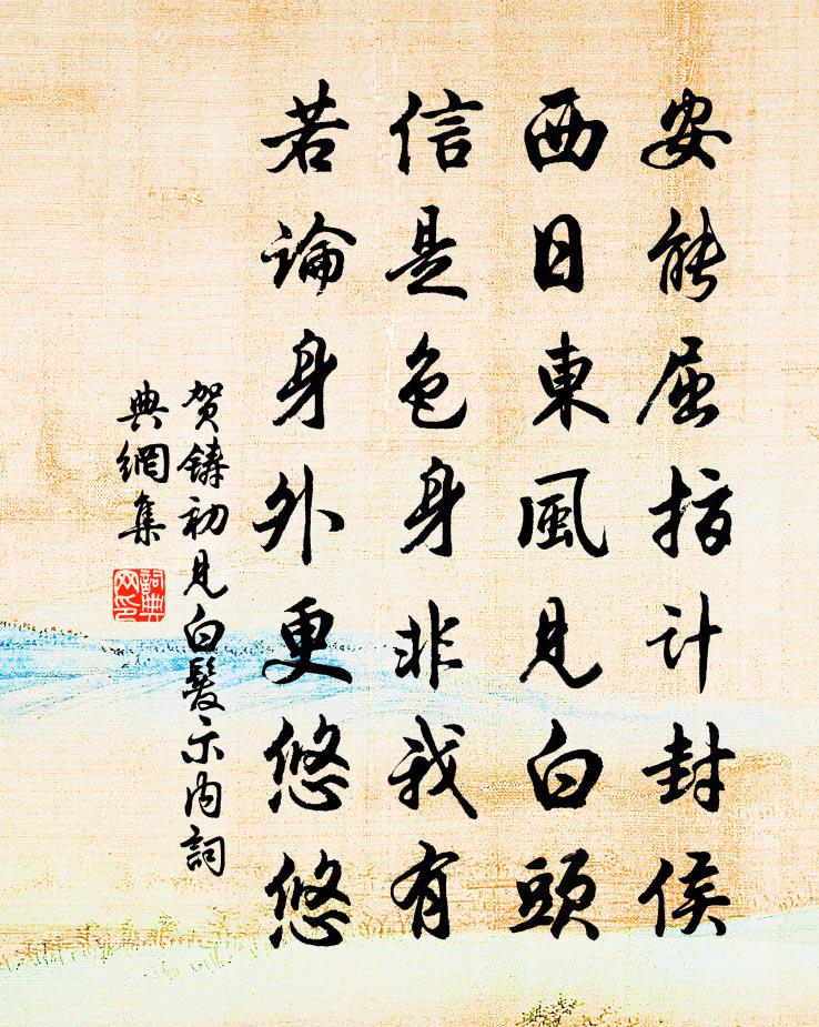 詩詞名句歷史字典書法欣賞書法字典國語詞典說文解字康熙字典古漢語字典標 題 作 者 詩 句 初見白髮示內作者:賀鑄 朝代:宋代初見白髮示內原文安能屈指計封侯,西日東風見白頭。信是色身非我有,若論身外更悠悠。詩詞問答問:初見白髮示內的作者是誰?答:賀鑄問:初見白髮示內寫於哪個朝代?答:宋代問:賀鑄的名句有哪些?答:賀鑄名句大全賀鑄初見白髮示內書法欣賞初見白髮示內書法作品詩詞推薦小雨樓鑰〔宋代〕好風先雨到危欄,卻送殘雲過別山。不用開襟強披拂,自然涼意滿人間。外孫黃相兒求寫送春三首並示陳著〔宋代〕相兒一揖笑嬉嬉,要寫酴醾架不詩。留取他年時展看,外家風景有當時。約桑守公肅同還剡中曹勛〔宋代〕生理空疏坐久閒,聊隨雲影下吳山。驅馳斗粟應憐我,勉強人情亦厚顏。濁酒淳漓元不較,梅花的皪欲同攀。行行余父子妻孥各在一方欲歸未得因感成詩傅察〔宋代〕皎皎明河漢,悠悠度女咎。賓士空歲月,南北尚淹留。所願各千里,此身兼白憂。如何有羽翼,來往亦遨遊。觀徐復州家書畫七首趙蕃〔宋代〕草衣舊識牡丹碑,字字騰拿更倔奇。我亦參軍成潦倒,愧無筆力欠渠詩。柳花董嗣杲〔宋代〕翠絲窣地裹晴綿,三月春空灞岸煙。四下葉蕃如吐雪,一隨風起欲漫天。池心直作浮萍化,墄齒多將缺蘚填。恨落十月十五夜對月陸游〔宋代〕離海月盈丈,寒光萬里明。眾星歛欲盡,一鏡獨徐行。重露滴松鬣,高風吹鶴聲。老來殊畏冷,不盡倚闌情。木蘭花慢 西虢作善者多,而感應屢至丘處機〔元代〕佇登臨曠望,涌雲氣,北山興。旋恍惚陰陽,虛無變化,寥廓充盈。奇峰狀如太華,靄*層、峻極染空青。急雨翻挽方粹岩仲二首劉克莊〔宋代〕上世師朱氏,慈闈祖艾軒。惓惓篡遺緒,歷歷識前言。柳記多先友,遷書賴外孫。悲哉此奇士,寂寞向寒源。寫懷釋行海〔宋代〕話別蘇堤第一橋,白頭孤客悵難消。山中蹈華皈來晚,只有青燈作寂寥。感皇恩賀鑄〔宋代〕歌笑見餘妍,情生眄睞。擁髻揚蛾黛。多態。小花深院,漏促離襟將解。惱人紅蠟淚。啼相對。芳草喚愁,愁來難九疊劉克莊〔宋代〕貴家選色斛量珠,洗盡鉛華絕代無。老子效顰聊復爾,名崑崙婢作瓊奴。頌古一百二十一首釋宗杲〔宋代〕馬駒喝下喪家風,四海從茲信息通。烈火焰中揮得月,巍巍獨天坐雄峰。勞停驛歐陽修〔宋代〕孤舟轉山曲,豁爾見平川。樹杪帆初落,峰頭月正圓。荒煙幾家聚,瘦野一刀田。行客愁明發,驚灘鳥道前。送王遷歸青社魏野〔宋代〕此別重傷情,寒天二十程。弟分微祿送,兒逐蹇驢行。雪蔽千山色,冰含萬水聲。何時再相見,去去海邊城。夏日小飲,分題得菱,用轆轤體楊萬里〔宋代〕不是齊堂觳觫生,如何雙觝獨崢嶸。犀中忽有紅尖角,天上也無甜底冰。只愛衣裳桃杏淺,誰知肌骨雪霜明。酒徒老人付宋汝為〔宋代〕憔悴應憐范叔寒,南北東西萬里謫。朱顏荏苒變黎黑,走遍天涯常是客。段都尉別業竇庠〔唐代〕曾識將軍段匹磾,幾場花下醉如泥。春來欲問林園主,桃李無言鳥自啼。藍田溪雜詠二十二首窗里山錢起〔唐代〕遠岫見如近,千里一窗里。坐來石上雲,乍謂壺中起。遺興曾鞏〔宋代〕青燈斗鼠窺寒硯,落月啼烏送迥笳。江漢置身貧作客,溪山合眼夢還家。夏憂忽忽丹心破,萬事悠悠兩鬢華。誰與名句推薦平明尋白羽,沒在石棱中。盧綸《和張僕射塞下曲六首》 江送巴南水,山橫塞北雲王勃《江亭夜月送別二首》 此時卻羨閒人醉,五馬無由入酒家。白居易《早冬》 不才明主棄,多病故人疏。孟浩然《歲暮歸南山 / 歸故園作 / 歸終南山》 不是冤家不聚頭,冤家相聚幾時休?馮夢龍《警世通言·卷二》 命將征西極,橫行陰山側。李白《塞上曲》 謀無主則困,事無備則廢。管仲《管子·霸言》 亂雲低薄暮,急雪舞迴風。杜甫《對雪》 志於道,據於德,依於仁,游於藝。孔子弟子《論語·述而篇》 求得人間成小會,試把金尊傍菊叢。晏殊《破陣子·燕子欲歸時節》