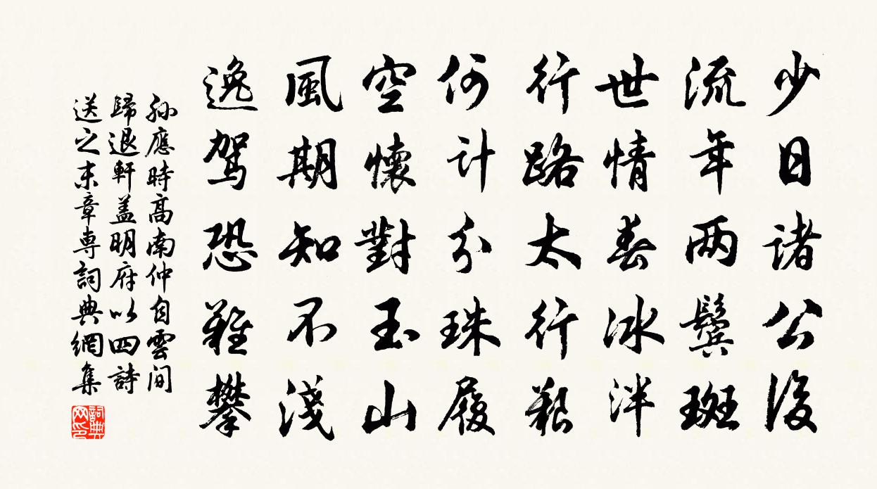 詩詞名句歷史字典書法欣賞書法字典國語詞典說文解字康熙字典古漢語字典標 題 作 者 詩 句 高南仲自雲間歸退軒蓋明府以四詩送之末章專作者:孫應時 朝代:宋代原文少日諸公後,流年兩鬢斑。世情春冰泮,行路太行艱。何計分珠履,空懷對玉山。風期知不淺,逸駕恐難攀。詩詞問答問:《高南仲自雲間歸退軒蓋明府以四詩送之末章專》的作者是誰?答:孫應時問:該詩寫於哪個朝代?答:宋代書法欣賞高南仲自雲間歸退軒蓋明府以四詩送之末章專書法作品詩文賞析【原題】:高南仲自雲間歸退軒蓋明府以四詩送之末章專以見及南仲索和遂次其韻詩詞推薦子駿運使八詠堂巽堂文同〔宋代〕華堂聳嚴台,地勢側隨水。高臨巽宮上,其取名以是。峨峨寶峰頂,日影正辰已。繚棧入雲林,詰屈如篆字。輕霏游南山汪莘〔宋代〕山蹊黃葉從過滿,石案蒼苔不用除。壇上古松岩畔竹,切須留伴老僧居。送客南遷白居易〔唐代〕我說南中事,君應不願聽。曾經身困苦,不覺語叮嚀。燒處愁雲夢,波時憶洞庭。春畬煙勃勃,秋瘴露冥冥。蚊蚋行不上也哥哥邵定〔宋代〕青泥坡,一坡高一坡,毒蟒寄穴虎作窠。風酸日黯雲嵯峨,抵死欲上將如何。上頭莫有牡丹紫玉九袴帶,黃金千萬和書天慶觀賀秘監堂三首秦觀〔宋代〕史君平昔慕玄清,一到祠堂意一新。戶外黃冠應指點,公應便是謫仙人。次韻奉送李季言四首張元乾〔宋代〕我輩避讒過避賊,此行能飽即須歸。山川久有真訊息,世上從渠閒是非。胡澹庵招宴余鳳〔宋代〕稱藩割地竟何如,抗疏孤臣只索居。萬死不回三寸舌,千金空募一封書。醉中益抱蒙塵恨,夢裡猶呼和議愚。長腳題朝陽亭程珌〔宋代〕暉暉朝陽亭,亭前鍾阜青。岩險尚積雪,光彩浮初晴。亭下清溪水,滑流新泮冰。雙鳧知隨陽,亦逐流澌行。亭中偈頌一百六十首釋宗杲〔宋代〕山前一片閒田地,元來記得在。叉手叮嚀問祖翁,只為契券不分明。幾度賣來還自買,難為牙保人,為憐松竹引清頌古一百則釋正覺〔宋代〕廓然無聖,來機徑挺。得非犯鼻而揮斤,失不回頭而墮甑。寥寥冷坐少林,默默全提正令。秋清月轉霜輪,河淡斗浣溪沙徐俯〔宋代〕新婦磯邊秋月明。女兒浦口晚潮平。沙頭鷺宿戲魚驚。青箬笠前明此事,綠蓑衣底度平生。斜風細雨小舟輕。自警晃逈〔宋代〕清澄寂滅海,明淨涅槃天。到此方知樂,休躭濁睡眠。思平泉樹石雜詠一十首似鹿石李德裕〔唐代〕林中有奇石,仿佛獸潛行。乍似依岩桂,還疑食野苹。茸長綠蘚映,斑細紫苔生。不是見羈者,何勞如頓纓。宿牡羊二絕李流謙〔宋代〕古柳維舟帶暝陰,夜寒剪剪到衣棱。客中不覺年華換,小市人家已試燈。游靈岩寺韋應物〔唐代〕始入松路永,獨忻山寺幽。不知臨絕檻,乃見西江流。吳岫分煙景,楚甸散林丘。方悟關塞眇,重軫故園愁。聞鍾論俗十二首劉子翬〔宋代〕未須葺吾廬,且復修吾倉。求安當卜居,求飽當聚糧。營生力有限,先此計頗長。去年稻盈畦,避寇不得將。新芽自詠白居易〔唐代〕夜鏡隱白髮,朝酒發紅顏。可憐假年少,自笑須臾間。硃砂賤如土,不解燒為丹。玄鬢化為雪,未聞休得官。咄哉懷新亭四首張嵲〔宋代〕遠意在田疇,中園結茅屋。凍雨昨夜來,共欣春水足。次韻仇仁近至日方回〔宋代〕浪說春回地底陽,駝裘正怯北風涼。未來事甚雲難測,已老身無日再長。紫邏招魂千里雪,彤庭待漏五更霜。閒人山深釋文珦〔宋代〕山深寒易得,九月已蕭然。況是衰遲者,非同少壯年。玄裘如艾絮,禪榻藉蒲氈。童子燒枯葉,先教閟暖煙。名句推薦夜喧山門店,獨宿不安席。韋應物《聽嘉陵江水聲寄深上人》 欲把西湖比西子,淡妝濃抹總相宜。蘇軾《飲湖上初晴後雨二首·其二》 參軍春思亂如雲,白髮題詩愁送春歐陽修《春日西湖寄謝法曹歌》 一年最好,偏是重陽。吳文英《惜黃花慢·菊》 矮紙斜行閒作草,晴窗細乳戲分茶。陸游《臨安春雨初霽》 可憐今夜月,不肯下西廂。王庭筠《絕句·竹影和詩瘦》 遇酒且呵呵,人生能幾何!韋莊《菩薩蠻·勸君今夜須沈醉》 誰料同心結不成,翻就相思結。夏完淳《卜運算元·秋色到空閨》 憑高眺遠,見長空萬里,雲無留跡。蘇軾《念奴嬌·中秋》 時見歸村人,沙行渡頭歇。孟浩然《秋登蘭山寄張五》
