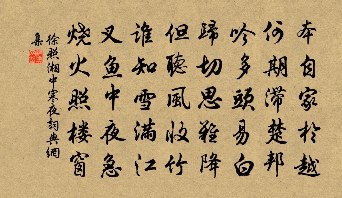 詩詞名句歷史字典書法欣賞書法字典國語詞典說文解字康熙字典古漢語字典標 題 作 者 詩 句 湘中寒夜作者:徐照 朝代:宋代湘中寒夜原文本自家於越,何期滯楚邦。吟多頭易白,歸切思難降。但聽風收竹,誰知雪滿江。叉魚中夜急,燒火照樓窗。詩詞問答問:湘中寒夜的作者是誰?答:徐照問:湘中寒夜寫於哪個朝代?答:宋代徐照湘中寒夜書法欣賞湘中寒夜書法作品詩詞推薦像維那寫老病阿師像請贊釋正覺〔宋代〕芙蓉之枝,丹山之兒。一絲聯自信,三昧約誰知。珊瑚寒月墮影,琥珀老松流滋。諸緣豁淨兮山空秋壯,萬態變通送兄弟還都至長葛河上四首舟中夜坐韓維〔宋代〕晴霜落波底,斗柄插堤外。扁舟燈火明,樽酒夜相對。臨歡意暫遣,念離心已痗。篙師喜冰拆,理楫事晨邁。題李公麟山莊圖其三華岩堂蘇轍〔宋代〕佛口如瀾翻,初無一正定。畫作正定看,於何是佛性。悟上人同過史氏隱居仇遠〔宋代〕經時少暇出郊遊,野曠山遙易見秋。只怪朝來多爽氣,似緣我輩是清流。荒台古井平蕪濕,斜日西風亂葉愁。莫笑偈頌一百零四首釋紹曇〔宋代〕未有清規,人能弘道。才涉典章,翻成機巧。華屋春風錦繡圍,草廬不見人高臥。啞,刻糞為香,是誰之過。木蘭花慢 送柳湯佐之覃懷總管任張野〔元代〕羨春風五馬,恨無計,駐征鞍。想膠漆真情,雲煙高興,詩酒清歡。當時與君年少,到而今、雙鬢總成斑。幾度批四月二十日客言兵所不至麥有黑蟲食之方回〔宋代〕望望遙峰外,行行茂樹中。愁添詩鬢白,旱覺戰塵紅。已嘆桑無繭,何期麥有蟲。南薰元不改,千古舜弦風。採桑行顧禧〔宋代〕日高高,蠶蠕蠕。蠶能衣被天下,不遑自保其軀。得歸劉克莊〔宋代〕叔夜形骸已不堪,安能扶曳事朝參。添千莖雪希臨鏡,省一條冰細署銜。續補亡詩存古意,廣崇有論矯清談。暮年憂國陸游〔宋代〕恩許還山已六年,誓憑耕稼餞華顛。養心雖若冰將釋,憂國猶虞火未然。議論孰能忘忌諱?人材正要越拘攣。群公秋日端居陳洎〔宋代〕暑退蚊雷靜,門閒雀到稀。露莎蛩自急,星樹鵲何依。井臼貧雖樂,溪山遠未歸。時情似秋雁,一一背寒飛。次韻和復古春日五絕句司馬光〔宋代〕家藏歌吹只西鄰,吹落梅花歌落塵。百葉桃開深院裡,輸它白髮有情人。高宗祀明堂前朝享太廟二十一首真宗〔宋代〕煌煌神武,再御開軒。時惠南土,旋定太原。車書混同,聲教布宣。維天佑之,億萬斯年。次韻章禹直魏道輔贈答之詩黃庭堅〔宋代〕我老面倦多故,面心期馬少游。願為春眠面,吐絲自綢繆。翩翩魏公子,閱世無全牛。吹噓鼓萬物,領袖傾九流。大雪不止再交前蔡戡〔宋代〕玄冥一怒天地黑,巽二前驅聲摵摵。須臾白帝振軒裳,龍鳳幡旂交委積。舊傳洛邑深丈余,今比常山才數尺。天公觀文殿學士趙公輓詞樓鑰〔宋代〕皇上初更化,追鋒語語溫。同看三老起,今嘆一身存。別久勞魂夢,人亡濺淚痕。從茲歸故隱,舊事與誰論。送顏平原岑參〔唐代〕天子念黎庶,詔書換諸侯。仙郎授剖符,華省輟分憂。置酒會前殿,賜錢若山丘。天章降三光,聖澤該九州。吾兄遇昭瑞宮次韻 其二王冕〔元代〕金屋無人玉殿開,青蒲埋沒遍莓苔。舊愁隱隱隨煙浪,新恨綿綿入草萊。紅葉已隨流水去,黃門空憶看華來。東南寒雨朝行視園樹杜甫〔唐代〕柴門雜樹向千株,丹橘黃甘此地無。江上今朝寒雨歇,籬中秀色畫屏紆。桃蹊李徑年雖故,梔子紅椒艷復殊。鎖石西山尋辛諤孟浩然〔唐代〕漾舟乘水便,因訪故人莊。落日清川里,誰言獨羨魚?石潭窺洞徹,沙岸歷紆徐。竹嶼見垂釣,茅齋聞讀書。款言名句推薦今宵絕勝無人共,臥看星河盡意明。陳與義《雨晴·天缺西南江面清》 夜深風竹敲秋韻,萬葉千聲皆是恨。歐陽修《玉樓春·別後不知君遠近》 願學秋胡婦,貞心比古松。李白《湖邊採蓮婦》 枝枝相糾結,葉葉競飄揚。李白《古意》 雨過橫塘水滿堤,亂山高下路東西。曾鞏《城南·雨過橫塘水滿堤》 知君慣度祁連城,豈能愁見輪台月。岑參《送李副使赴磧西官軍》 且夫有高人之行者,固見負於世;有獨知之慮者,必見驁於民。商鞅《商君書·更法》 秦中已久烏頭白,卻是君王未備知。李商隱《人慾》 佳游不可得,春風惜遠別。李白《登梅岡望金陵贈族侄高座寺僧中孚》 菊花何太苦,遭此兩重陽?李白《九月十日即事》