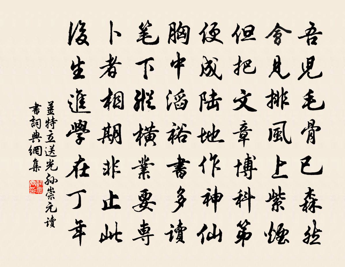 詩詞名句歷史字典書法欣賞書法字典國語詞典說文解字康熙字典古漢語字典標 題 作 者 詩 句 送光孫崇元讀書作者:姜特立 朝代:宋代送光孫崇元讀書原文吾兒毛骨已森然,會見排風上紫煙。但把文章博科第,便成陸地作神仙。胸中滔裕書多讀,筆下縱橫業要專。卜者相期非止此,後生進學在丁年。詩詞問答問:送光孫崇元讀書的作者是誰?答:姜特立問:送光孫崇元讀書寫於哪個朝代?答:宋代姜特立送光孫崇元讀書書法欣賞送光孫崇元讀書書法作品詩詞推薦張道士山房次程南仲韻楊公遠〔宋代〕丹房蕭灑絕纖埃,石逕縈紆闢草萊。窗外果從猿摘去,山中芝藉鶴銜回。一甌白雪湯輕注,三尺青蛇匣不開。如許送少隱兄赴興元幕張栻〔宋代〕出手寧嫌晚,論心本不欺。五年江左客,萬里故園裡。肯枉洞庭棹,來尋棠棣詩。固知名義重,豈但慰朝飢。送翼之過天台趙汝鐩〔宋代〕天台山水窟,人道是仙家。白鶴掛寒溜,赤城飛暮霞。獨攜筇杖過,莫畏石橋斜。牢記經行處,歸來向我夸。清明胡仲參〔宋代〕杯酒濃澆壠上春,東風吹起紙灰塵。可堪腸斷中原路,草掩芒丘不見人。昭亭潭上別梅堯臣〔宋代〕行舟晚解去,親戚各還家。淚落正濕衣,腸翻如轉車。借是昭亭水,相隨亦有涯。予今遊宦意,曾不學匏瓜。六祖贊釋道沖〔宋代〕七百高僧總會禪,眼空四海鼻遼天。黃梅若也無私曲,有甚衣盂到汝傳。奉和九月九日登慈恩寺浮圖應制張景源〔唐代〕飛塔凌霄起,宸游一屆焉。金壺新泛菊,寶座即披蓮。就日搖香輦,憑雲出梵天。祥氛與佳色,相伴雜爐煙。柳眉趙鸞鸞〔唐代〕彎彎柳葉愁邊戲,湛湛菱花照處頻。嫵媚不煩螺子黛,春山畫出自精神。草木雜詠五首枇杷宋祁〔宋代〕有果產西裔,作花凌蚤寒。樹繁碧玉葉,柯疊黃金丸。上都不可寄,咀味獨長嘆。觀音大士贊釋師範〔宋代〕提起數珠呈伎倆,無端弄出孩童相。何似月明霜滿天,孤猿啼斷千峰上。和子野四首仇遠〔宋代〕旅食無生計,卑棲奈若何。飯惟供脫粟,衣未補香莎。戶外履常滿,床頭金不多。老為文學掾,一似舊恩科。發白沙口次長蘆黃庭堅〔宋代〕篙師救首尾,我為制中權。掛席滿風力,如椎強弩弦。曉放白沙口,長蘆見炊煙。一葉托秋雨,滄江百尺船。反觀送永豐汪令羅椿〔宋代〕錦纜梅花浦,江南作縣歸。新來薦鶚牘,驚動袞龍衣。歲晚情難別,心親事卻違。恐君天上去,扶病出煙霏。過嶺蘇軾〔宋代〕暫著南冠不到頭,卻隨北雁與歸休。平生不作兔三窟,今古何殊貉一丘。當日無人送臨賀,至今有廟祀潮州。劍關摸魚子 題王德璉山居圖邵亨貞〔元代〕遍乾坤、好山無數,古來高隱能幾。相逢盡道林泉勝,無柰利名朝市。青嶂里。望曲徑深門,彷佛柴桑里。先生傲愚溪詩序柳宗元〔唐代〕灌水之陽有溪焉,東流入於瀟水。或曰:冉氏嘗居也,故姓是溪為冉溪。或曰:可以染也,名之以其能,故謂之染悼天童晦岩和尚釋普度〔宋代〕恩怨重重分未分,再來不見舊時人。娟娟宿鷺亭前月,忍照西風吹白苹。昝舍人錦江泛舟汪元量〔宋代〕舍人與客放船開,網得鯨魚餉酒杯。西川錦雀甜如蜜,錄事相分二百枚。從禮載酒要余及明叔游合普六首趙蕃〔宋代〕此君佳處是長身,靜繞吟行要日親。何事當前遽安障,未能忘俗遂忘真。終南山館汪元量〔宋代〕夜涼金氣轉淒其,正是羈孤不寐時。千古傷心南渡曲,一襟清淚北征詩。霜凝鞞鼓星橫劍,風卷旌旗月滿卮。旅雁名句推薦足不強則跡不遠,鋒不銛,則割不深。王充《論衡·卷十三·超奇篇》 紛披乍依迥,掣曳或隨風。李世民《詠興國寺佛殿前幡》 富觀其所與,貧觀其所取,達觀其所好,窮觀其所為王通《中說·卷二·天地篇》 朱弦已為佳人絕,青眼聊因美酒橫。黃庭堅《登快閣》 流年莫虛擲,華發不相容。方乾《送從兄郜 / 韋郜 / 途中別孫璐》 天下殆哉,岌岌乎。孟子《孟子·萬章章句上·第四節》 藥醫不死病,死病無藥醫。張南莊《何典·第三回》 綠葉素榮,紛其可喜兮。屈原《九章》 吳宮花草埋幽徑,晉代衣冠成古丘。李白《登金陵鳳凰台》 談歡則字與笑並,論戚則聲共泣偕劉勰《文心雕龍·誇飾》